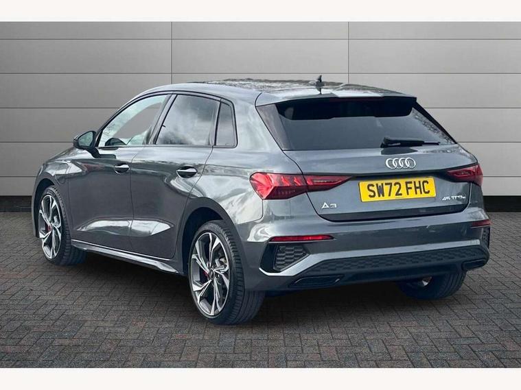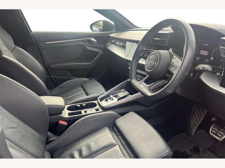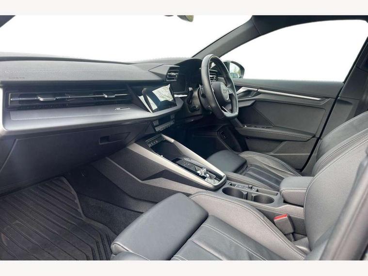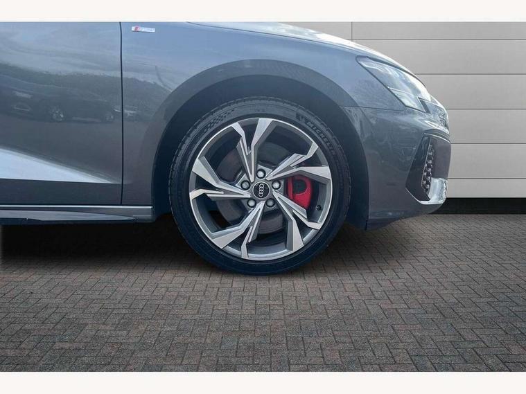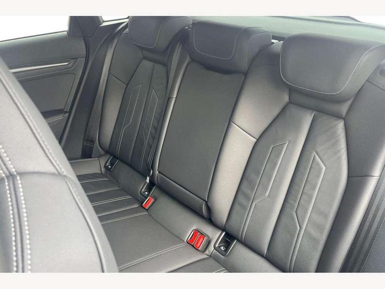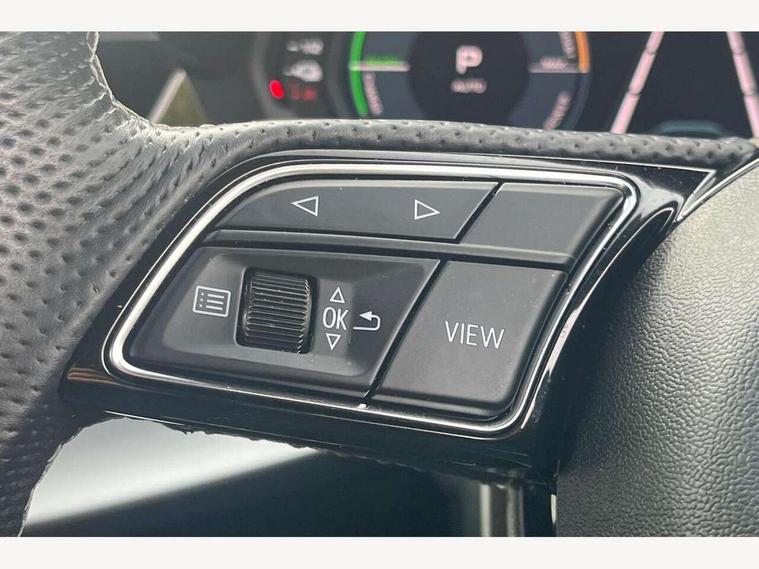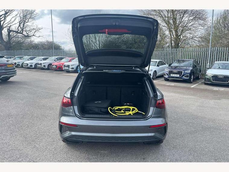 Audi drive select (Auto, Comfort, Dynamic, Efficiency and Individual), Audi smartphone interface, Audi Virtual Cockpit - 10.25" digital and colour instrument cluster, Automatic start/stop system with recuperation, Bluetooth interface, Collision avoidance assistant, e-Call (emergency call), Electromechanical power speed sensitive steering, Lane departure warning system, MMI Navigation Plus with high resolution 10.1" colour touch screen display, Service indicator, Trip computer, Voice control system with natural language interaction, 2.9 kW On-board charger, 3 pin 10 amp domestic charging cable, Standard suspension, Type 2 mode 3 32 amp charging cable, Type 2 socket for AC charging, 2xUSB-C connection with data and charging functions, 6 passive loudspeakers, DAB Digital radio, 3rd brake light, Acoustic glass windscreen, Aluminium window trim, Auto dimming frameless rear view mirror, Electrically adjustable/heated/folding/auto dimming door mirrors with integrated LED indications + kerb view function for passenger side, Front electric windows, Illuminated aluminium inserts front door sills with S logo, LED daytime running lights, LED headlights with LED rear lights and dynamic rear indicators, Light and rain sensors, Privacy glass - dark tinted rear window, rear door and side windows, Rear electric windows, Rear side air outlets in grained matt black, Rear side wing doors, Rear wiper, S line bumpers, S roof spoiler, 12V socket and storage compartment in front centre console, 3 seat bench in 2nd row, 40/20/40 split folding rear seat bench with cupholder, Black cloth headlining, Dual zone electronic climate control, Front and rear centre armrest in leather, Front and rear headrests, Front/rear floor mats, Height and reach adjustable steering wheel, Illuminated vanity mirror, Interior lighting - glove compartment light and right hand side, Luggage compartment floor covering, Manual boot compartment lid, Manually adjustable front seats, Seat side bolsters, Single front passenger seat, Stainless steel pedals and front footrest in black, Twin leather upholstery with front sports seats S embossed logo, Aluminium interior elements pack - A3 Sportback, Black styling pack - A3 Sportback, LED interior lighting pack - A3 Sportback, S line styling pack - A3 Sportback, 3x3 point rear seat belts, Audi pre sense front, Driver and front passenger airbag with passenger airbag deactivation, Electronic Stabilisation Control (ESC) including ABS, ASR and EDL, First aid kit with warning triangle and 2 safety vests, Front side airbags with head airbags and interaction airbag, Pre-sense front with pedestrian and cyclist detection, Red brake calipers, Seatbelt monitoring, Tyre pressure loss indicator, Anti theft alarm, Anti-theft wheel bolts, Electronically operated child lock, Immobiliser, Remote control central locking, Accent surfaces in the dashboard and centre console in platinum grey silk effect paint finish, Dark spectrum aluminium inlays, Tool kit, Tyre repair kit,