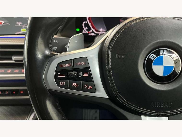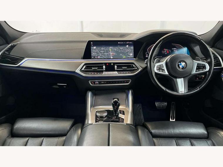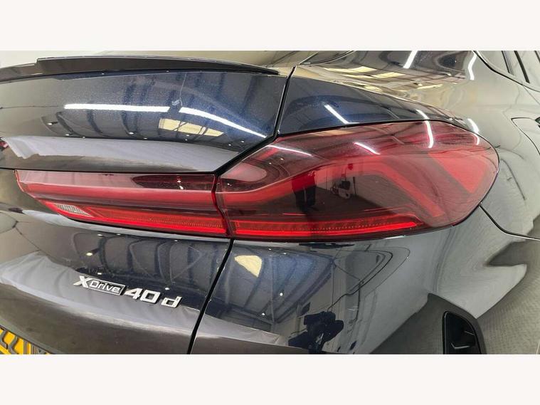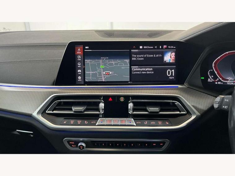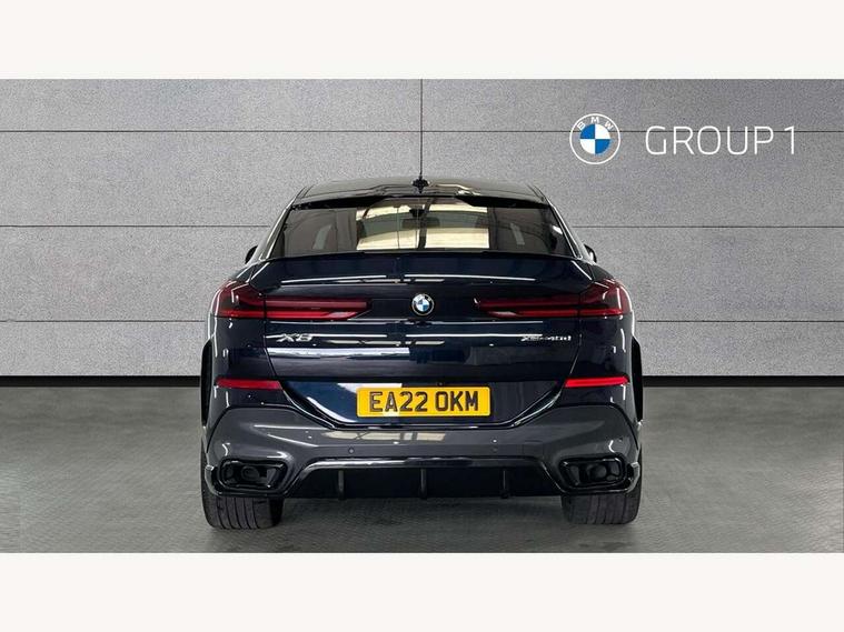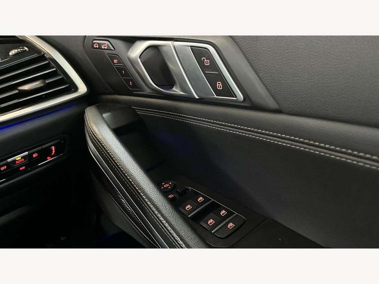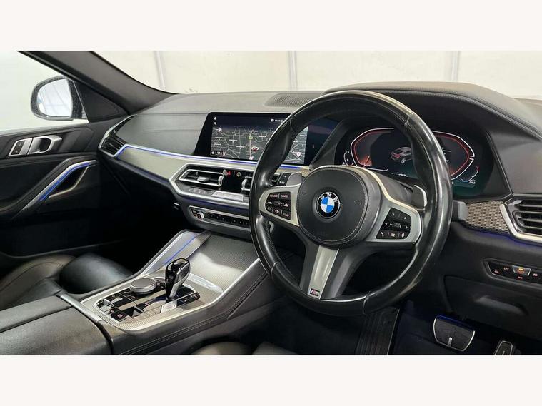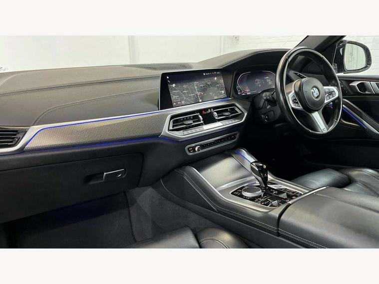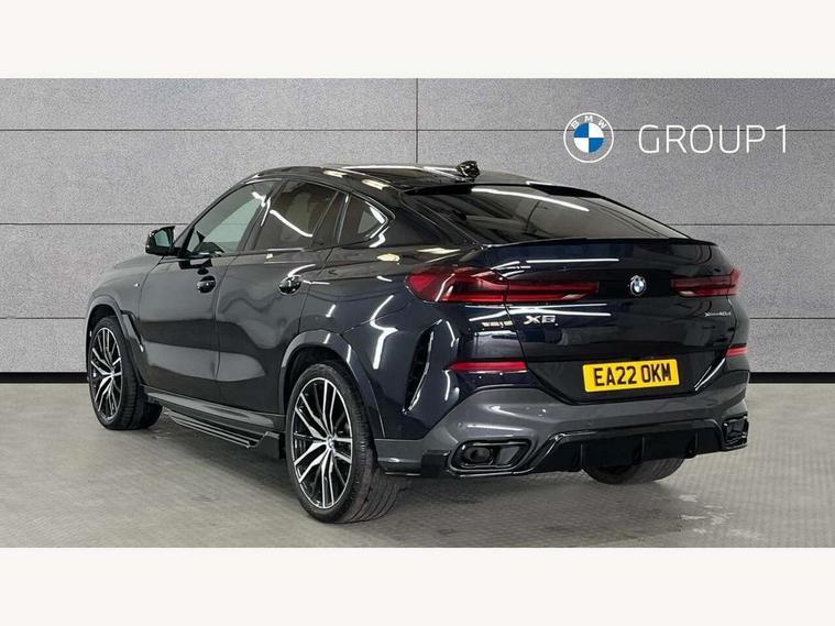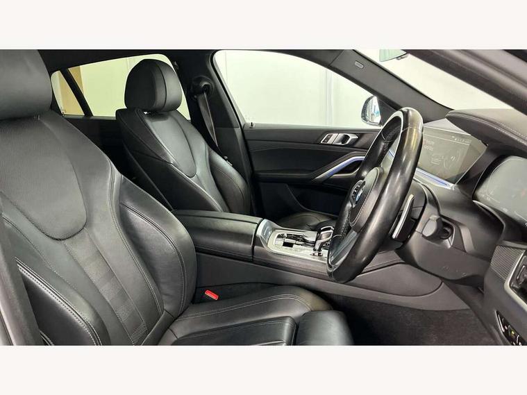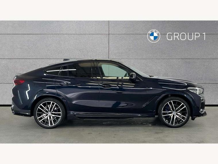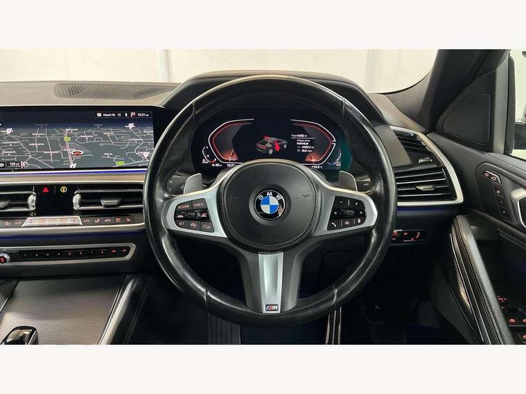 50GB hard disc drive (HDD) memory, Active guard plus, Attentiveness assist, Automatic tailgate two part with top hinged section open and manual bottom hinged section, BMW ConnectedDrive online services, BMW digital live cockpit professional - 12.3" digital instrument panel and 12.3" CID, with touch/voice command, BMW legal emergency call, BMW Teleservices, Brake force display, Brake pad wear indicator warning light, Cruise control with brake assist, Enhanced bluetooth with wireless charging, Front/rear park distance control (PDC), iDrive controller with shortcut buttons, Lights on warning, Oil sensor for level and grade, On board computer inc. average speed, fuel consumption, liquid crystal Info display, journey computer, outside temperature display, personal profile, Service interval indicator, Speed limit info display, Speed limiting function, Wifi hotspot preparation, 48V Mild hybrid technology, Diesel particulate filter, Double wishbone front axle, Drive performance control with ECO PRO comfort + sport mode, Eight speed steptronic sport automatic transmission and gearshift paddles on the steering wheel, Safety battery terminal clamp, Variable vane geometry, DAB Tuner enables digital radio reception, Favourite buttons, Hi-Fi loudspeaker system, USB connection, USB type A 1.5A in cupholder, USB Type C 3A in centre armrest, Active Air Stream kidney grille with high-gloss chrome, Adaptive air flap control bar in high-gloss black, Automatically dimming rear view mirror, BMW individual exterior line aluminium satinated window frame and window guide rail in front door/pillar trim/door mirrors in high gloss black, BMW Individual high gloss shadow line, Body colour bumpers, Body colour door handles, Dynamic brake lights with LED technology, Exhaust tailpipes - single, left and right with Chrome finisher, Follow me home headlight function, Front and rear electric windows with open and close fingertip control, anti trap facility and comfort closing, Heated windscreen washer jets, High beam assistant, High gloss black outer and central air intakes on front bumper with pearlescent chrome finish, High gloss black Side elements, LED daytime running lights, LED rear lights, M aerodynamic body styling, M designation on left and right front side panels, M Sport exhaust system, Rain sensor with automatic headlight activation and windscreen wiper control, Rear side wing doors, Satin aluminium side window graphic, Third brake light in rear spoiler, Welcome light carpet, X6 on left tailgate, xDrive designation on right tailgate, 12V - Power sockets with 2x centre console and 1x luggage compartment, 3 seat bench in 2nd row, 40:20:40 split folding rear seats, Centre and rear interior light, Child seat ISOFIX attachment with rear outer seats includes top tether, Compartment in front of cupholder, Electrical steering column with adjustable height and length with activation and control on the steering column, Foldable rear centre armrest with 2 cupholders and storage compartment, Front and rear cupholders x 2, Front and rear door pockets, Front and rear door sill inlays with illuminated BMW M designation, Front and rear side armrest integrated into door trim, Front reading lights, Light inside glove compartment, Lockable glove compartment, Luggage compartment floor panel with integral storage tray, Luggage compartment lighting, M specific key, M sport leather steering wheel, Make-up mirror lights, Multifunction controls for leather steering wheel, Multifunctional hooks, Rear head restraints, Seat back with flap pocket, Single front passenger seat, Storage tray and compartment with cover in centre console, Sunvisors with illuminated vanity mirrors, Toolkit located in luggage compartment, Velour floormats, Ambient light interior pack - X6, Connected Package Professional - X6, Expanded exterior mirror pack with electric folding door mirror - X6, Non-smokers pack - X6, 3 rear seatbelts, Airbags - driver/front passenger, rear and side, first and second row seats head airbags, front passenger seat airbag deactivation + knee airbag, Anti-lock braking system (ABS), Automatic Stability Control (ASC), Brake drying, Brake energy regeneration, Brake fade compensation, Braking pre-tensioning, Child proof locking system in rear door, Cornering brake control (CBC), Crash sensor activating central locking release, hazard warning lights, fuel cut off, interior lighting + activation of safety battery terminal clamp, Deformation zones - front and rear with door reinforcements and bumpers up to 2.5 mph, DSC - Dynamic Stability Control, Dynamic brake control, Dynamic Traction Control - DTC, Electromechanical parking brake with automatic drive away release and auto hold function, Electronic brake force distribution, Front and rear brake discs with interior ventilation, Front and rear seatbelts with seatbelt stopper, seatbelt tensioner for front and outer rear seats and belt force limiter, Front head restraints with anti-whiplash, Hill start assistant, Integrated brake system, M Compound brake in high gloss blue, M Sport braking system, Mechanical child proof lock on rear doors, Passive protection for pedestrians, Seat occupancy detection for driver and passenger side, Side impact protection, Two tone horn, Tyre pressure monitoring system, Warning triangle and first aid kit, Closing system with central locking, Driver and front passenger door centre lock switch, Locking wheel bolts, Thatcham 1 alarm system with remote control and engine immobiliser, Start/stop toggle diamond shaped trim finisher in pearl chrome,