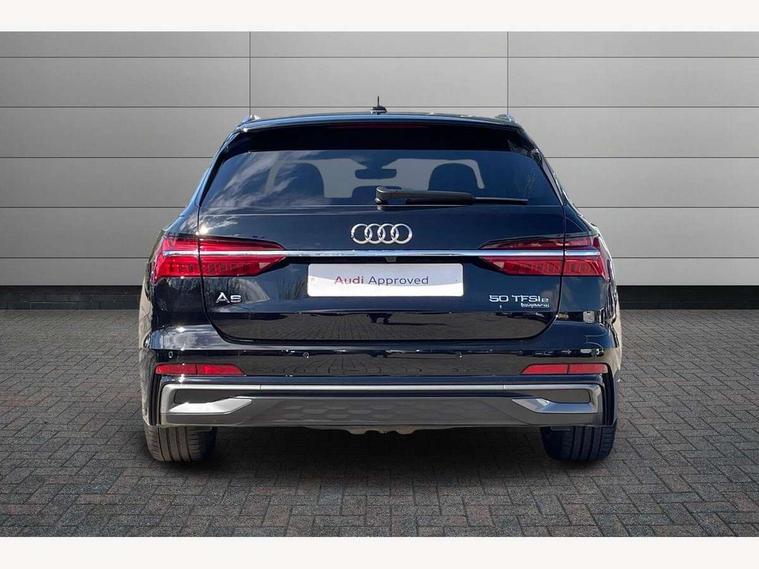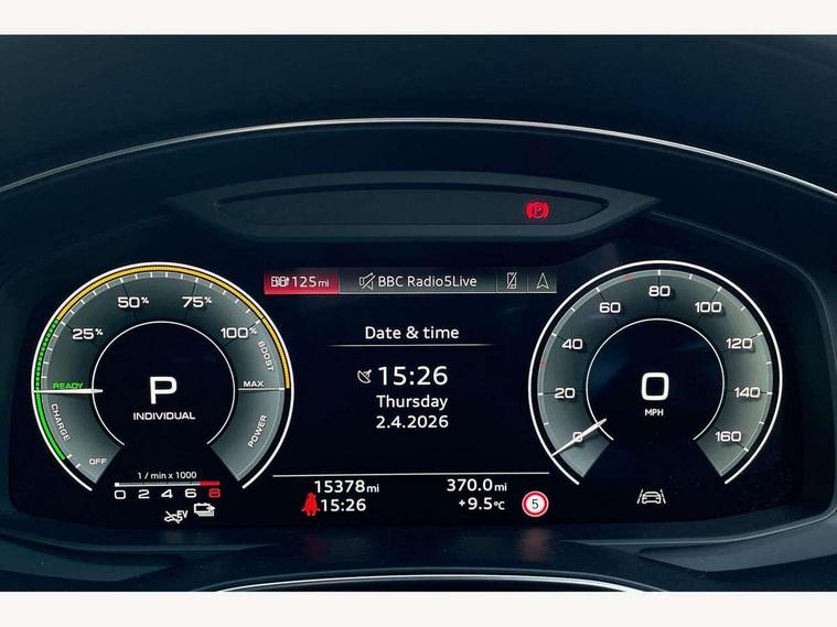 Audi connect safety and service (e-call), Audi connect with Amazon Alexa Integration, Audi drive select, Audi parking system plus - acoustic and visual park assist system for front and rear, Audi virtual cockpit, Automatic start/stop system with coasting functionality, Bluetooth interface, Camera based traffic sign recognition, Lane departure warning system, MMI navigation plus with 10.1" and 8.6" touch screens, Power operated tailgate, Progressive steering, Rear view camera, Service interval indicator, Smartphone interface includes wireless Apple carplay/Android Auto, Voice control system, 3 pin 10 amp domestic charging cable, 52 litre fuel tank, 7.4 kW onboard charger, Compact charging system, Hybrid propulsion system, Industrial connector CEE 32A, 230V, long and straight for the e-tron charging system, Mode 3 charging cable for public charging (AC), Sports suspension, Type 2 socket for AC charging, Audi front music interface, Audi sound system, Auxiliary input socket, DAB Digital radio, USB connection, Aluminium roof rails, Body colour rear roof spoiler, Body coloured door mirrors, Electric front/rear windows, Electrically adjustable heated and folding + automatically dimming exterior mirrors with memory function, Frameless auto dimming interior rear view mirror, Front intermittent wipers, Heat insulating darkened glass in side and rear windows, Heat insulating glass in windshield, LED rear lights with dynamic indicators, LED signature front daytime running light, LED third brake light, Matrix LED headlights, Matt black rear diffuser with diffuser strip and tailpipes in chrome, Matt black side air intake grille with inlay in matt aluminium, Privacy glass, Radiator grille in anthracite black matt, single frame in chrome and horizontal struts in matt aluminium silver, Rain and light sensors, Rear side wing doors, Rear wiper, 3 spoke high multi-function perforated leather steering wheel with contrast stitching and shift paddles, 4 zone deluxe automatic climate control, 40/20/40 split folding 3 rear seat bench in 3 parts with rear centre armrest, Audi phone box light, Black cloth headlining, Electrically adjustable front seats including seat height, fore/aft position, backrest angle and 4-way lumbar with memory for driver's seat, Front and rear floor mats, Front centre armrest, Front head restraints, Heated front seats, Height/reach adjust steering wheel, Illuminated door sill trims with S logo, Illuminated sun visors with vanity mirrors, Leather gear knob, Luggage compartment system, Rear headrests, Single front passenger seat, Stainless steel pedals and foot rest, Tool kit and car jack, LED Interior Ambient Lighting Pack - A6, Non smoking pack - A6, S line exterior style pack - A6, 3 point seatbelts on all seats, Airbags - Front side, front and rear including head, Audi pre-sense front, EBD - Electronic brakeforce distribution, Electromechanical parking brake, Electronic Stability Control (ESC) including ABS, ASR and EDL, Extended pedestrian protection measures, ISOFIX child seat mounting for front passenger seat and ISOFIX child seat mounting with Top Tether for outer rear seats, Manual child proof rear door locks, Seatbelt monitoring, Tyre pressure warning light, Warning triangle and first aid kit, Anti theft alarm with tow away protection, Anti-theft wheel bolts and wheel loosening detection, Immobiliser, Keyless Go, Remote central locking, Matt brushed aluminium inlays, Tyre repair kit,