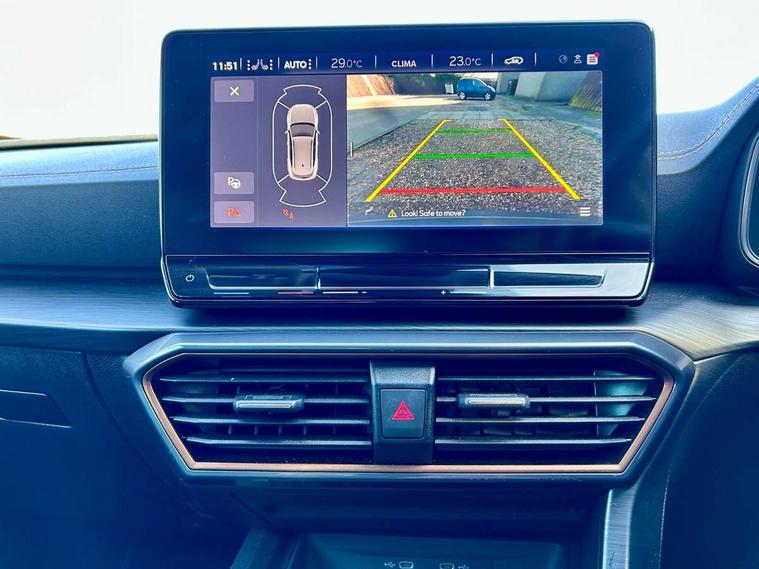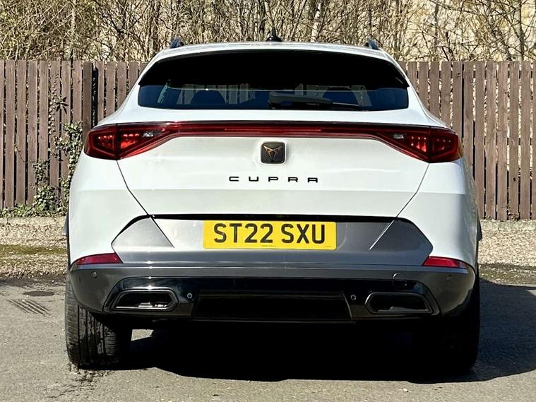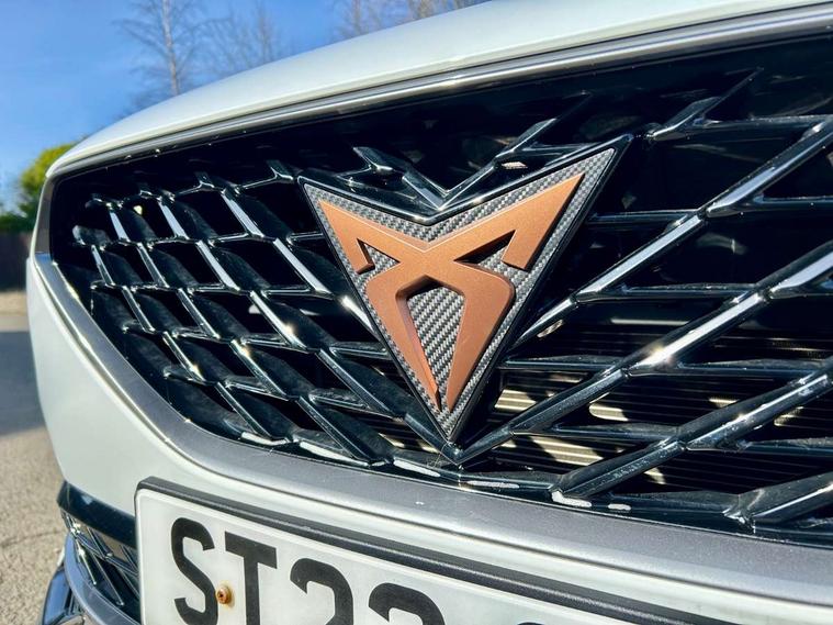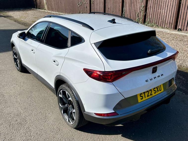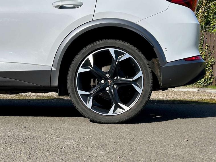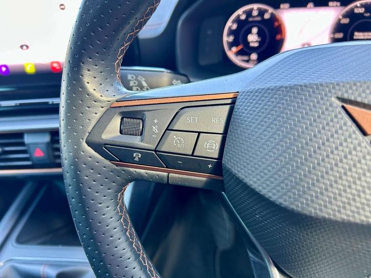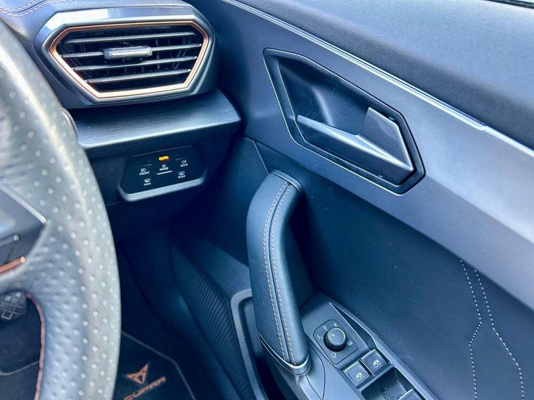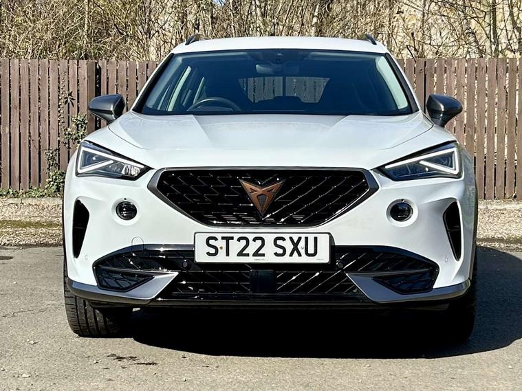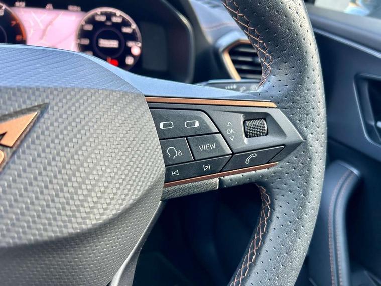 Digital cockpit and configurable dashboard, Driver alert system, Driving profile selection, E-call, Forward collision warning with automatic braking, Lane assist, Navigation system with 12'' Touchscreen Display, Park assist (inc front/rear parking sensors), PAS, Predictive adaptive cruise control with speed limiter, Rear view camera, RPM, trip computer, outside temp gauge, instrument light brightness, low fuel warning light, lights on reminder, gearshift indicator, Service interval indicator, Start/stop system with regenerative braking, Voice control system, Wireless apple carplay, Wireless phone charger, Electronic locking differential and dynamic traction support, Standard suspension, 2 front and 2 rear USB type C sockets, Auxiliary input socket, DAB radio, Auto dimming rear view mirror, Body colour door handles, Body coloured bumpers, Dark grey wing mirror, Daytime running light with automatic headlight control and coming home feature, Dynamic headlight range control, Electric front/rear windows, Electrically adjustable heated and folding door mirrors with memory function, Front fog lamps with cornering function, Gloss black roof rails and window surrounds, LED Headlights, LED Taillights with dynamic indicator, Rain sensing wipers, Rear diffuser with black simulated exhaust pipes, Rear side wing doors, Rear wash/wipe, Third brake light, Tinted rear windows, Welcome lights, 12v power supply in centre console, 12V socket, 12v socket in loadspace, 2 front and 2 rear reading lights, 230V socket, 3 seat bench in 2nd row, 60/40 split rear bench seat with armrest and mechanical seat release, Dust/pollen filter, Front and rear head restraints, Front centre armrest, Height/reach adjust steering wheel, Illuminated interior front door sills, Illuminated sunvisor with mirror, Isofix, Leather multi function steering wheel, Luggage tie-down hooks, Single front passenger seat, Three zone climate control with control panel in rear, Variable luggage/load compartment floor, Wraparound lighting, Genuine Nappa leather Pack - Cupra, Safety and driving pack (M) - Formentor, 3 point seatbelts on all rear seats, ABS, Brake control system - ESC and brake booster, Child proof door locks, Driver and front passenger airbags with front passenger airbag de-activation, Electronic parking brake, Front and rear disc brakes, Front side curtain airbags, Hill hold control, Seat belt reminder for front and rear seats, Tyre pressure monitoring system, Anti theft alarm system, Keyless entry and start system (KESSY), Locking wheel bolts, Copper and aluminium interior detailing, 19" 'Exclusive' machined sport matte black and silver alloy wheels,