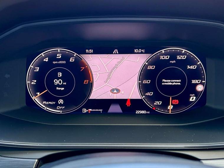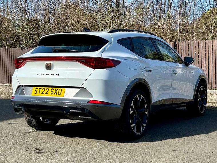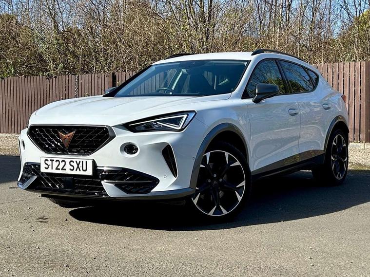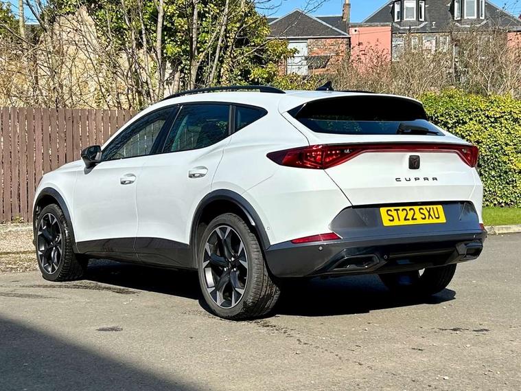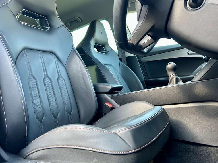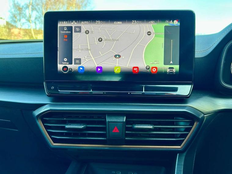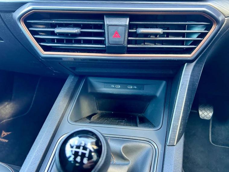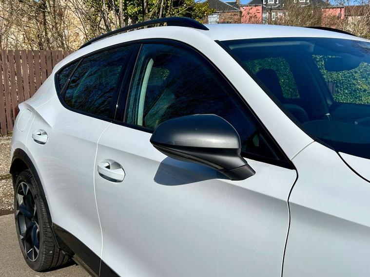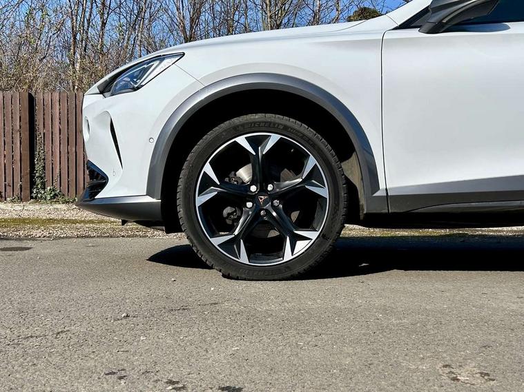 Digital cockpit and configurable dashboard, Driver alert system, Driving profile selection, E-call, Forward collision warning with automatic braking, Lane assist, Navigation system with 12'' Touchscreen Display, Park assist (inc front/rear parking sensors), PAS, Predictive adaptive cruise control with speed limiter, Rear view camera, RPM, trip computer, outside temp gauge, instrument light brightness, low fuel warning light, lights on reminder, gearshift indicator, Service interval indicator, Start/stop system with regenerative braking, Voice control system, Wireless apple carplay, Wireless phone charger, Electronic locking differential and dynamic traction support, Standard suspension, 2 front and 2 rear USB type C sockets, Auxiliary input socket, DAB radio, Auto dimming rear view mirror, Body colour door handles, Body coloured bumpers, Dark grey wing mirror, Daytime running light with automatic headlight control and coming home feature, Dynamic headlight range control, Electric front/rear windows, Electrically adjustable heated and folding door mirrors with memory function, Front fog lamps with cornering function, Gloss black roof rails and window surrounds, LED Headlights, LED Taillights with dynamic indicator, Rain sensing wipers, Rear diffuser with black simulated exhaust pipes, Rear side wing doors, Rear wash/wipe, Third brake light, Tinted rear windows, Welcome lights, 12v power supply in centre console, 12V socket, 12v socket in loadspace, 2 front and 2 rear reading lights, 230V socket, 3 seat bench in 2nd row, 60/40 split rear bench seat with armrest and mechanical seat release, Dust/pollen filter, Front and rear head restraints, Front centre armrest, Height/reach adjust steering wheel, Illuminated interior front door sills, Illuminated sunvisor with mirror, Isofix, Leather multi function steering wheel, Luggage tie-down hooks, Single front passenger seat, Three zone climate control with control panel in rear, Variable luggage/load compartment floor, Wraparound lighting, Genuine Nappa leather Pack - Cupra, Safety and driving pack (M) - Formentor, 3 point seatbelts on all rear seats, ABS, Brake control system - ESC and brake booster, Child proof door locks, Driver and front passenger airbags with front passenger airbag de-activation, Electronic parking brake, Front and rear disc brakes, Front side curtain airbags, Hill hold control, Seat belt reminder for front and rear seats, Tyre pressure monitoring system, Anti theft alarm system, Keyless entry and start system (KESSY), Locking wheel bolts, Copper and aluminium interior detailing, 19" 'Exclusive' machined sport matte black and silver alloy wheels,