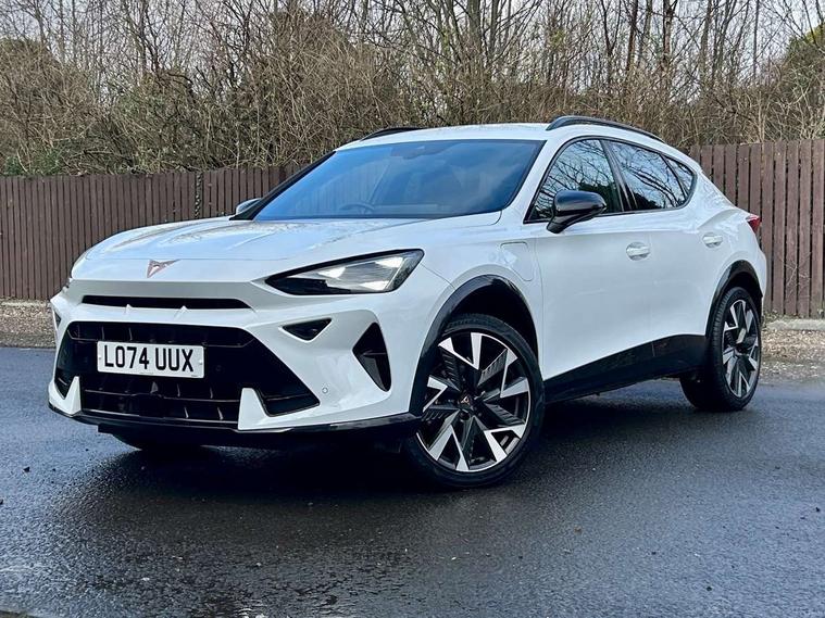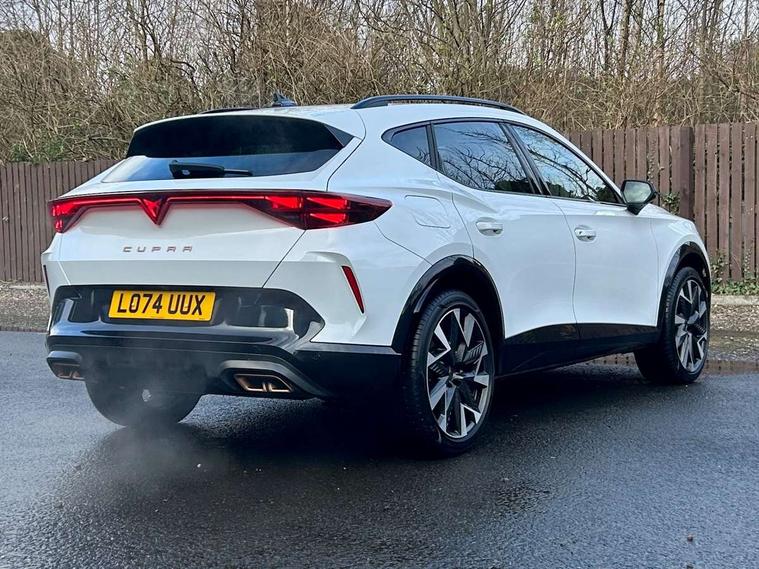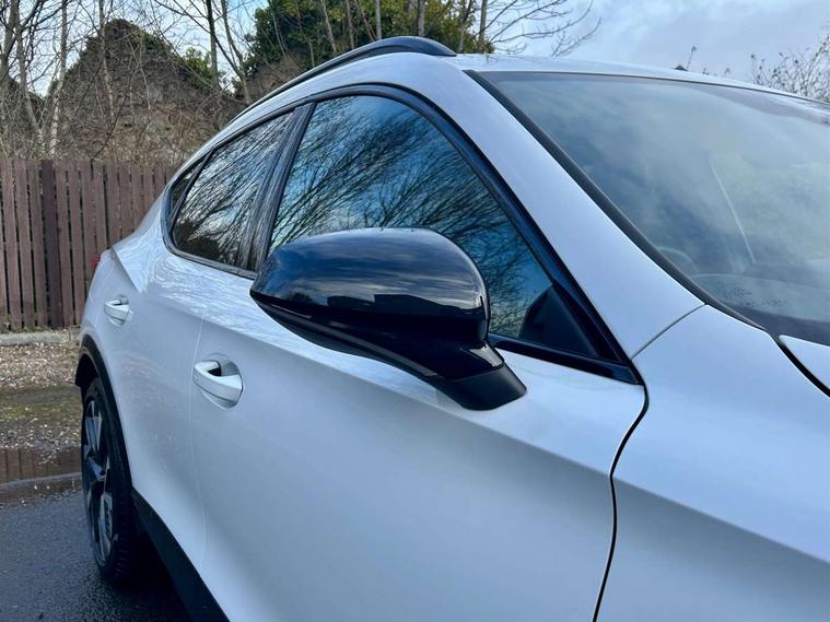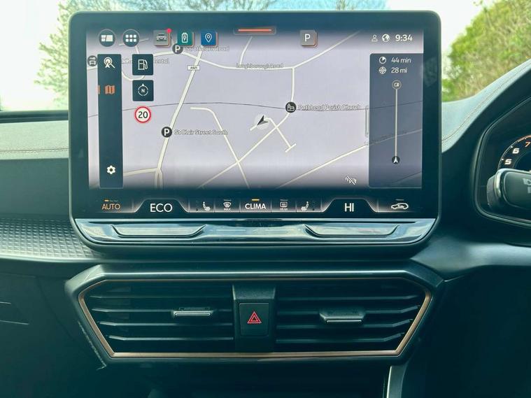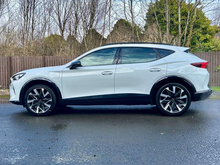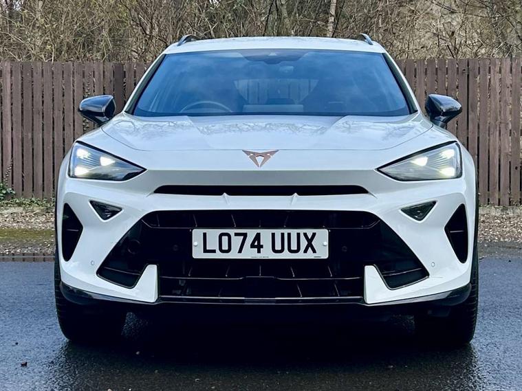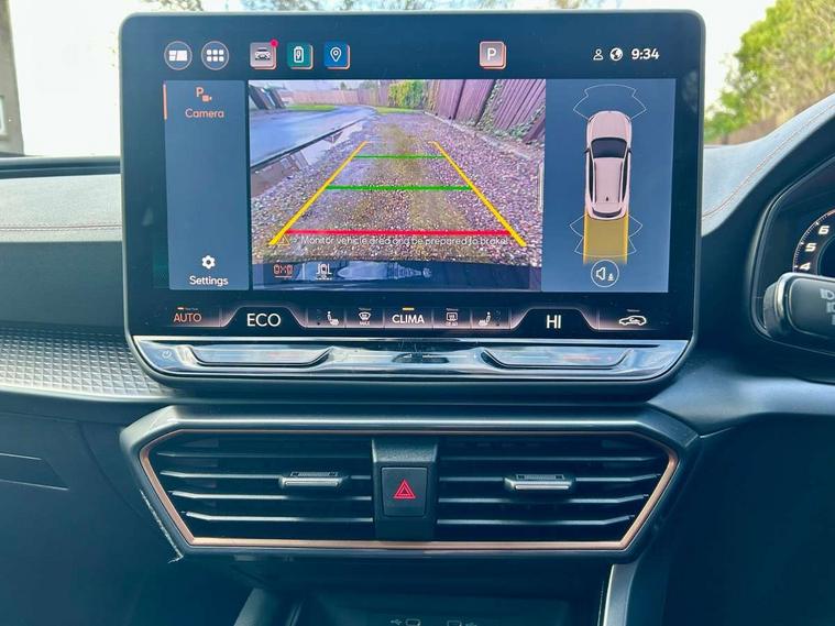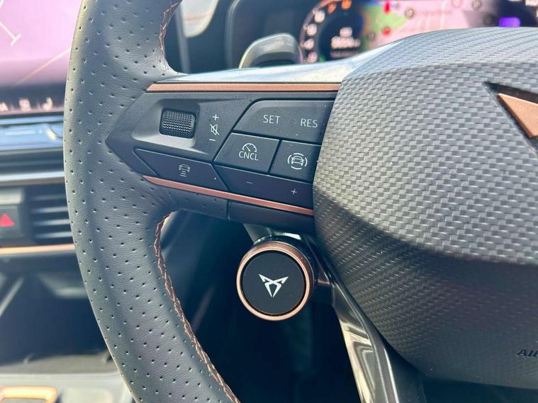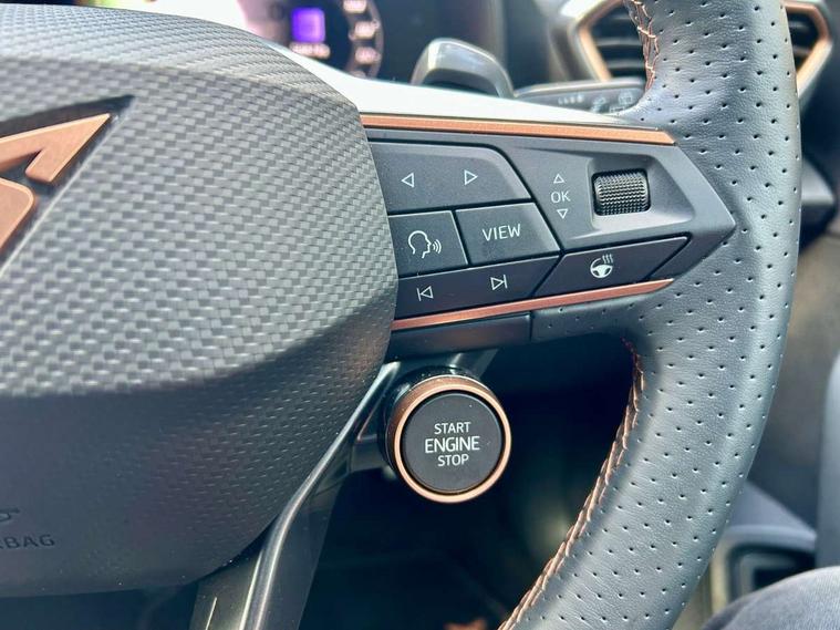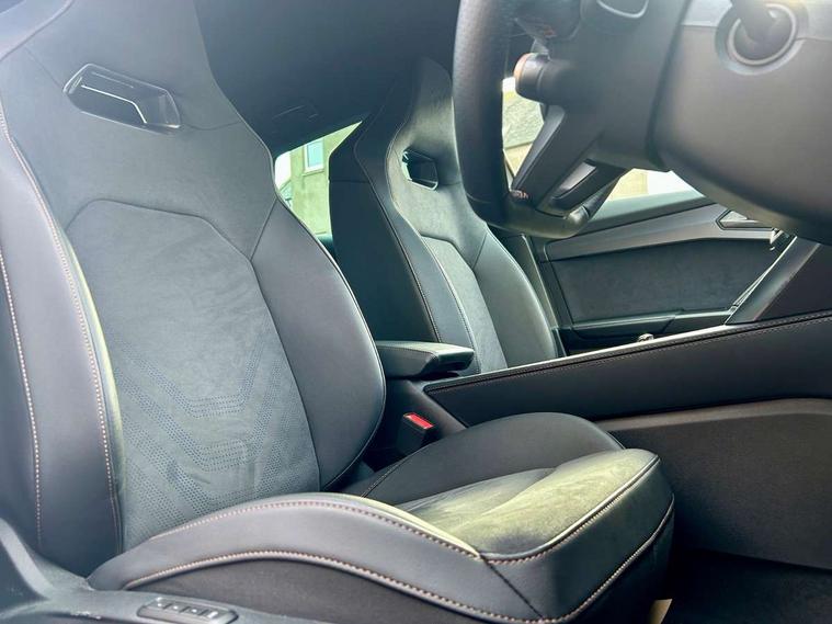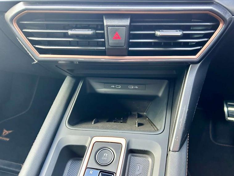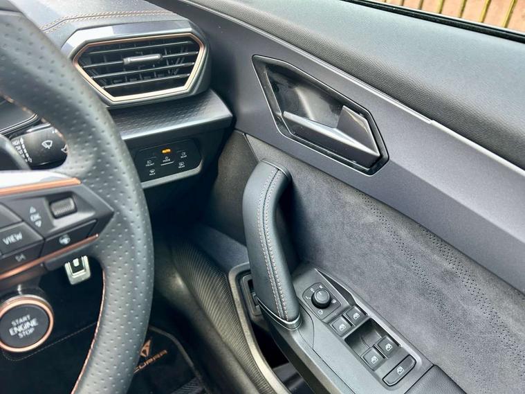 10.25" digital cockpit and configurable dashboard, Adaptive cruise control with follow-to-stop and speed limiter, Advanced driver alert system, Driving profile selection, Dynamic road sign display, Emergency steering support with turn assist, Forward collision warning with automatic braking, Front and rear parking sensors, Full link phone integration, Lane assist, Progressive steering, Rear view camera, RPM, trip computer, outside temp gauge, instrument light brightness, low fuel warning light, lights on reminder, gearshift indicator, Service interval indicator, Start/stop system with regenerative braking, Virtual pedal and electric tailgate, Voice control system, Wired Android Auto, Wireless apple carplay, Wireless phone charger, 10 amp mode 2 charging cable, 32 amp mode 3 charging cable, CUPRA sport suspension, Electronic locking differential and dynamic traction support, 2 front and 2 rear USB type C sockets, Media system with navigation, 12.9" touchscreen display, voice control, DAB, steering wheel mounted controls, Auto dimming rear view mirror, Body colour door handles, Body coloured bumpers, Dark grey wing mirror, Daytime running light with automatic headlight control and coming home feature, Door panel ambient lighting, Dynamic headlight range control, Electric front/rear windows, Electrically adjustable heated and folding door mirrors with memory function, Gloss black roof rails and window surrounds, High beam assist, LED 3rd brake light, LED front fog lamps with cornering function, LED Headlights, LED Taillights with dynamic indicator, Rain sensing wipers, Rear diffuser with copper simulated exhaust pipes, Rear fog lights, Rear side wing doors, Rear wash/wipe, Tinted rear windows, Welcome lights (within exterior mirror housing), 12V socket, 2 front and 2 rear reading lights, 3 seat bench in 2nd row, 60/40 split rear bench seat with armrest and mechanical seat release, Black headlining, Black interior roof lining, Cupra sports pedals, Dust/pollen filter, Electrically adjustable driver's seat with memory and lumbar support, Front and rear head restraints, Front centre armrest, Heated front seats, Heated supersports multifunction leather steering wheel with satellite buttons and gear shift paddles, Height/reach adjust steering wheel, Illuminated aluminium doorsteps, Illuminated interior front door sills, Illuminated sunvisor with mirror, Isofix, Leather dashboard, door insert and side trim panel, LED smart wraparound lighting, PVC/Dinamica microfiber upholstery + bucket seats, Satellite steering wheel, Single front passenger seat, Storage pockets on rear of front seats, Three zone climate control with control panel in rear, 3 point seatbelts on all rear seats, ABS, Brake control system - ESC and brake booster, Child proof door locks, Driver and front passenger airbags with front passenger airbag de-activation, Electronic parking brake, Front and rear disc brakes, Front side curtain airbags, Hill hold control, Public e-call, Seat belt reminder for front and rear seats, Tyre pressure monitoring system, Anti theft alarm system, KESSY Advanced - Keyless start, keyless entry with SAFELOCK, Locking wheel bolts, Copper and aluminium interior detailing, 19" Sandstorm machined sport black and silver alloy wheels, Breakdown and tool kit,
