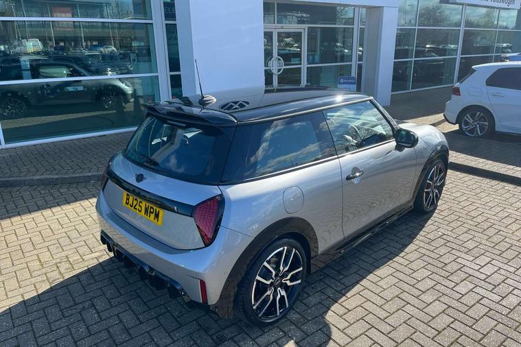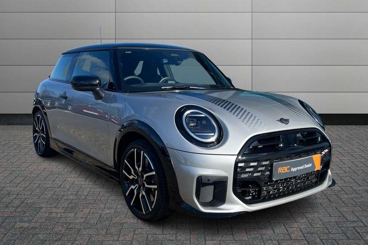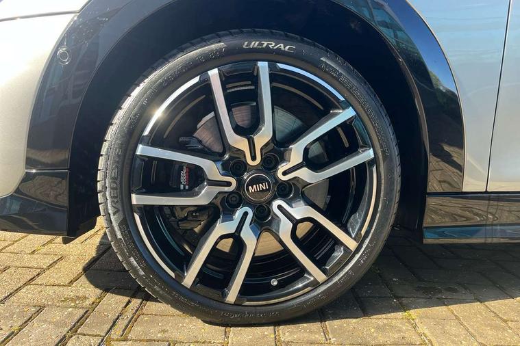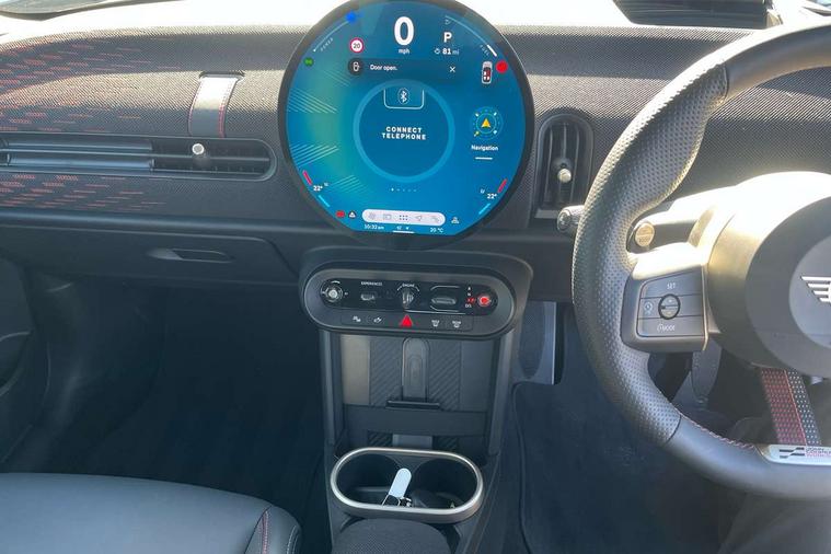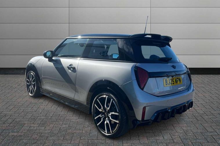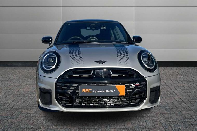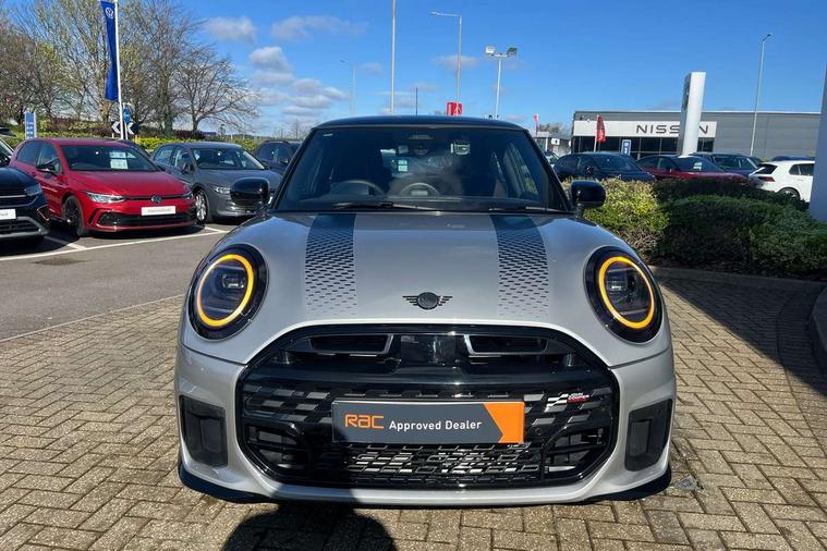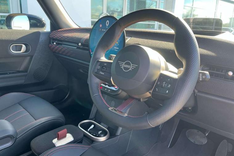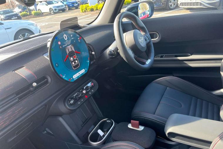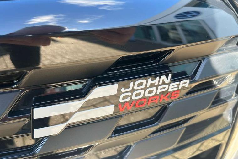Central toggle bar, Circular OLED Screen, Compatible mobile phone bluetooth with audio streaming, Cruise control, Digital instrument cluster, Electro-mechanical speed dependant steering assistance, Emergency call service, MINI Experience Modes, Mini navigation system, On board computer, Service interval indicator, Tailgate, 7 speed steptronic transmission with double clutch, Adaptive suspension, DAB Digital radio, Personal eSim, Auto headlights, Electric adjustable heated door mirrors, Electric front windows, Front and rear apron, Heated rear window, Heated windscreen washer jets, High gloss black wheel arches, High gloss hexagonal patterned grille surround, JCW body kit, LED 3rd brake light, LED daytime running lights, LED Headlights, LED indicator lights, LED rear lights, Rain sensor window wipers, Rear fog lights, Rear roof spoiler with airblades, Rear window wiper, 2 seat bench in second row, 2 zone automatic air conditioning, 60/40 rear seat bench, Ambient lighting, Black lower band in high gloss, Cupholders, Dark headliner, Front and rear head restraints, Front compact armrest, Front floor mats, Heated steering wheel, Height adjustable passenger seat, Lidded storage box in Black/Red knit, Luggage compartment lighting, Partially perforated vescin steering wheel with red accent, black/red decorative strap, Single front passenger seat, Steering wheel paddle shift, Sunvisors with vanity mirrors, Vescin/Cord combination JCW upholstery includes dash knit in black with red accents, Driving assistant pack - Cooper Hatchback, Park assistant pack - Cooper Hatchback, 3 point seatbelts on all four seats, 6 Airbags - front, side, head and seat belt tensioners, Anti-lock braking system (ABS), Brake caliper in Black with JCW badge, DSC - Dynamic Stability Control, Electronic parking brake, Front and rear disc brakes, Front ISOFIX (iSize), Front passenger airbag deactivation, JCW Sport Brakes, Traction control, Tyre pressure monitoring system, Alarm, Immobiliser, Remote central locking, Black/Red decorative dash strap, Tyre repair kit,