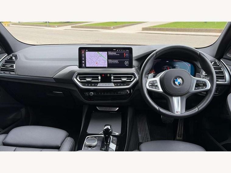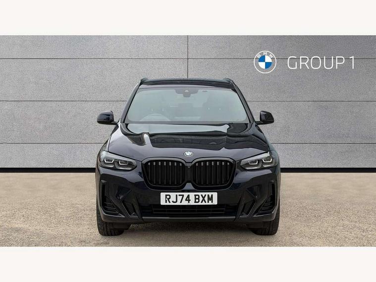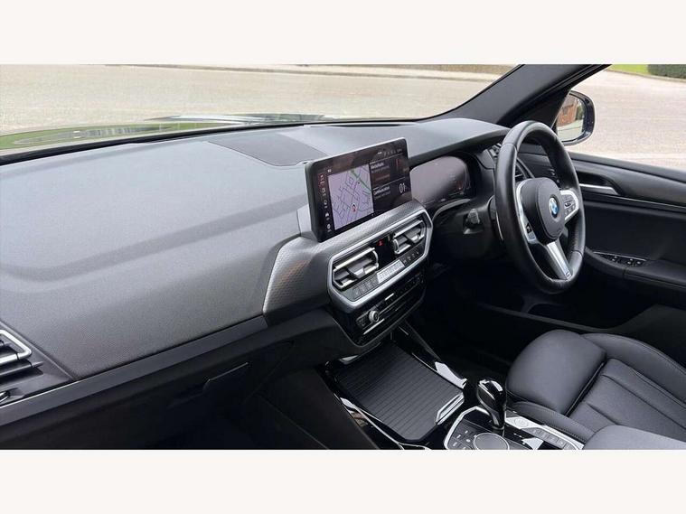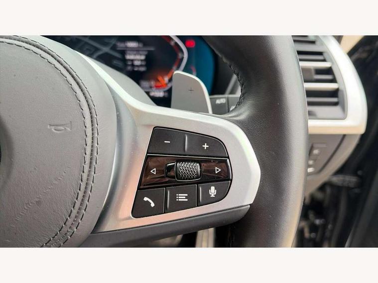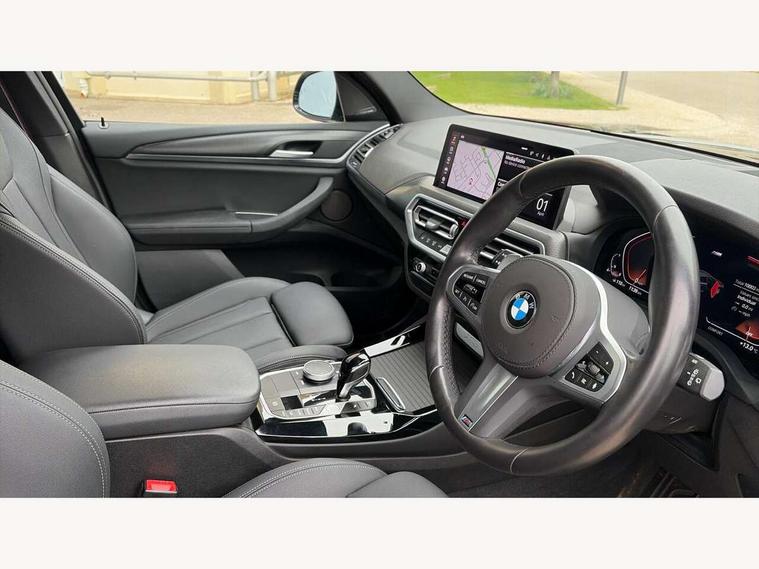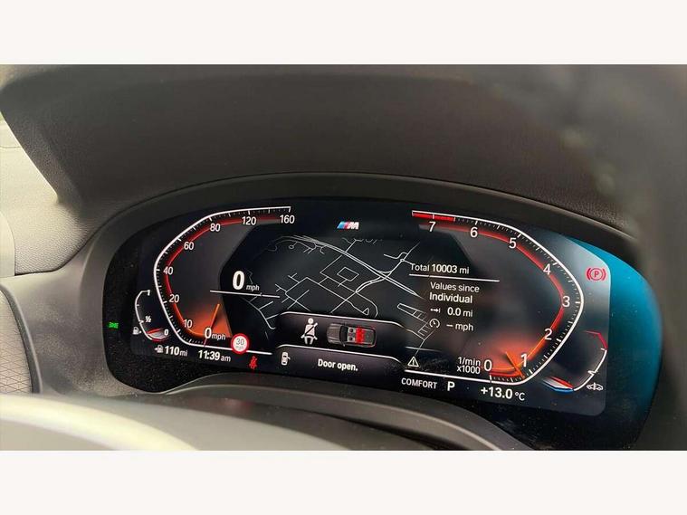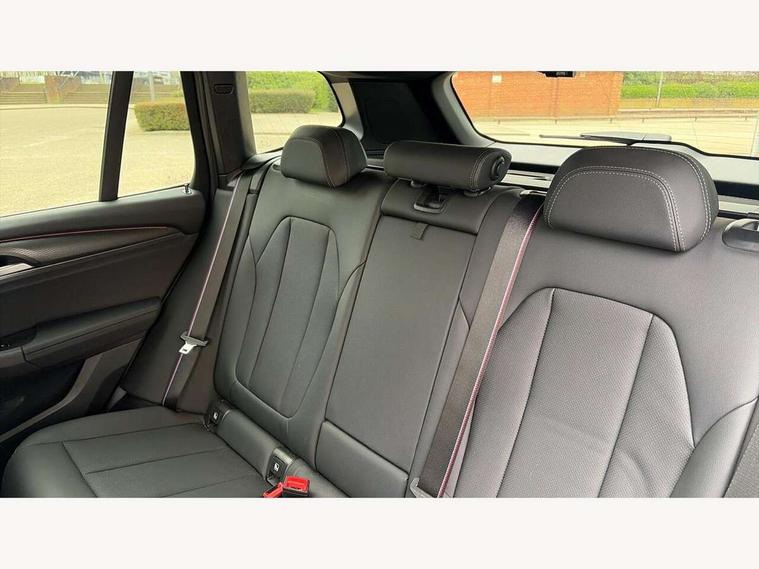 Active Guard, Attentiveness assist, BMW Live Cockpit Professional nav system including 12.3" instrument display + 12.3 high resolution control display, BMW Online services, BMW Teleservices, Brake pad wear indicator in front and rear, Check Control warning system for monitoring of lights and door/luggage compartment open warning, Condition based service - BMW service history, electronic service booklet, integrated owner's handbook, Connected drive services, Electric boot lid, Front/rear Parking distance control, iDrive touch controller with 8 favourite buttons, Instrument cluster with speedometer with mph readout, tachometer, fuel gauge and oil temperature gauge, Lights on warning by audio warning signal when ignition is switched off, Oil sensor for level and grade, warning by check control system, On board computer - average speed+fuel consumption, service interval, clock/date, odometer/trip meter, outside temperature display and ice warning, Optimum shift indicator, Personal Profile - automatic lock when driving away selectable, Run flat indicator, Stop/start system, Variable sports power steering with drive performance control Sport+ mode, Automatic transmission with gearshift paddles, Incorrect fuelling protection, M sport suspension, Multi-link rear suspension, BMW professional radio/CD/MP3, DAB tuner, Acoustic glazing, Automatic windscreen wipers and automatic headlight, Black finish on B pillars, Body colour door handles, Body colour electric adjust heated aspherical door mirrors, Body colour roof mouldings, Body coloured bumpers, Direction indicator, side repeaters, integrated in exterior mirrors, Dynamic brake lights, Exhaust tailpipes - dual, round, split left and right with chrome finisher, Fingertip control / anti-trap function on electric window, Folding wing mirrors with auto dimming, Follow me home headlights, Front and rear bumper system with replaceable deformation elements, Front and rear electric windows, Gloss chrome tailpipes finishers, Green tinted heat insulating glass, Heated windscreen washer jets, High beam assistant, High gloss black shadow line roof rails, High gloss shadowline exterior trim in decorative moulding side frame/recess cover/guide rail/B, C pillars/mirror frame and triangle with mirror base, High level 3rd brake light incorporating LED Technology, Interior rear view electrochromatic mirror with automatic anti dazzle function, LED tail lights, Lightweight engineering, M aerodynamic bodystyling, M Sport entry door sill strips, Model designation, Rain sensor, Rear side wing doors, Rear wing door, Rear wiper, Shark fin antenna, Side exterior M designation badges, Visible VIN plate, Welcome lighting, Windscreen wipers with adjustable interval, 12V power point in luggage area, 12V power socket in front centre console, 2 x USB Type C ports for charging and data transmission (front centre console) and 2 x USB Type C ports for charging (rear centre console), 3 rear headrests, 3 seat bench in 2nd row, 3 zone automatic air conditioning, 4 lashing points to secure luggage, 40:20:40 split folding rear seat with loading system, Ambient lighting, Anthracite headlining, Automatic interior light when door is opened/ignition switched off or via remote key, Floor mats in velour, Foldable storage floor with compartment, Four grab handles integrated in roof lining, Front and rear bottle holders integrated into door trim storage compartments, Front and rear side armrests integrated into door trim, Front centre armrest with storage compartment, Front footwell lights, Front head restraints, Front passenger seat, Front sports seats, Front/rear courtesy lights with soft on/off dimming, Front/rear reading lights, Heated front seats, Isofix rear child seat preparation, Leather gear knob, Lockable glove compartment, Luggage area underfloor compartment, Luggage compartment lighting, M sport leather steering wheel, Multifunction steering wheel, Parcel shelf removeable and storable under boot floor, Reach and rake adjustable steering column, Rear centre armrest with 2 cupholders, Removable / retractable luggage cover, Slope adjustable rear seats, Storage compartment in rear centre console and front/rear door trims, Sun visors with vanity mirrors and ticket pocket, Toolkit located in luggage compartment, Two front cupholders with removable oddments tray/lid, Connected pro pack - X3, ADB - Automatic Differential Brake, Anti-lock braking system (ABS) with brake assist, Automatic Stability Control (ASC), Battery safety cut-off, BMW emergency call, Brake drying, Brake energy regeneration, Braking pre-tensioning, Child locks on rear doors, Cornering brake control (CBC), Crash Sensor - activation of central locking release, hazard warning light and interior lighting, Deactivation of fuel pump in the event of a crash, Driver and front passenger front and side airbags with passenger deactivation and ITS front and rear head airbags, Driver and front passenger knee airbag, DSC+, Dynamic brake control, Dynamic Traction Control - DTC, Electromechanical parking brake, Hill descent control, Hill start assist, Seatbelt security check for front seats, Side impact protection, Three point seatbelts to all seats with front and outer rear pyrotechnic belt tensioners and seat belt force limiters, Two tone horn, Tyre pressure sensor, Ventilated front and rear disc brakes, Warning triangle and first aid kit, Central locking switch for all doors, fuel filler cap and luggage compartment, Electronic engine immobiliser, Locking wheel nuts, Remote control including two integrated key - one button for open/close all lockable content, windows and separate button for open luggage compartment, Remote control Thatcham category 1 alarm, Start/stop button with Comfort Go keyless engine start and auto Start/stop deactivation button, Low rolling resistance tyres,