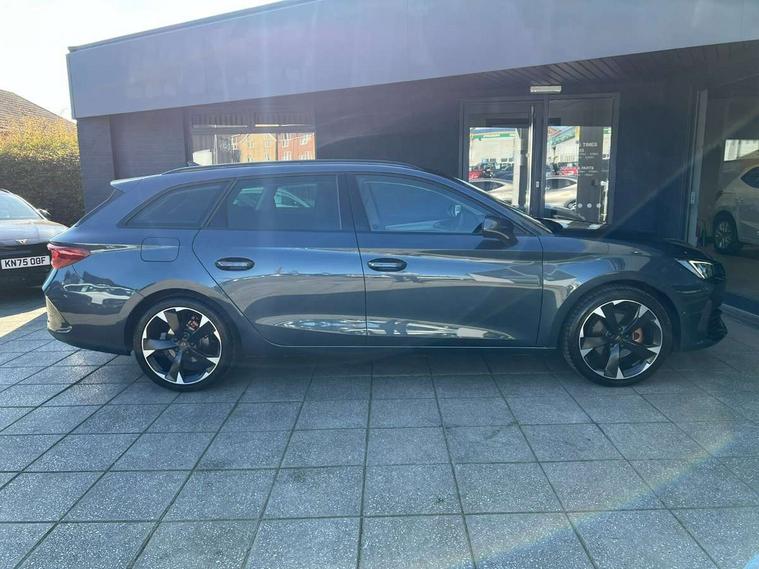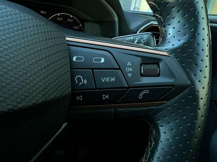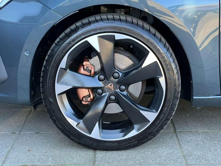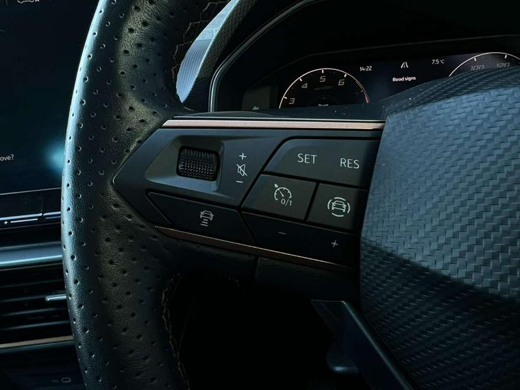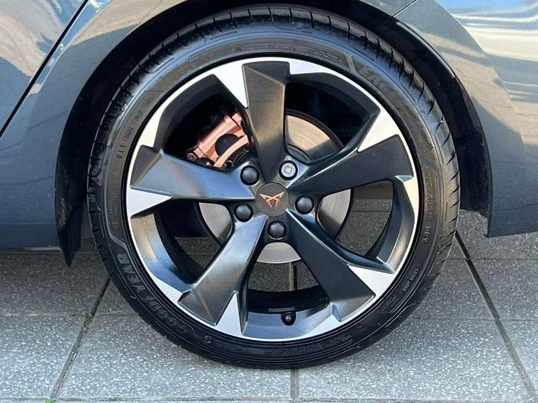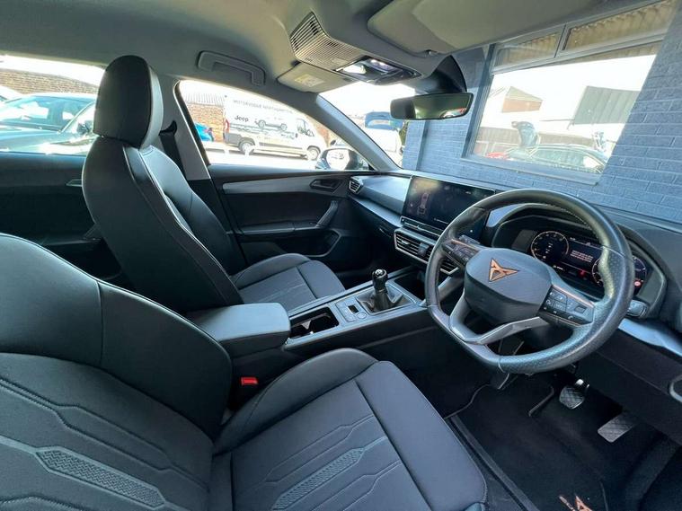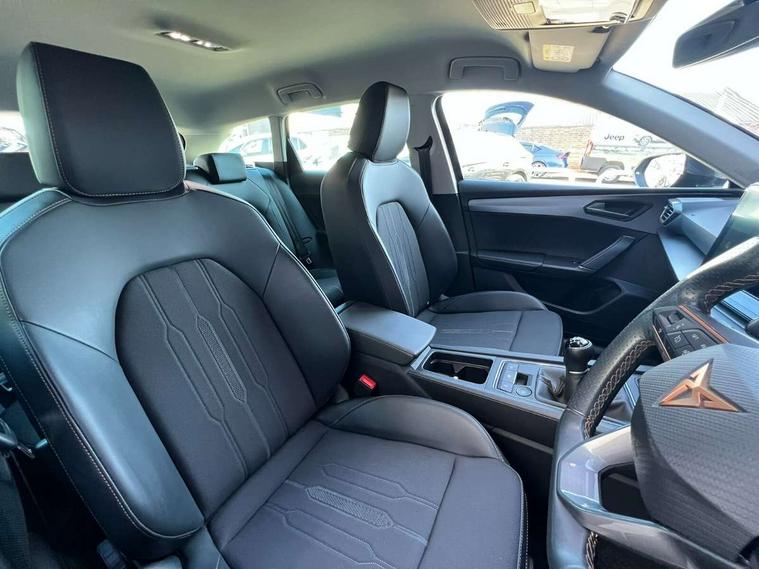 Chrome and copper interior detailing, Media system plus with navigation pack - Leon Cupra, Safety and driving pack (M) - Cupra leon, 18" Machined sport black and silver alloy wheels with 92Y tyres, Anti theft alarm system with interior monitoring in cab, backup horn and towing protection, KESSY Advanced - Keyless start, keyless entry, Locking wheel bolts, 7 speakers, Auxiliary input socket, 3 point seatbelts on all rear seats, ABS, Brake control system - ESC and brake booster, Child proof door locks, Cupra black brake calipers, Driver and front passenger airbags with front passenger airbag de-activation, front side and curtain airbags, Electronic parking brake, Extended safety system - seat belt tensioner, window closure and hazard lights, Hill hold control, Rear disc brakes, Seat belt reminder for front and rear seats, Tiredness recognition system, Tyre pressure monitoring system, Auto dimming rear view mirror, Body colour door handles, Body coloured bumpers, Cupra sports bumpers, Dark tinted rear windows, Electric front/rear windows, Electrically adjustable, heated and folding door mirrors, LED front fog lamps with cornering function, LED headlights with dynamic turn signals, tail lights, rear fog lights with rear coast to coast lighting, Rain sensing wipers, Rear diffuser with twin exhaust pipe on each side, Rear side wing doors, Rear wash/wipe, Separate daytime running light with automatic headlight control and coming home feature, Third brake light, 12v power supply in centre console, 12v socket in loadspace, 3 seat bench in 2nd row, 5 headrests, 60/40 split rear bench seat with armrest, Ambient lighting with glovebox, footwell and single monocolour, Cupra Leather flat bottomed, perforated steering wheel and gearshift paddles, Driver/passenger manual seat height adjustment, Front and rear reading lights X 4, Front centre armrest, Front seats manual lumbar adjustment, Grey headlining, Height/reach adjust steering wheel, Illuminated interior front door sills, ISOFIX points in outer rear seats with top tether anchorage points, Jack and tool kit, PVC/Cloth upholstery with copper stitching, Single front passenger seat, Sliding boot cover, Sports seats, Storage pockets on rear of front seats, Sunvisors with illuminated mirror, Three zone climate control, CUPRA drive profile selection with 4 modes (Comfort/Cupra/Sport/Individual), throttle response and gearshift mode, Digital cockpit, E-call, Electro mechanical speed sensitive power steering, Four x USB Type C ports, Front assist with forward collision warning braking reaction to vehicles, pedestrians and cyclists, Full link smartphone integration with Mirror Link, wireless Apple CarPlay and wired Google Android Auto, Lane assist, Lockable tailgate, Park assist (inc front/rear parking sensors), Rear view camera, RPM, trip computer, outside temp gauge, instrument light brightness, low fuel warning light, lights on reminder, gearshift indicator, Service interval indicator, Start/stop system with regenerative braking, Wireless phone charger, Sports suspension,