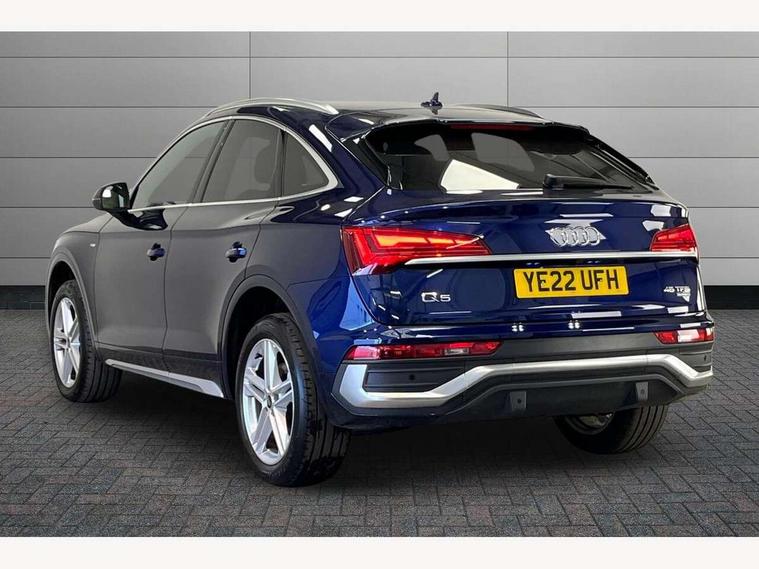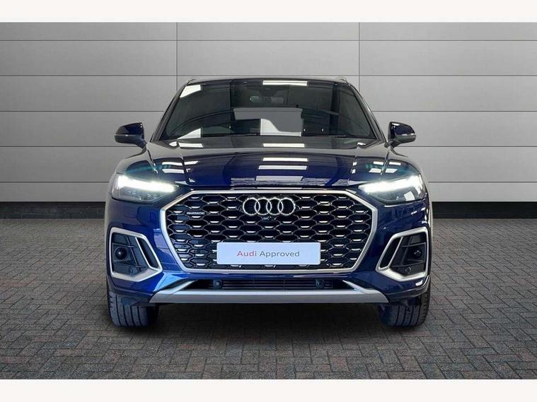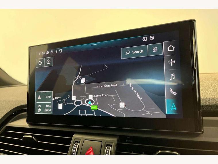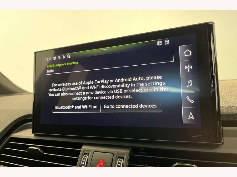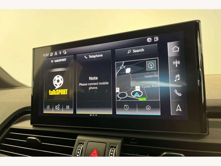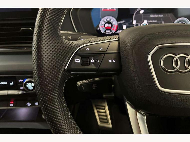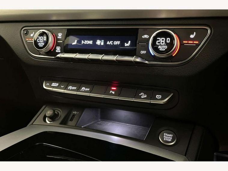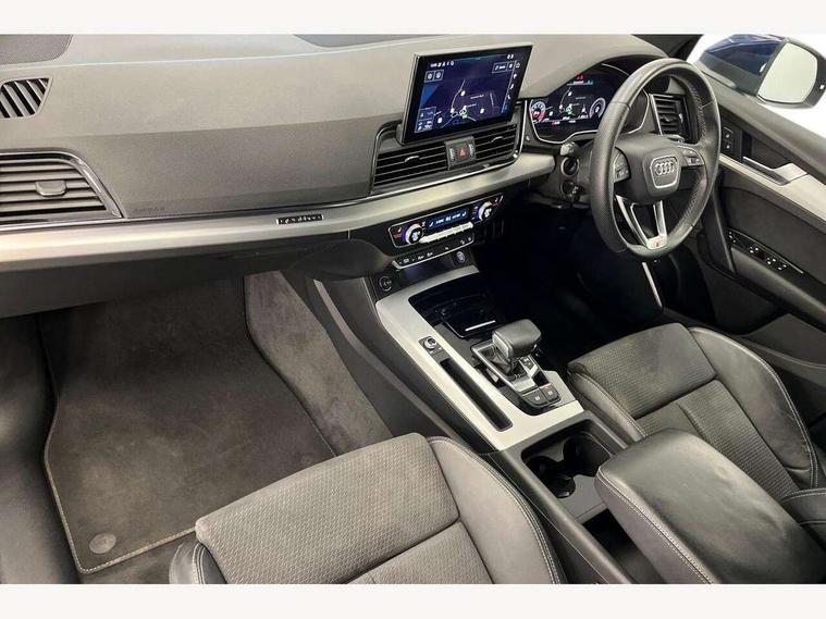 Audi connect safety and service (e-call), Audi connect with Amazon Alexa Integration, Audi drive select, Audi virtual cockpit plus with 12.3" screen and three different layout designs, Audi wireless smartphone interface, Automatic start-stop system with coasting functionality and efficiency programme, Bluetooth interface, Electro - mechanical power assisted steering, MMI navigation plus with 10.1" touch screen, Power tailgate, Reversing camera, Service interval indicator, Voice control system with Audi hotword activation "Hey Audi", Quattro on demand, S line sports suspension, 2 x USB charging port with aux input socket, DAB Digital radio, Acoustic windscreen, Aluminium roof rails, Audi matrix LED headlights with dynamic front and rear indicators, Auto dimming door mirrors, Auto dimming rear view mirror, Automatic headlights and windscreen wipers, Body colour door mirrors, Body colour rear diffuser with matt aluminium silver surrounds, Body colour underbody protection, Chrome plated exhaust trims, Daytime running lights, Door sills in Selenite silver, Electric adjustable/heated/folding door mirrors, Front air inlet surrounds in aluminium, Front and rear electric windows, Front radiator grille in honeycomb design, Headlight washers, High level LED brake light, Lower bumpers painted in contrast Manhattan grey, Rear chrome trim strip below lights, Rear privacy glass and rear side windows, Rear side wing doors, Rear wiper, Roof bars, S Line badges on the front wings, S Line front and rear bumpers, S Line rear spoiler, S Line side skirts, 3 rear headrests, 40:20:40 split folding 3 rear bench seat in 2nd row with rear centre armrest, Black cloth headlining, Comfort front centre armrest, Contrast stitching on seats, steering wheel and gear lever gaiter, Deluxe 3 zone electronic climate control, Front head restraints, Front/rear floor mats, Gear lever in black leather, Heated front seats, Height/reach adjustable steering column, Illuminated door sill trims with S logo, ISOFIX child seat mounting and top tether, Manual seat adjustment with 4-way electric lumbar support, Removable luggage compartment floor, Single front passenger seat, Stainless steel pedals, Sunvisors with vanity mirrors, Trunk roller cover, High gloss pack - Q5, LED interior light pack - Q5, 3 point seatbelts on all seats, 6 airbags - Driver, front passenger, curtain and side airbags, Electrically operated child locks on rear doors, Electromechanical parking brake, Electronic stabilisation control including ABS, ASR and EDL, Front passenger airbag deactivation, Hill descent control, Hill hold assist, Multi collision brake assist, Pop-up bonnet for pedestrian protection, Pre sense city, Seat belt force limiter, Seatbelt monitoring, Tyre pressure warning, Warning triangle and first aid kit, Anti theft alarm, Anti-theft wheel bolts, Keyless Go access/ignition system, Remote central locking, Matt brushed aluminium inlays,