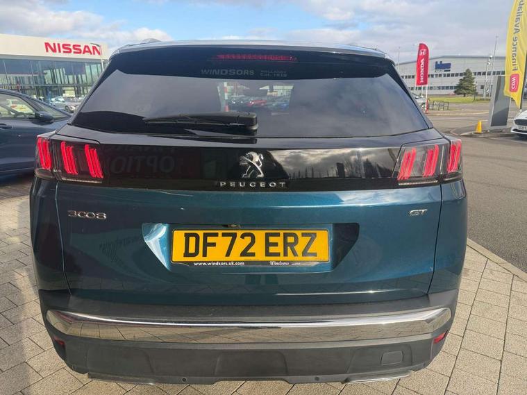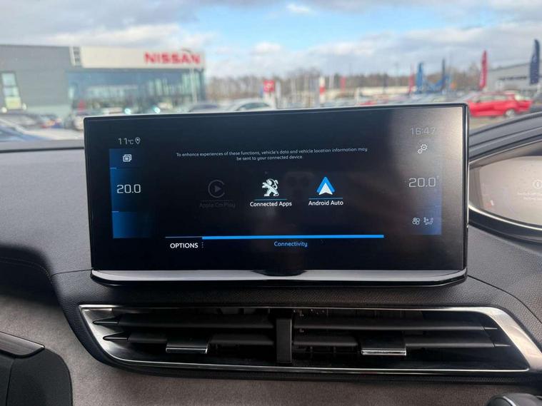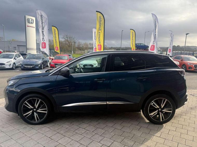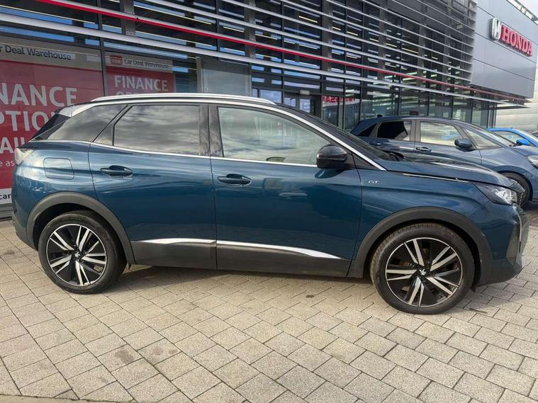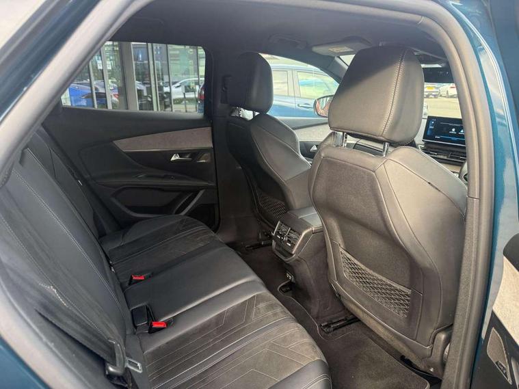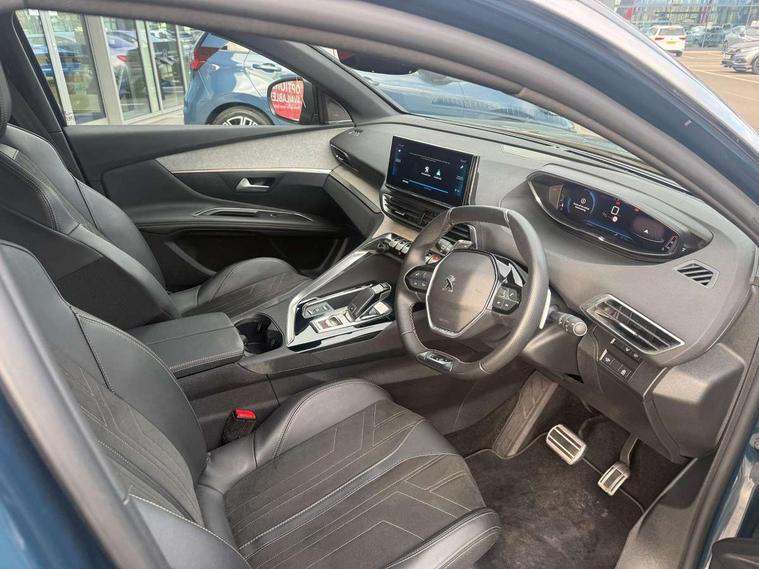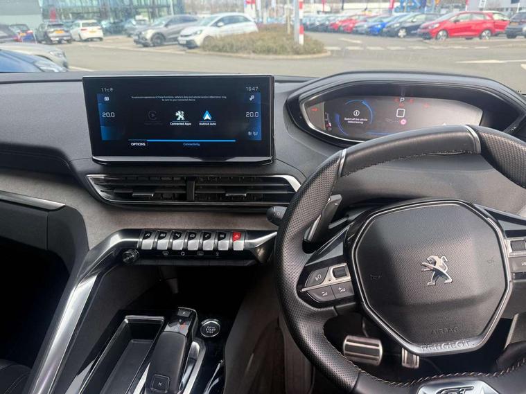 3D connected navigation with 10" HD touchscreen, Bluetooth telephone facility, Drive modes select (Eco, normal and sport), Driving Time Warning (DAA1), Emergency services call system, Extended traffic sign recognition, Exterior temperature indicator with ice warning, Front and rear parking sensors, Mirror screen with mirror link, apple carplay and android auto, Multi function trip computer, Passive blind spot monitoring without Steering correction, PEUGEOT i-Cockpit with 10" high definition capacitive touchscreen, Peugeot i-cockpit with compact multi-function sports steering wheel, PEUGEOT i-Cockpit with configurable 12.3" Head-up digital instrument panel, PEUGEOT SOS and assistance, Rear passenger USB charging sockets (x2) (type A), Speed limit recognition and recommendation, Visio park assist 360 with colour camera system + automatic parking assist, Voice recognition, Dynamic stability control and electronic anti-skid system, Stop/start function, DAB Digital radio, Focal premium HiFi sound system, USB socket, Auto self levelling headlights, Automatic hazard light activation upon heavy brake application, Automatic triggered rear windscreen wiper in reverse gear, Black with chrome detailed front wing trim, Body colour door handles, Body colour rear roof spoiler with stainless steel edging trim, Body protectors (bottom of front and rear bumpers + wheel arches + protection at bottom of doors) in black, Dark tinted rear side windows + tailgate window, Diamond Black door mirror shells, Door mirror mounted LED courtesy floor lighting, Electric folding door mirrors with exterior courtesy LED lighting, Electric operated/heated door mirrors, Fog Mode, Front windscreen wiper with magic wash cleaning system, Full LED headlights with LED fog lights with static cornering function, Gloss black B and C pillar and aerodynamic deflector trim, Gloss black front bumper air scoops, Gloss black rear cluster connecting strip, Gloss black windscreen trim, GT emblem in satin copper (front wings and tailgate), Headlights left on audible warning, Heated rear windscreen with integrated antenna, LED daytime running lights, LED front indicator, LED rear number plate lighting, LED side indicator lights integrated into door mirrors, LED third brake light, One touch electric front/rear windows with pinch protection, Rear LED Peugeot signature 'Claw Effect' lights, Rear side wing doors, Stainless steel roof arches, Twin exhaust tailpipe, 1/3 to 2/3 split folding rear seats, 12V Sockets in dashboard, rear cabin and load area, 2 cupholders in front centre console, 2 cupholders in rear armrest, 2 x Rear reading spotlights, 2x Rear coat hooks, 3x Isofix child seat fittings in the front passenger and outer rear seats, 4 Grab handles retractable and damped, Aikinite stitching in armrest, gear lever and dashboard facia, Aluminium pedals, Blue ambient lighting for connecting zone, Blue ambient lighting to front door panels, central storage and cupholders, Blue ambient lighting to headup instrument panel, Centre front armrest with butterfly wing opening and illuminated storage compartment, Dual zone automatic climate control, Electric power steering with reach and rake adjustable steering column, Flocked front door pocket interior with blue ambient lighting, Flocked glovebox interior, Focal tweeter speaker grilles in Belem bronze metal effect finish, Foldable front passenger seat with picnic table, Footwell illumination, Front interior light with 2 reading spotlights and rear interior light with timer, Front passenger seat manual adjustment (longitudinal and back rest angle), Front seat back map pockets, Gear shift indicator, Illuminated glovebox, Individual left and right controls in boot for seat folding, LED interior lighting in storage spaces and load area, LED roof interior lighting, Mistral floor mats with Aikinite contrast stitching, Mistral full grain perforated leather steering wheel with aikinite stitch detail and satin chrome 'GT' emblem, Rear bench seat with central armrest and ski hatch, Rear centre console ventilation system, Roof lining - Mistral black, Satin chrome dashboard trim, Satin chrome digital instrument panel and touchscreen trim, Satin chrome front door panel recess trim, Satin chrome interior door handles, Satin chrome scorpion's tail and toggle switch trim, Seatbelt not fastened audible and visual alert for front seats, Seatbelt unfastened on the move audible and visual alert for front and rear seats, Sunvisors with illuminated vanity mirrors, Two position boot floor, Drive assist plus pack - 3008, Driver sport pack - 3008 Auto, Safety plus pack with high beam assist - 3008, Visibility pack - 3008, 3x Rear three-point retractable seatbelts with force limiters in the outer rear seats, ABS (Anti-lock Braking System) with EBD (Electronic Brakeforce Distribution) and EBA (Emergency Braking Assistance), Adaptive driver and front passenger airbags with passenger airbag deactivation function, Driver and front passenger side airbags, Electric child locking functionality on rear windows and doors, Electric parking brake, Front and rear curtain airbags, Front optimised safety headrests and 3 x rear retractable headrests with height adjustable, Front three point retractable seatbelts with pre tensioners and force limiters, Front ventilated disc brakes and rear disc brakes, Hill start assist, Two tone horn, Automatic door locking when moving off, Electronic immobiliser, key operated exterior door lock from the left hand door, Perimetric and volumetric alarm with lift and tilt sensor, Peugeot Open and Go System, Remote control central locking with two plip keys, Puncture repair kit including compressor, sealant cartridge and towing eye,
