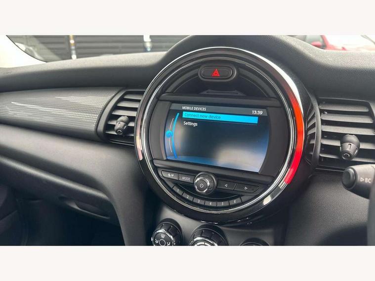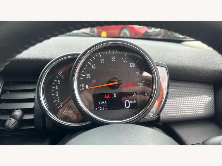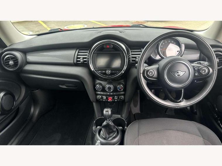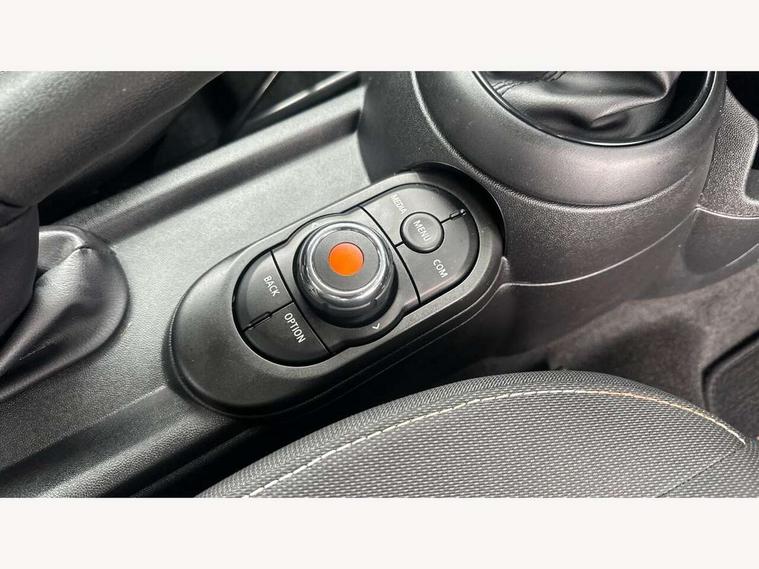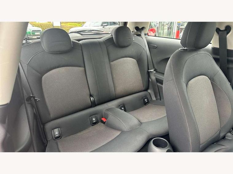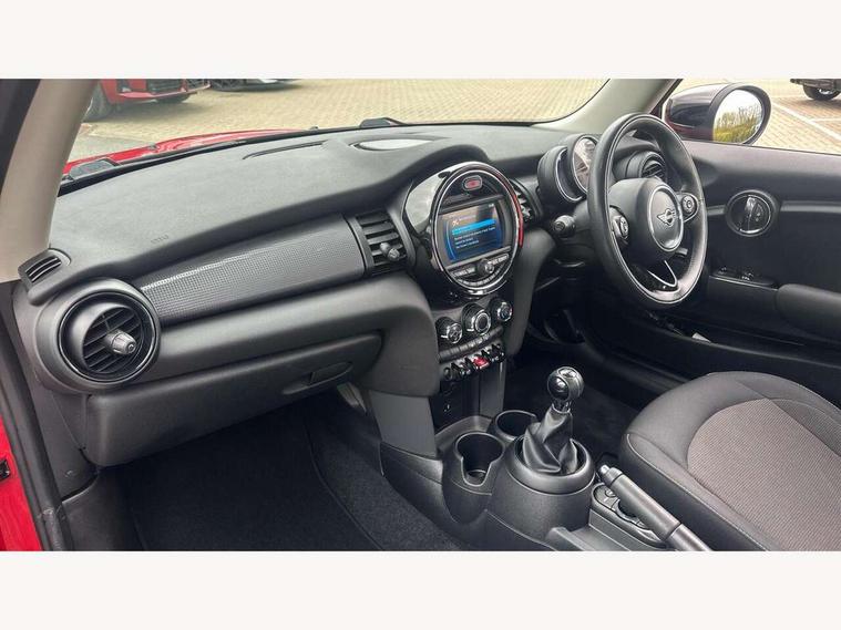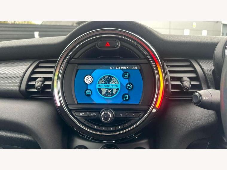 Automatic start/stop function with brake energy recuperation, Compatible mobile phone bluetooth with audio streaming, Electro-mechanical speed dependant steering assistance, Instrument cluster, Mini E-call, MINI TeleServices, On board computer, Service interval indicator, Double Vanos system, Fully variable valve control, High precision injection, 6.5" touchscreen with LED ring, FM tuner and DAB digital radio, Automatic headlight activation switch, Body colour fuel filler cap, Chrome border high gloss black slats radiator grille, Dynamic brake lights, Electric front+rear windows, Heated rear window, Heated windscreen washer jets, LED headlight with closed ring and daytime driving lights, Left exhaust tailpipe with chrome finisher, Metal door sill strips with MINI imprint, Model logo Cooper on right of tailgate, Rain sensor window wipers, Rear fog lights, Rear LED lights with union jack design, Rear window wiper, Side scuttle panel with integrated indicator, Sun/heat protection glass, White indicator lenses, 12V Accessory socket in centre console, 4 lashing eyes in luggage compartment, 60/40 split folding rear seat, Chrome interior highlights, Colour line - Carbon black, Cupholders, Front and rear head restraints, Front and rear isofix with front passenger airbag deactivation, Glove compartment, Height and length steering column adjustment, Interior lighting with 12 basic colours selectable via toggle switch in roof, Leather gearshift lever and handbrake gaiters, LED reading lights, vanity mirror lights, front foot well light and spotlight on front seats, Manual air conditioning, Mechanical seat adjustment, driver seat height adjust, forward/back and front seats backrest, Mini logo projection on floor from drivers exterior mirror, Multifunction steering wheel, Satellite grey headlining, Storage compartments in doors, Sunvisors with vanity mirrors, 3 point seatbelts on all four seats, 6 Airbags - front, side, head and seat belt tensioners, Anti-lock braking system (ABS), DSC - Dynamic Stability Control, Front and rear disc brakes, Hill start assist, Single tone fanfare horn, Tyre pressure monitoring system, Alarm system with tilt sensor, monitoring doors, bonnet interior and tailgate, Electronic vehicle immobiliser, Start/stop toggle with keyless go, Tool kit,