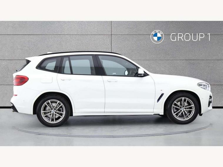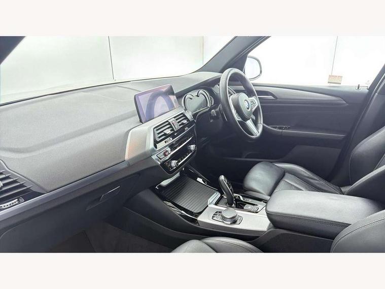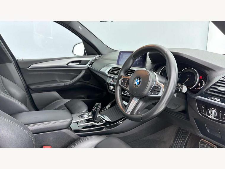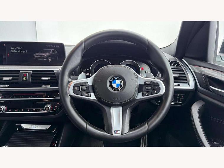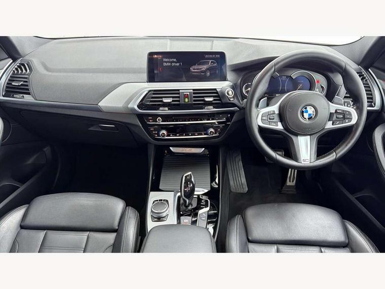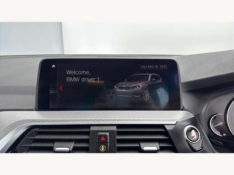 Active Guard incl speed limiting and lane departure functions with auto steering, and front collision warning with brake intervention, Attentiveness assist, Automatic tailgate operation, BMW Live Cockpit Professional sat nav system including 10.25" high resolution display and Intelligent Voice Assistant, BMW Online services, BMW Teleservices, Brake pad wear indicator in front and rear, Check Control warning system for monitoring of lights and door/luggage compartment open warning, Control display - 6.5" colour display screen, Electric Power Steering (EPS) with Servotronic, Front/rear Parking distance control, iDrive Controller with 8 favourite buttons, Lights on warning by audio warning signal when ignition is switched off, Navigation system - BMW Professional multimedia with Hard disc drive (HDD) and 10.25" touch display, Oil sensor for level and grade, warning by check control system, On board computer - average speed+fuel consumption, service interval, clock/date, odometer/trip meter, outside temperature display and ice warning, Optimum shift indicator, Personal Profile - automatic lock when driving away selectable, Real time traffic information, Semi digital instrument cluster, Stop/start system, Automatic transmission with gearshift paddles, Diesel particulate filter, Incorrect fuelling protection, Larger capacity fuel tank, Multi-link rear suspension, Performance Control, Auxiliary socket for external MP3 player, BMW professional radio/CD/MP3, DAB Digital radio, Acoustic glazing, Black finish on B pillars, Body colour door handles, Body colour electric adjust heated aspherical door mirrors, Body colour roof mouldings, Body coloured bumpers, Chrome kidney grille with high gloss black vertical slats, Direction indicator, side repeaters, integrated in exterior mirrors, Dual chrome exhaust, Dynamic brake lights, Exterior mirrors - electrically folding with anti-dazzle, Fingertip control / anti-trap function on electric window, Follow me home headlights, Front and rear bumper system with replaceable deformation elements, Front and rear electric windows, Green tinted heat insulating glass, Heated windscreen washer jets, Height adjustable headlamps, High gloss black door sill finishers, High gloss black shadow line roof rails, High gloss shadowline exterior trim in decorative moulding side frame/recess cover/guide rail/B, C pillars/mirror frame and triangle with mirror base, High level 3rd brake light incorporating LED Technology, Interior rear view electrochromatic mirror with automatic anti dazzle function, LED front fog lights, LED tail lights, Lightweight engineering, M aerodynamic bodystyling, Model designation, Rain sensor including auto headlights activation, Rear wiper, Shark fin antenna, Visible VIN plate, Welcome lighting, Windscreen wipers with adjustable interval, 12V socket in centre console and luggage area, 3 rear headrests, 3 zone automatic air conditioning, 4 lashing points to secure luggage, Ambient lighting, Anthracite headlining, Anthracite Velour floor mats, Driver/passenger sunvisors with ticket holders + illuminated vanity mirrors, Foldable boot floor with storage compartment, Four grab handles integrated in roof lining, Front and rear bottle holders integrated into door trim storage compartments, Front and rear side armrests integrated into door trim, Front centre armrest with storage compartment, Front footwell lights, Front sports seats, Front/rear courtesy lights with soft on/off dimming, Front/rear reading lights, Height adjustable front/rear head restraints, Isofix rear child seat preparation, Leather gear knob, Luggage area underfloor compartment, Luggage compartment lighting, M Sport multifunction leather steering wheel, Parcel shelf removeable and storable under boot floor, Reach and rake adjustable steering column, Rear centre armrest with 2 cupholders, Rear seat centre armrest with two cupholders, Removable / retractable luggage cover, Slope adjustable rear seats, Storage compartment in rear centre console and front/rear door trims, Through loading system with 40/20/40 split folding rear seat, Toolkit located in luggage compartment, Two front cupholders with removable oddments tray/lid, Vernasca leather upholstery, Connected pack professional - X3, ABS/EBD, ADB - Automatic Differential Brake, Automatic Stability Control (ASC), Battery safety cut-off, BMW emergency call, Brake assist, Brake assist function, Brake drying, Brake energy regeneration, Braking pre-tensioning, Child locks on rear doors, Cornering brake control (CBC), Crash Sensor - activation of central locking release, hazard warning light and interior lighting, Deactivation of fuel pump in the event of a crash, Driver and front passenger front and side airbags with passenger deactivation and ITS front and rear head airbags, DSC+, Dynamic brake control, Dynamic Traction Control - DTC, Electromechanical parking brake, Front seat belts warning, Hill descent control, Hill start assist, Seatbelt security check for front seats, Side impact protection, Three point seatbelts to all seats with front and outer rear pyrotechnic belt tensioners and seat belt force limiters, Two tone horn, Tyre pressure monitoring system, Ventilated front and rear disc brakes, Warning triangle and first aid kit, Central locking switch for all doors, fuel filler cap and luggage compartment, Electronic engine immobiliser, Locking wheel nuts, Remote control including two integrated key - one button for open/close all lockable content, windows and separate button for open luggage compartment, Remote control Thatcham category 1 alarm, Start/stop button with Comfort Go keyless engine start and auto Start/stop deactivation button, Low rolling resistance tyres,