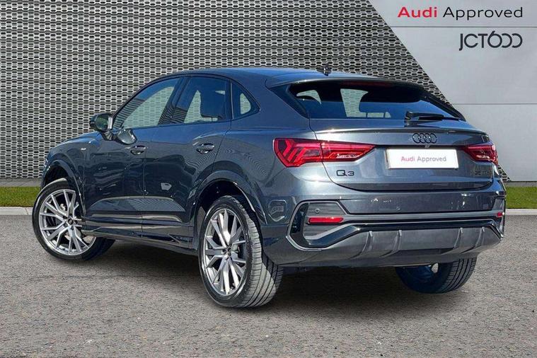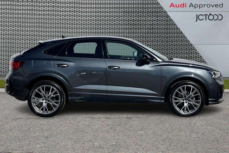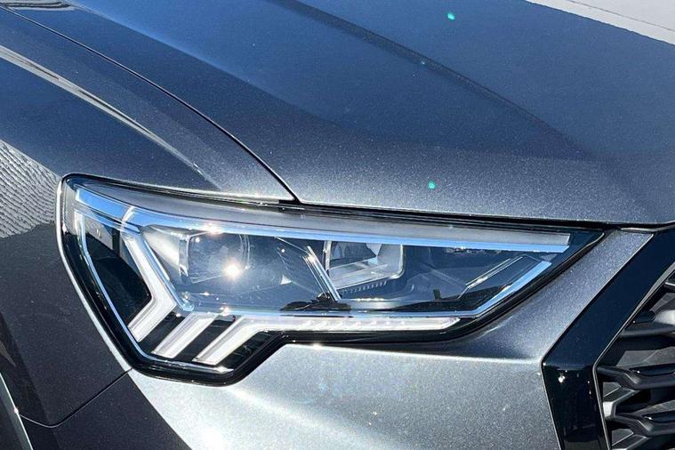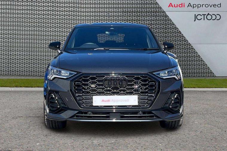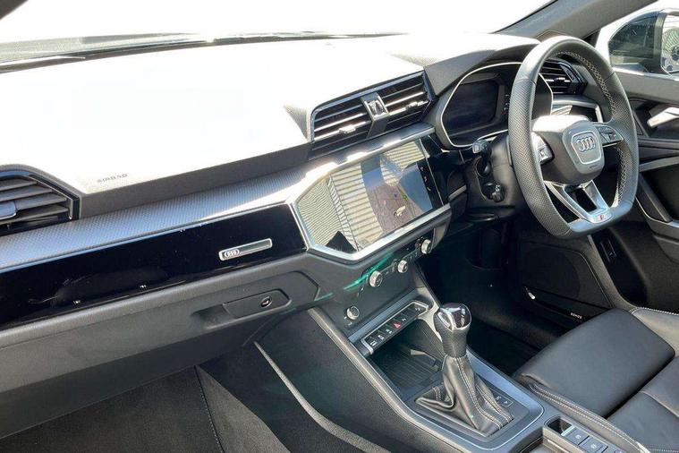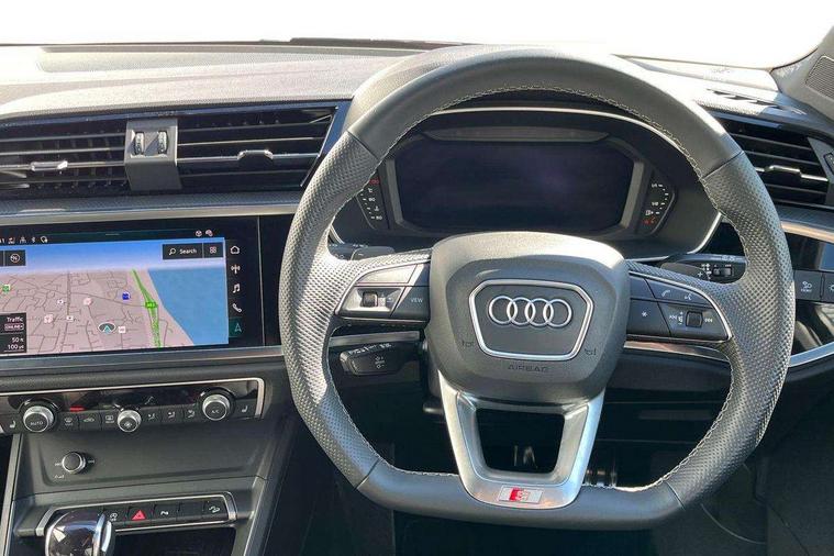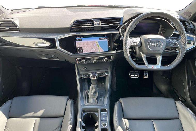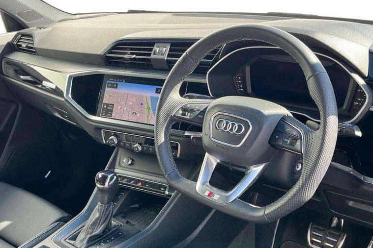 Audi connect safety and service, Audi drive select, Audi lane departure warning, Audi Virtual Cockpit - 10.25" display, Bluetooth interface, Camera based traffic sign recognition, Distraction and Fatigue warning, Legal emergency call, MMI Navigation Plus with high resolution 10.1 inch touchscreen colour display, Power operated tailgate, Progressive steering, Service interval indicator, Smartphone interface includes wireless Apple carplay/Android Auto, Start stop system with recuperation, Voice control system with natural language interaction, Sports suspension, 2 USB-C ports with charge and data functions, 6 passive loudspeakers, DAB digital radio module, Acoustic windscreen, Audi Beam uses LEDs to project the Audi logo onto the ground as you exit your Q3, Auto dimming door mirrors, Auto dimming frameless rear view mirror, Electrically folding, adjustable and heated door mirrors with integrated LED side indicators and kerb view function for passenger side, Front and rear electric windows, Front fog lights, Front underbody protection in manhattan grey paint finish, High gloss black finish B and C pillars, Honeycomb design radiator grille in matt anthracite black, LED Dynamic rear indicators, LED headlights with LED daytime running lights, LED rear lights, LED third brake light, Privacy glass dark tinted rear and rear-side windows (from B-pillar backwards), Rain and light sensors, Rear diffuser grille in grained matt black, Rear diffuser strip in matt anthracite black, Rear side wing doors, Rear underbody protection in matt black, Rear wiper, S line front and rear bumpers and side skirts in contrasting Manhattan grey paint finish, Variable front intermittent wipers, 12V socket in rear centre console, 3 seat bench in 2nd row, 40:20:40 folding with manual adjustment for 60:40 forwards/backwards position and backrest angle, Adjustable rear seat bench/backrest with centre armrest and cupholder, Black carpet mats, Black cloth headlining, Dual zone electronic climate control, Electric lumbar support, Front and rear black floor mats with contrast stitching in rock grey, Front and rear headrests, Front centre armrest, Height and reach adjustable steering wheel, Illuminated door sill trims with S logo, ISOFIX child seat mounting for front passenger with airbag deactivation and outer rear seat including top tether attachment point for outer rear seats, Luggage compartment sill protection in stainless steel, Manual front seats with height adjustment, Perforated leather gearknob, Single front passenger seat, Stainless steel pedals, Twin leather upholstery with front sport seats + S embossing, Black styling pack - Q3, Non smoking pack - Q3, 3x3 point rear seatbelts, 6 airbags - Driver, front passenger, curtain and side windows, Audi pre-sense front with pedestrain and cyclist recognition, Electrically operated child locks on rear doors, Electromechanical parking brake, Electronic stabilisation control including ABS, ASR and EDL, Front seatbelt reminder, Hill descent control, Hill hold assist, Pre sense basic, Seatbelt monitoring, Tyre pressure warning, Warning triangle and first aid kit, Anti theft wheel bolts, Immobiliser, Remote central locking, Thatcham approved category 1 anti theft alarm, Aluminium look interior elements, Detail dashboard around MMI touch colour display in glass look, black with surround in aluminium look, Leatherette door armrest, Piano black inlay,