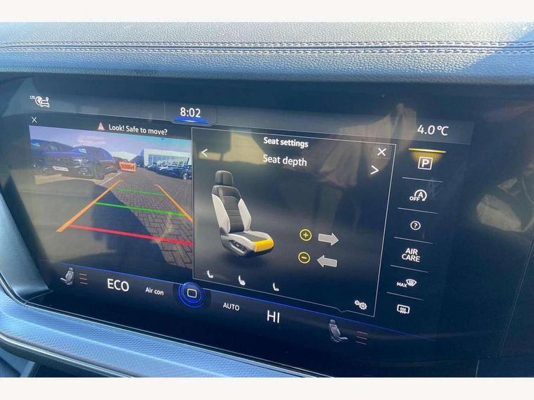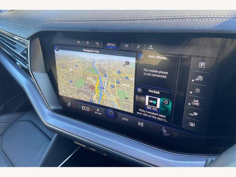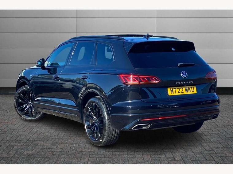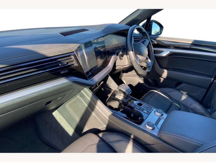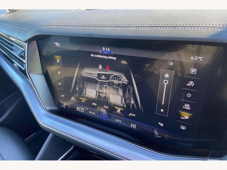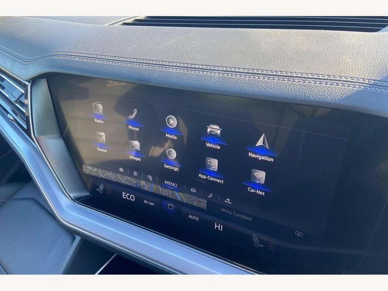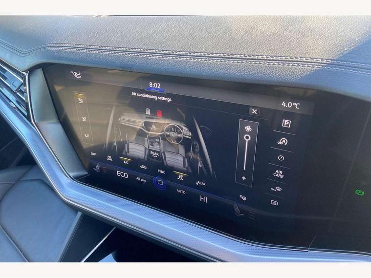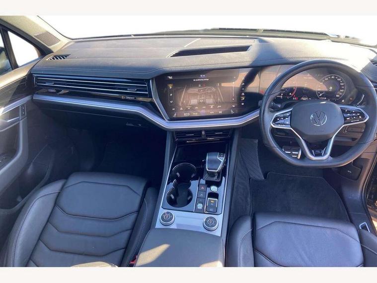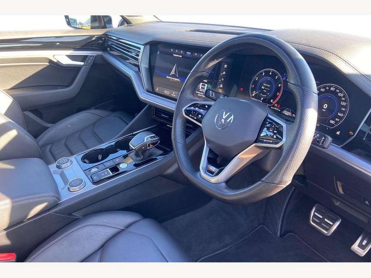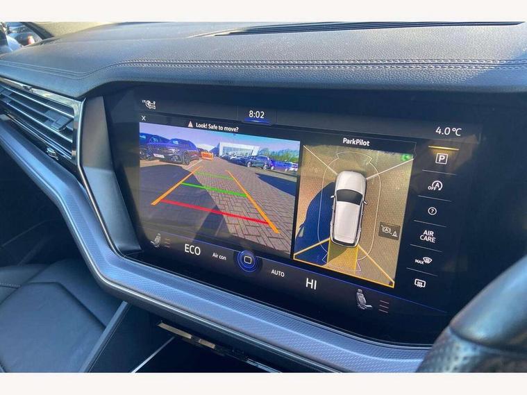 2D/3D map view, ACC - Adaptive cruise control with front assist, forward collision warning, distance monitoring, city emergency brake and speed limiter, Apple car play/Android Auto, Audible and visual fatigue detection system, Bluetooth hands free telephone connection, Car information display, Drive select with Damper control, Driver alert system, Driver profile selection, Dynamic road sign display camera controlled system with visual warning for traffic and road signs, eCall emergency system, Fully electric tailgate + keyless entry and start, Instrument cluster, MirrorLink, Multifunction camera with lane assist, Multifunction computer premium with 7" colour display, One touch indicators with repeat function, Service interval indicator, Speed sensitive power steering, Start/stop system with regenerative braking, Tailgate power latch, Think blue trainer driver tips and journey analysis, Traffic sign recognition, Voice control system, Wireless Smartphone charger, Torsen limited slip differential, DAB Digital radio, Dynamic navigation based on TMC+, Gesture control for infotainment system, Multi device interface (MDI) with illuminated USB-C connection, Music playback - MP3, WMA and AAC files, SD card slot, Simultaneous pairing of 2 compatible mobile devices, SMS functionality - read, compose and send SMS messages using touch-screen display, Title and cover art display, Volkswagen media control, Adaptive low beam for urban and motorway use, Auto dimming rear view mirror, Automatic coming/leaving home lighting function, Automatic headlights, Black anodised roof rails, Black door mirrors, Black rear diffuser, Black side window surrounds, Black upper and lower grille louvres extending into headlights and radiator grille, Body colour door handles, Body coloured wheel arches, C signature gloss black front air intake, Chromed tailpipe on the left and right integrated in the bumper with trapezoid design, Dusk sensor, Dynamic headlight range control, Electric front tilt/slide panoramic sunroof and fixed rear sunroof, Electrically power adjustable, heated, folding, auto dimming, front passenger exterior door mirror lowering function, Front and rear electric windows, Galvanised body, Gloss black finish B pillar, Gloss black rear diffuser, Headlight washers, Heat insulating darkened glass in side and rear windows, Heated windscreen washer jets, IQ.Light-LED matrix headlight, daytime running light with dynamic cornering light and indicator, LED 3rd brake light, LED rear fog light, LED rear number plate lights, Plastic scuff plates in door apertures, Poor weather light, Puddle lights, Rain sensor, Rear side wing doors, Rear wiper, 12V socket in front and rear centre console and boot, 2 Coat hooks on B pillar, 3 rear head restraints, 3 seat bench in 2nd row, 3 spoke sport heated leather multi-function sports steering wheel with gear shift paddles - generation 2, 4 way adjustable front head restraints, 4 way electric lumbar support for driver and front passenger, 4 zone climate control, 40:20:40 split folding slide/recline rear seat, B pillar vents, Black lower edge of door extending sills, Branded points of interest, Double sun visor for drivier and passenger with LED illuminated vanity mirrors, Electric luggage compartment cover, Folding rear centre armrest with 2 cupholders, Front + rear carpet mats, Front centre armrest with storage box, Gear shift indicator, Height/reach adjust steering wheel, Illuminated air conditioned glovebox, Isofix preparation for 2 rear child seats, Jack and tool kit, Leather trimmed gear knob with gloss black inlay/aluminum trim, Leatherette door trim, LED luggage compartment lighting, Load through provision, Luggage compartment with load lashing rings, Plastic loading edge protection, Rear seat remote release levers, Single front passenger seat, Soul black headlining, Stainless steel pedals, Innovision cockpit pack - Touareg, 3 point front seatbelts with pre-tensioners, ABS, Active bonnet, Automatic post collision braking system, Curtain airbags, Driver/Front Passenger airbags, EBD + Brake Assist, EDL, Electronic parking brake with auto hold, ESC with ASR, Front seat side impact airbags, Hill descent control, Hill start assist, Passenger airbag deactivate switch, Seatbelt warning lamp and buzzer, Three 3 point rear seatbelts, Two tone horn, Volkswagen roadside assistance, Warning triangle and first aid kit, Alarm with interior monitoring in cab, backup horn and towing protection, Child security locks for front and rear doors, Electronic engine immobiliser, Remote central locking, Black decorative trims on the side windows, High gloss black centre console,