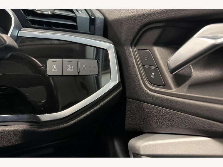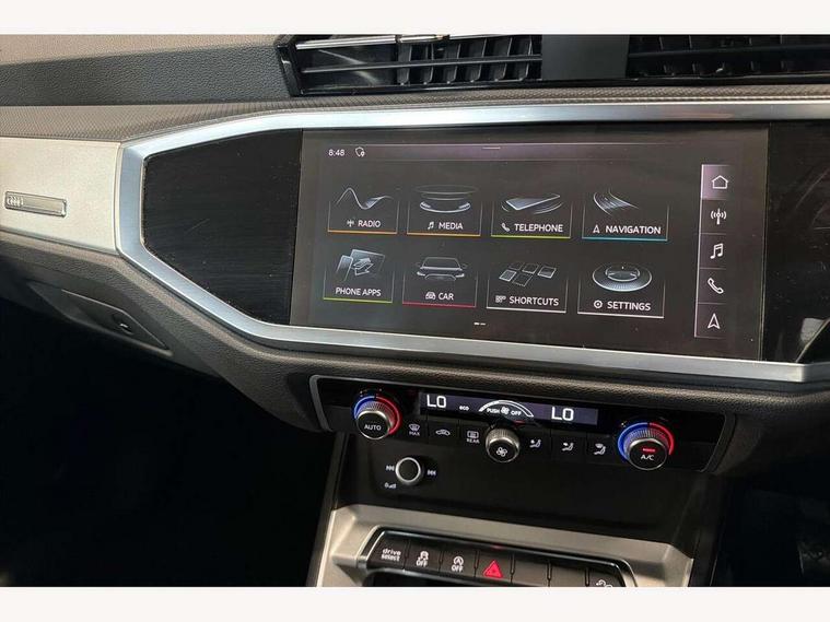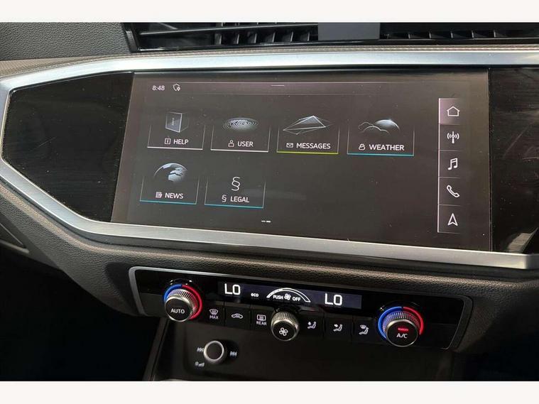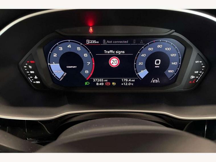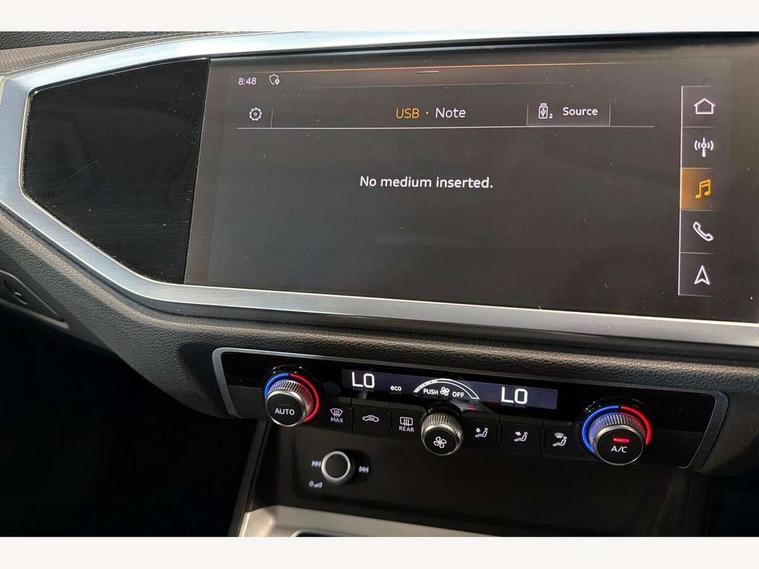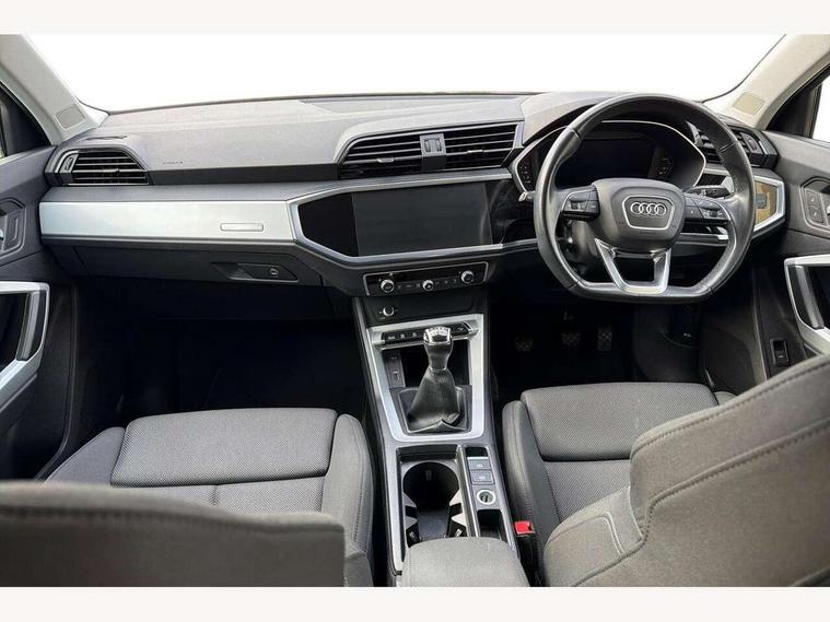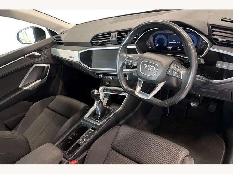Audi connect safety and service (e-call), Audi drive select, Audi lane departure warning, Audi smartphone interface includes wireless Apple carplay/Android Auto, Audi Virtual Cockpit - 10.25" display, Bluetooth interface, Camera based traffic sign recognition, Cruise control + speed limiter, MMI Navigation Plus with high resolution 10.1 inch touchscreen colour display, Power operated tailgate, Progressive steering, Rear parking sensors, Service interval indicator, Start stop system with recuperation, Voice control system with natural language interaction, Standard suspension, 2 USB-C ports with charge and data functions, 6 passive loudspeakers, DAB digital radio module, Acoustic windscreen, Aluminium roof rails, Aluminium window trim, Auto dimming frameless rear view mirror, Body coloured bumpers, Electrically folding, adjustable and heated door mirrors with integrated LED side indicators and kerb view function for passenger side, Front and rear electric windows, Front fog lights, Front side air inlets in matt selenite silver, Front spoiler in matt selenite silver, Grille vertical bars in aluminium silver/Matt, High gloss black finish B and C pillars, LED headlights with LED daytime running lights and dynamic rear indicator, LED rear lights, Rain and light sensors, Rear diffuser strip in matt selenite silver, Silver chrome grille surround, Titanium black radiator grille, 12V socket in rear centre console, 3 spoke multi-function leather steering wheel, 40:20:40 folding with manual adjustment for 60:40 forwards/backwards position and backrest angle, Adjustable rear seat bench/backrest, Aluminium door sill trims, Dual zone electronic climate control, Front and rear floor mats, Front and rear headrests, Front and rear roof module including reading lights, Front centre armrest, Glove compartment lighting, Height and reach adjustable steering wheel, ISOFIX child seat mounting for front passenger with airbag deactivation and outer rear seat including top tether attachment point for outer rear seats, Luggage compartment light, Lunar silver cloth headlining, Manual front seats with height adjustment, Stainless steel luggage compartment sill finisher, Non smoking pack - Q3, 3x3 point rear seatbelts, 6 airbags - Driver, front passenger, curtain and side windows, Audi pre-sense front with pedestrain and cyclist recognition, Electrically operated child locks on rear doors, Electromechanical parking brake, Electronic stabilisation control including ABS, ASR and EDL, Hill descent control, Hill hold assist, Pre sense basic, Seatbelt monitoring, Tyre pressure warning, Warning triangle and first aid kit, Anti theft alarm, Anti theft wheel bolts, Remote central locking, Detail dashboard around MMI touch colour display in glass look, black with surround in aluminium look, Micrometallic silver inlay,