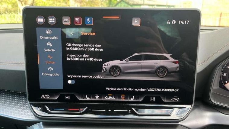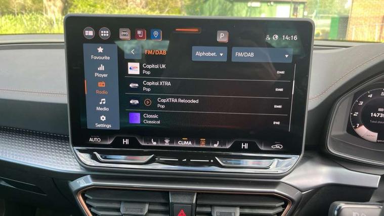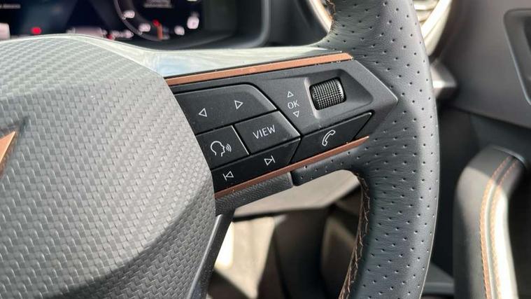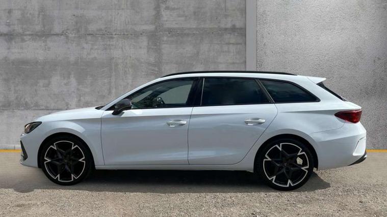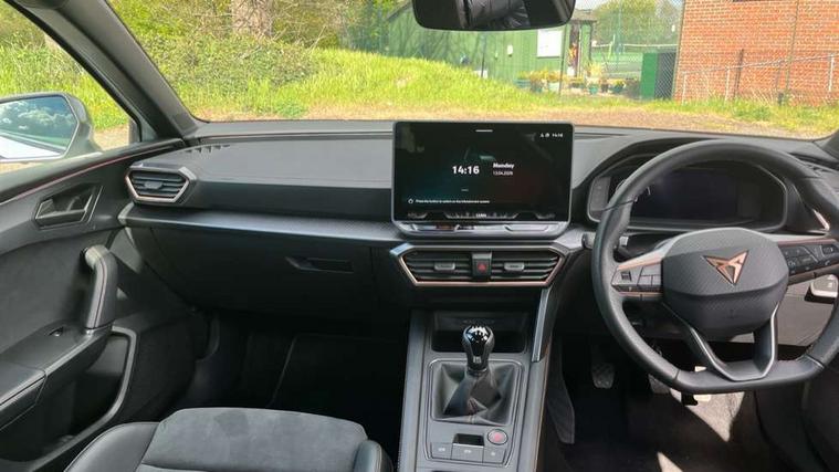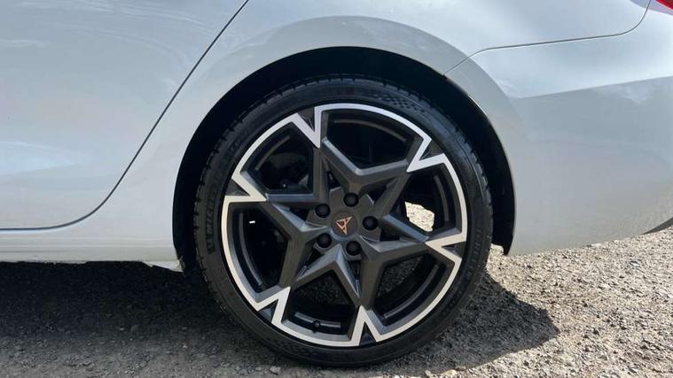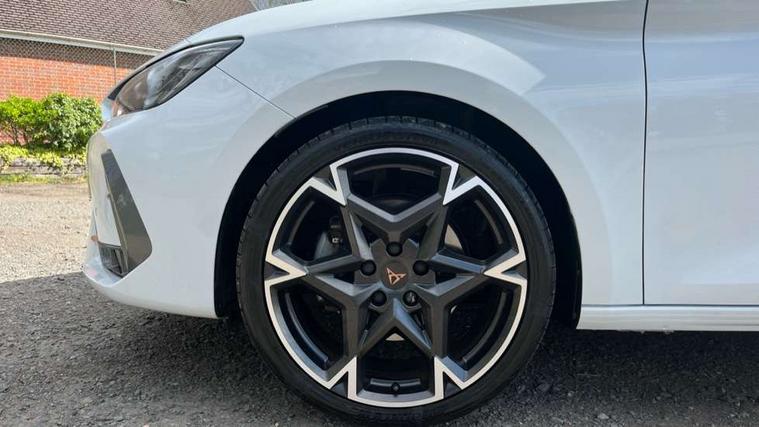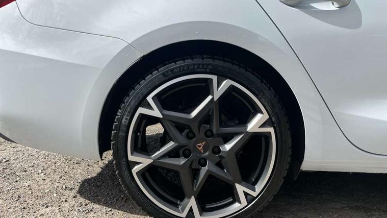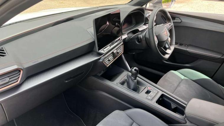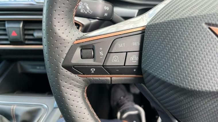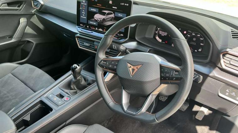 Adaptive cruise control with follow-to-stop and speed limiter, CUPRA drive profile selection with (Comfort/Sport/Individual), throttle response and gearshift mode, Digital cockpit, Dynamic road sign display, E-call, Front and rear parking sensors, Front assist with forward collision warning braking reaction to vehicles, pedestrians and cyclists, Full link smartphone integration with Mirror Link, wireless Apple CarPlay and wired Google Android Auto, Lane assist, Lockable tailgate, Rear view camera, RPM, trip computer, outside temp gauge, instrument light brightness, low fuel warning light, lights on reminder, gearshift indicator, Service interval indicator, Start/stop system with regenerative braking, Virtual pedal with electric tailgate, Wireless phone charger, Auxiliary input socket, Auto dimming rear view mirror, Body colour door handles, Body coloured bumpers, Cupra sports bumpers, Dark tinted rear windows, Electric front/rear windows, Electrically adjustable, heated and folding door mirrors, Gloss black roof rails, High beam assist, LED front fog lamps with cornering function, LED headlights with dynamic turn signals, tail lights, rear fog lights with rear coast to coast lighting, LED rear fog lamp, Rain sensing wipers, Rear side wing doors, Rear wash/wipe, Separate daytime running light with automatic headlight control and coming home feature, Third brake light, Welcome light with logo projector in door mirrors, 12v power supply in centre console, 3 seat bench in 2nd row, 5 headrests, 60/40 split rear bench seat with armrest, Ambient lighting (glovebox, footwell, ambient lighting multicoloured), Black headlining, CUPRA Leather flat bottomed, heated, perforated steering wheel, Dinamica cloth upholstery, Electrically adjustable driver seat and lumbar support with memory function + manually adjustable passenger seat, Four x USB Type C ports (2 in front and 2 in rear), Front and rear reading lights X 4, Front centre armrest, Heated front seats, Height/reach adjust steering wheel, Illuminated interior front door sills, Interior wraparound lighting, ISOFIX points in outer rear seats with top tether anchorage points, Single front passenger seat, Sliding boot cover, Storage pockets on rear of front seats, Sunvisors with illuminated mirror, Three zone climate control, Dynamic and comfort pack - Leon Cupra, Media system plus with 12.9" display + navigation pack - Leon Cupra, 3 point seatbelts on all rear seats, ABS, Brake control system - ESC and brake booster, Child proof door locks, Cupra black brake calipers, Driver and front passenger airbags with front passenger airbag de-activation, front side and curtain airbags, Electronic parking brake, Hill hold control, Rear disc brakes, Seat belt reminder for front and rear seats, Tiredness recognition system, Tyre pressure monitoring system, Anti theft alarm system with interior monitoring in cab, backup horn and towing protection, KESSY Advanced - Keyless start, keyless entry, Locking wheel bolts, Chrome and copper interior detailing, 19" Polar machined sport black and silver alloy wheel with 91Y tyres, Tool kit,