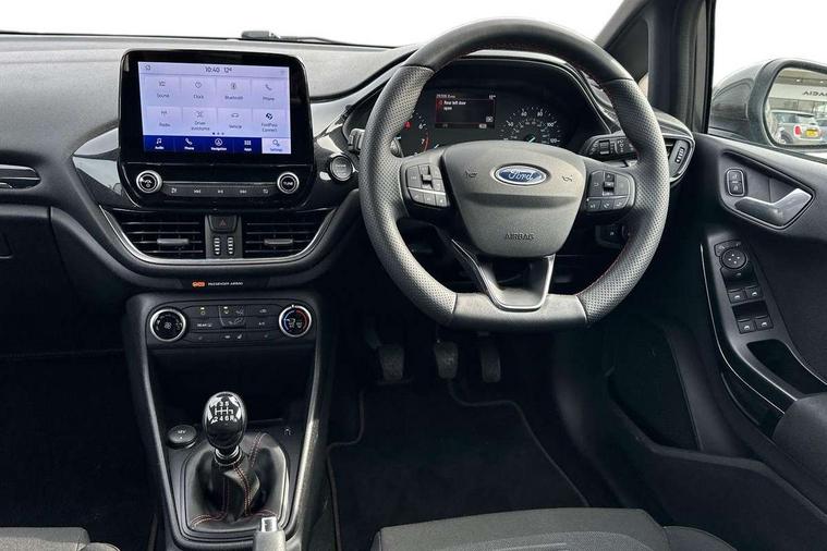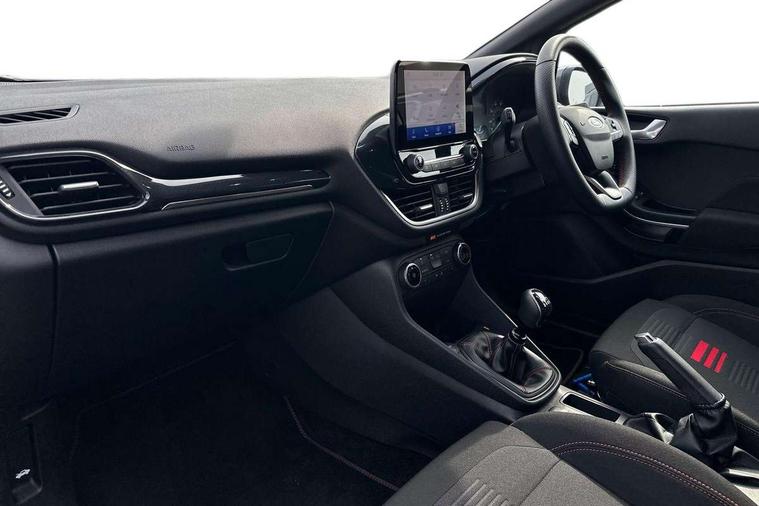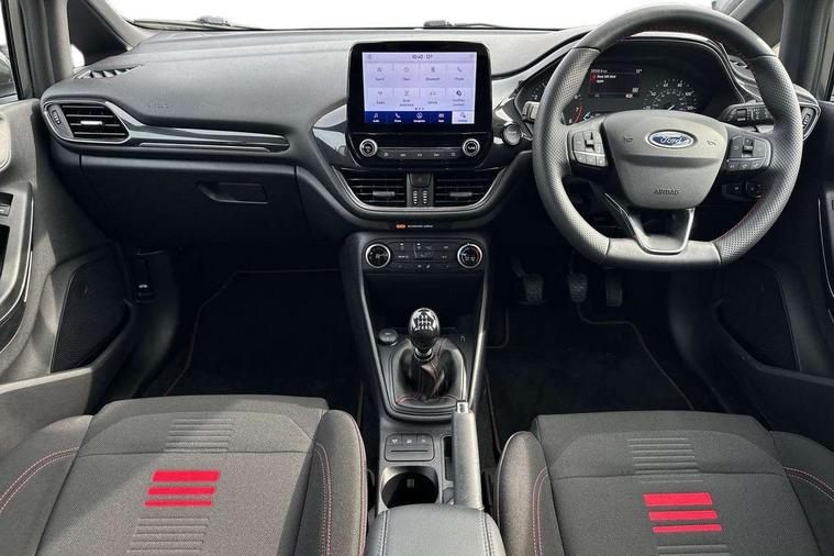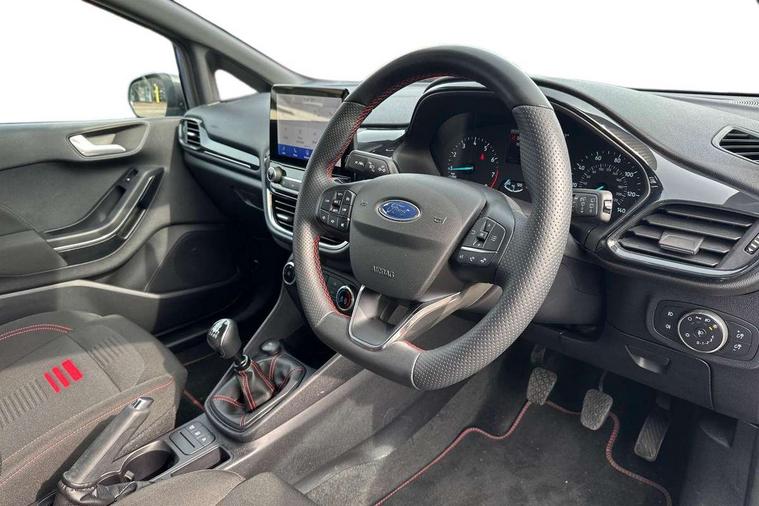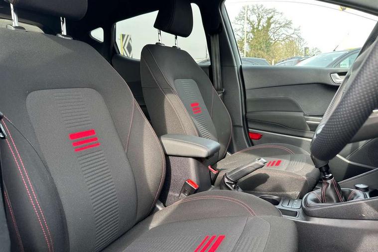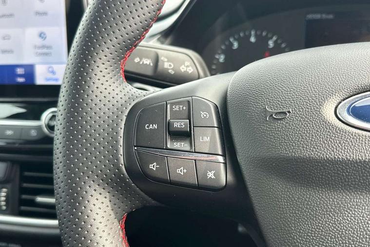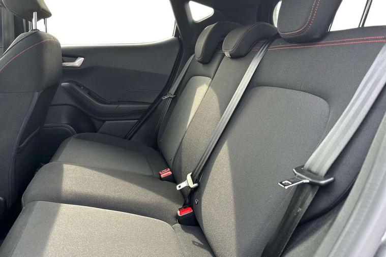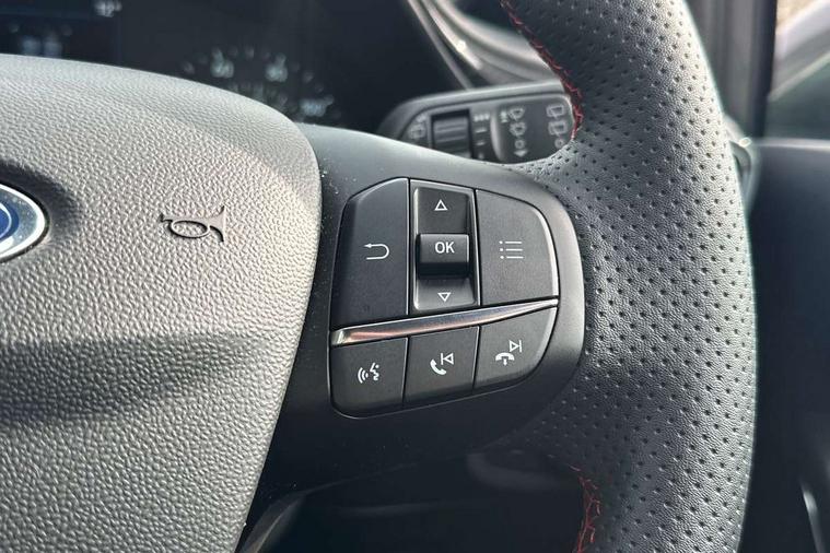 4.2" Colour TFT Ice blue illumination analogue cluster, Driver alert system, Electric power steering, Ford easy fuel, Lane keep assist, Lane keeping aid, Rear parking distance sensors, Selectable drive modes (Normal, Sport, Track), Trip computer, Sports suspension, 3rd brake light, Auto high beam, Automatic headlights, Body colour bumpers, Body colour large rear spoiler, Body coloured electrically operated with side indicators, Electric front windows/one touch facility, Electric rear windows, Quickclear heated windscreen, Rain sensing wipers and auto dimming rear view mirror, Rear privacy glass, Rear side wing doors, Rear wiper, Unique ST-Line grille, full bodystyling kit and large body coloured rear spoiler, 3 rear headrests, 3 seat bench in 2nd row, Adjustable head restraints, Black headlining, Centre console with opening armrest, 2x cupholders, 12v and USB, Cloth upholstery with red stitching, Leather gear knob, Manual 2 way passenger seat adjust, Manual 4-way driver seat adjust, Manual air conditioning, Premium floor mats, Sensico wrapped steering wheel, Single front passenger seat, 3 point seatbelts on all rear seats, Electronic stability control with hill start assist, Front and rear seat belt warning, Manual child lock in rear doors, Tyre pressure monitoring system, Keyless start with 'Ford Power' starter button, MyKey system, Remote central locking, Thatcham alarm with power door dead locks, 17" 5x2 spoke alloy wheels with rock metallic finish,