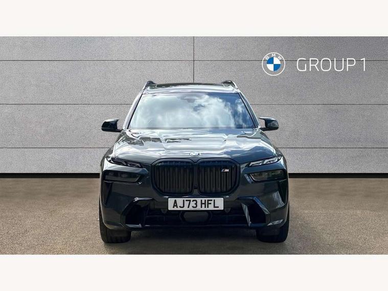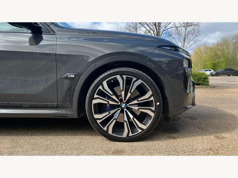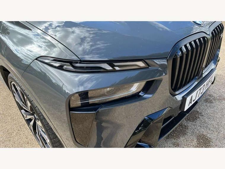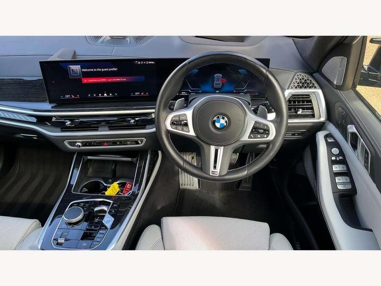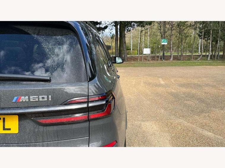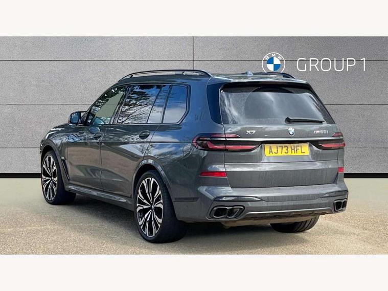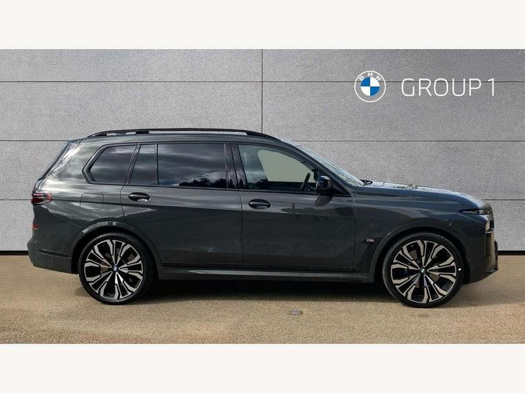 Attentiveness assist, Automatic start/stop function, Automatic tailgate operation, BMW ConnectedDrive online services, BMW Drive recorder, BMW gesture control, BMW Teleservices, Brake pad wear indicator in front and rear, Condition based service, Electric power steering with Servotronic steering optimised at all speed ranges, Integral active steering, Integrated owner's handbook, Live Cockpit Professional with head up display including 12.3" instrument cluster and 14.9" central display, Parking assistant pro including reversing assistant, PDC, lateral parking aid, reversing assist camera, parking drive off monitoring, Speed limiter, 48V Mild hybrid technology, 8 speed automatic with steptronic transmission including automatic hold function and gearshift paddles on the steering wheel, Drive experience switch with comfort mode + ECO PRO + sport mode, Executive drive suspension, M Sport differential, Permanent all wheel drive, DAB radio, Personal eSim, Acoustic glazing, Adaptive air flap control bars in high gloss black, Air breather and door claddings in high gloss chrome, Aluminium Running Board, Body coloured wheel arches, Dynamic brake lights with LED technology, Electrically adjustable and heated aspheric folding side mirrors with auto dimming, electric fold in function, automatic parking function, Exterior and central air inlets in front bumper painted pearl chrome, Follow me home headlight function, Frameless interior mirror, Front and rear electric windows, Front ornamental grille struts in chrome high gloss, Heated windscreen washer nozzles, High beam assist, High gloss black shadow line roof rails, High gloss black shadowline trim in side/window frame, window recess cover, window guide, B and C pillar, mirror triangle, mirror base, mirror frame, Integrated turn indicators (door), Kidney grille iconic glow, LED daytime running lights, LED rear lights, LED third brake light in rear spoiler, One piece front ornamental grille frame in pearl gloss chrome, Rain sensor with automatic headlight activation and windscreen wiper control, Rear side wing doors, Side window graphic in satinated aluminium, Sump guard front and rear painted in silver, Sun protection glazing, Trailer stabilisation logic, 12V - Power sockets with 2x centre console and 1x luggage compartment, 2 seat bench in 3rd row, 3 seat bench in 2nd row, 40:20:40 split folding rear seat backrests, Additional storage compartments, BMW inscription in front and rear door entry sills with illuminated, Centre console includes storage compartment, Compartment in front of cupholder, Driver and front passenger sunvisors with illuminated vanity mirrors and ticket holder, Electrical steering column with adjustable height and length with activation and control on the steering column, Front and rear colour co-ordinated with all standard carpet colours, Front and rear door pockets, Front and rear side armrests integrated into door trim, Grab handles, Height adjustable front headrests, Height adjustable rear headrests, Illuminated front left and right inscription M60i, Lockable glove compartment, M leather steering wheel, Nano filter, Single front passenger seat, Soft close doors, Storage tray and compartment with lid in centre console, Wireless charging tray, Additional storage compartment pack - X7, Ambient light interior pack - X7, Connected Package Professional - X7, Interior lighting pack - X7, Luggage compartment pack - X7, M aerodynamics pack - X7, M sport package pro - X7, 3 point seatbelts on all seats, front pyrotechnic belt tensioners, stopper and belt force limiters, front and outer rear seats, Acoustic protection for pedestrians, Active protection, Airbag - Front driver and passenger, side airbags and Head airbags, Anti lock braking system (ABS) with cornering brake control, Automatic Stability Control (ASC), BMW emergency call, Child seat ISOFIX attachment rear outer seats in 2nd row and both seats in 3rd row includes top tether, Comfort cushion seats for outer seats in 2nd row, Crash sensor inclu activation of airbags, interior light, safety battery terminal clamp, hazard warn flasher, unlock doors, deactivation of fuel pump, DSC - Dynamic Stability Control, Dynamic Traction Control - DTC, Electromechanical parking brake with automatic drive away release and auto hold function, Front and rear brake discs with interior ventilation, Hill descent control, Integrated braking system, Manual child lock in rear doors, PC iBrake PostCrash approach control warning with light braking function, Tyre pressure monitoring system, Tyre pressure sensors, Variable torque distribution, Warning triangle and first aid kit, Alarm, Central locking including 2 vehicle keys with integrated emergency key, Comfort access system, Engine immobiliser, Locking wheel bolts, Galvanic embellisher for controls,