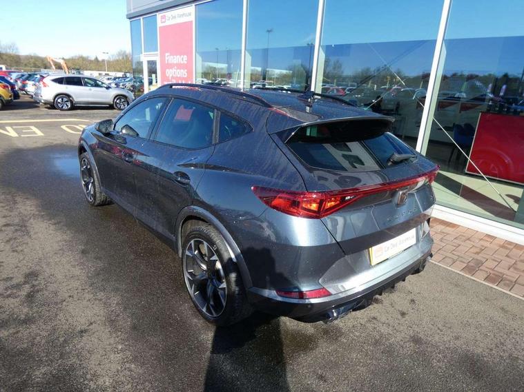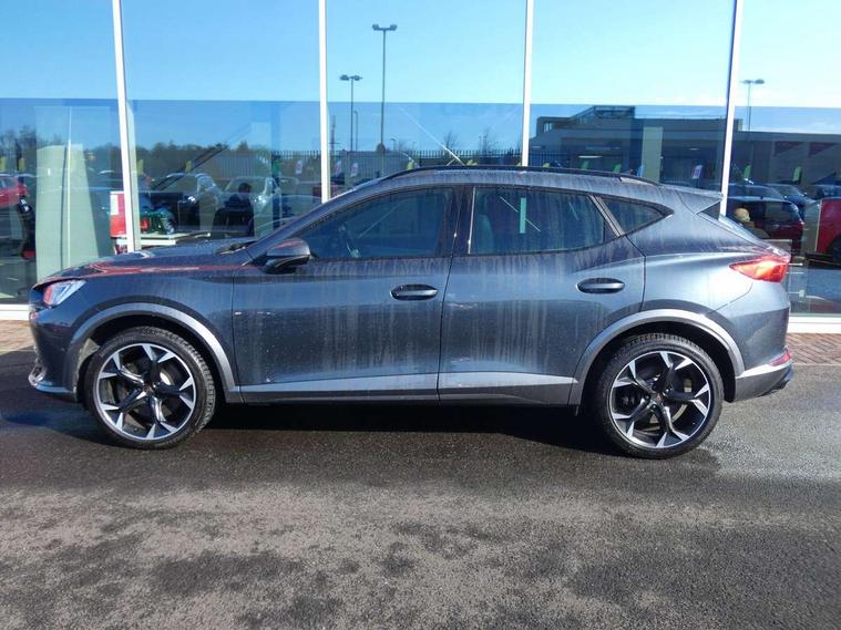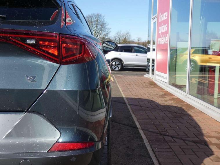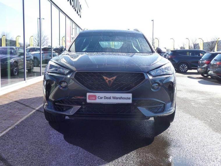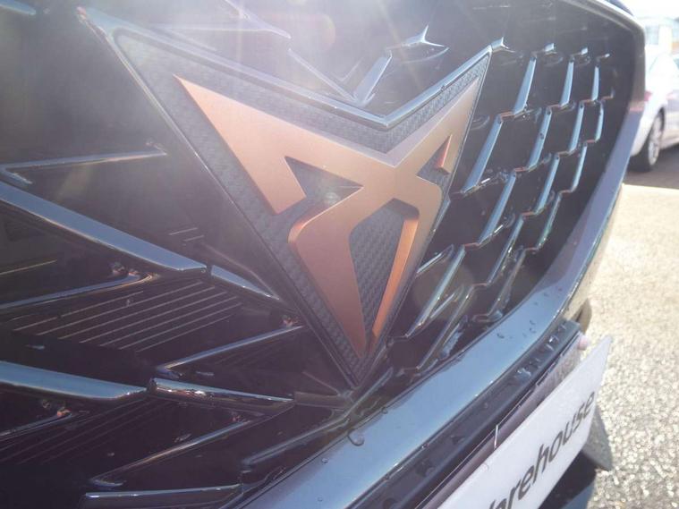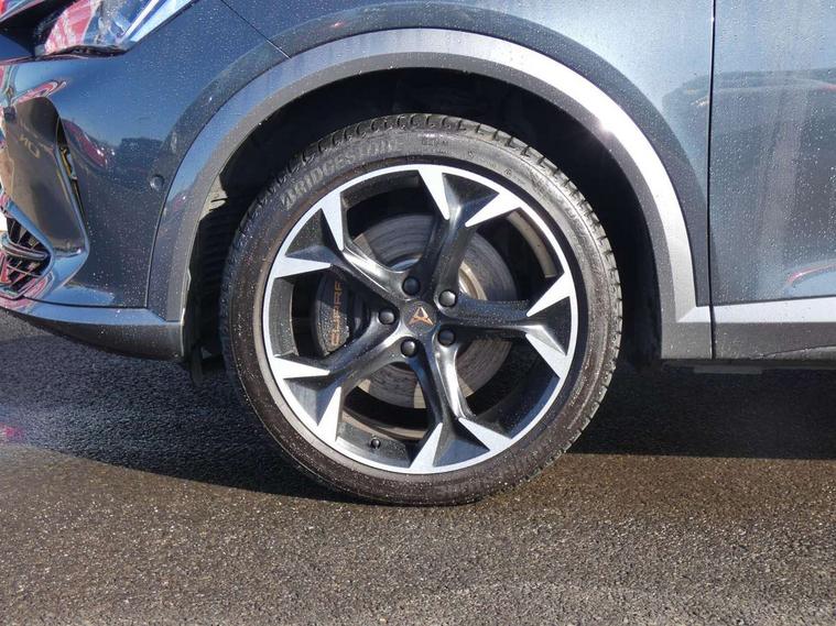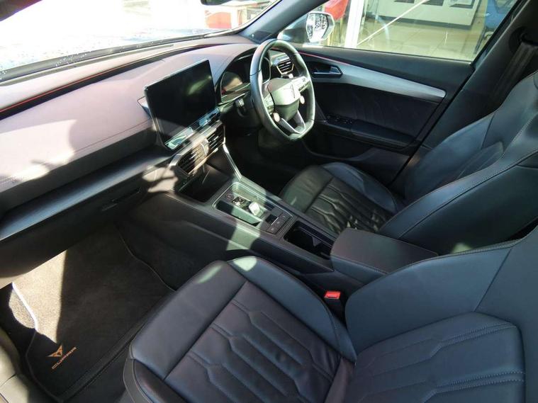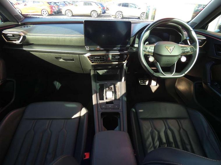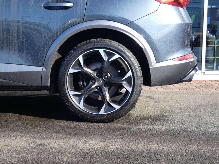 Digital cockpit and configurable dashboard, Driver alert system, Dynamic chassis control with driving profile selection (Comfort, Sport, CUPRA, Individual), E-call, Forward collision warning with automatic braking, Lane assist, Park assist (inc front/rear parking sensors), Predictive adaptive cruise control with speed limiter, RPM, trip computer, outside temp gauge, instrument light brightness, low fuel warning light, lights on reminder, gearshift indicator, Service interval indicator, Speed sensitive power steering, Start/stop system with regenerative braking, Virtual pedal and electric tailgate, Wireless apple carplay, Wireless phone charger, Electronic locking differential and dynamic traction support, Sports suspension with front shock absoption, 2 front and 2 rear USB type C sockets, Auxiliary input socket, DAB radio, Auto dimming rear view mirror, Body colour door handles, Body coloured bumpers, Dark grey wing mirror, Daytime running light with automatic headlight control and coming home feature, Dynamic headlight range control, Electric front/rear windows, Electrically adjustable heated and folding door mirrors with memory function, Front fog lamps with cornering function, Gloss black roof rails and window surrounds, LED Headlights, LED Taillights with dynamic indicator, Rain sensing wipers, Rear diffuser with twin exhaust pipe on each side, Rear side wing doors, Rear wash/wipe, Sports bumpers, Third brake light, Tinted rear windows, VZ logo rear badging, Welcome lights, 12v power supply in centre console, 12V socket, 12v socket in loadspace, 2 front and 2 rear reading lights, 230V socket, 3 seat bench in 2nd row, 60/40 split rear bench seat with armrest and mechanical seat release, Black headlining, Cupra sports pedals, Dust/pollen filter, Front and rear head restraints, Front centre armrest, Height/reach adjust steering wheel, Illuminated interior front door sills, Illuminated sunvisor with mirror, Isofix, Leather heated multi-function sports steering wheel with start stop, CUPRA mode button and gear shift paddles, Luggage tie-down hooks, Single front passenger seat, Three zone climate control with control panel in rear, Variable luggage/load compartment floor, Wraparound lighting, Genuine Nappa leather Pack - Cupra, Navigation system pack - Formentor, Safety and driving pack (XL) - Formentor, 3 point seatbelts on all rear seats, ABS, Brake control system - ESC and brake booster, Child proof door locks, Driver and front passenger airbags with front passenger airbag de-activation, Electronic parking brake, Front and rear disc brakes, Front side curtain airbags, Hill hold control, Seat belt reminder for front and rear seats, Tyre pressure monitoring system, Anti theft alarm system, Keyless entry and start system (KESSY), Locking wheel bolts, Copper and aluminium interior detailing, 19" 'Exclusive' machined sport matte black and silver alloy wheels, Space saver spare wheel,