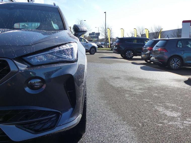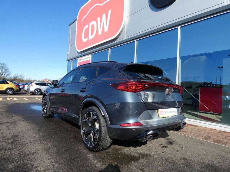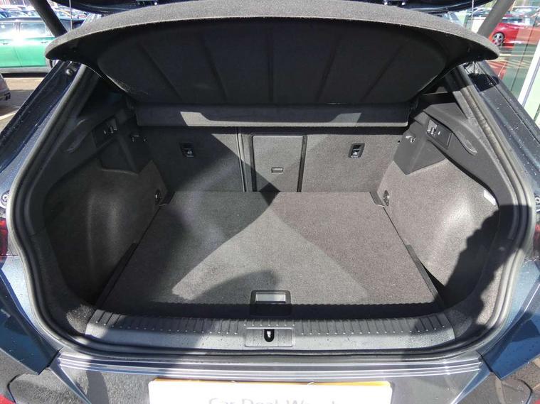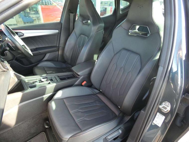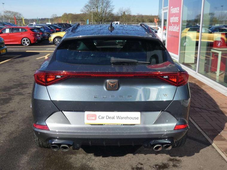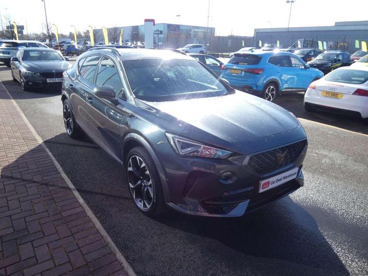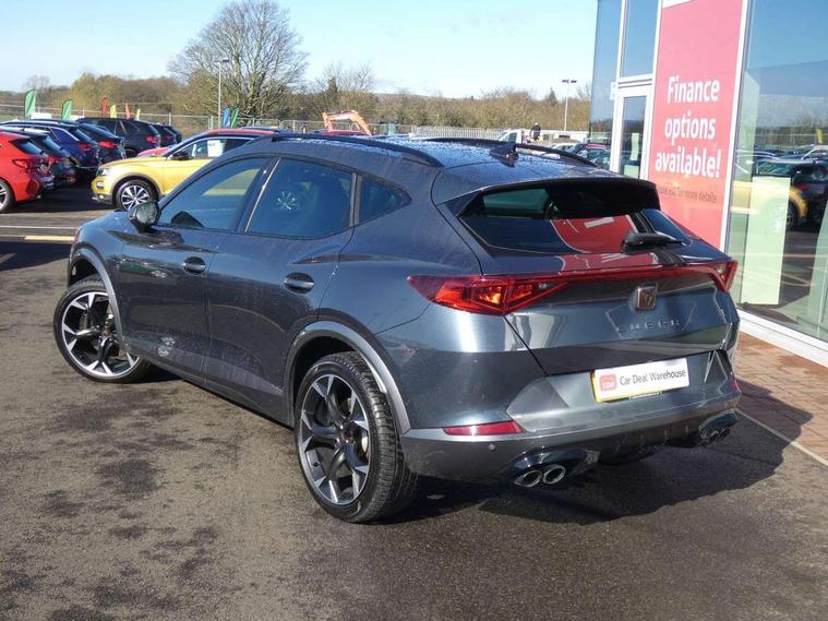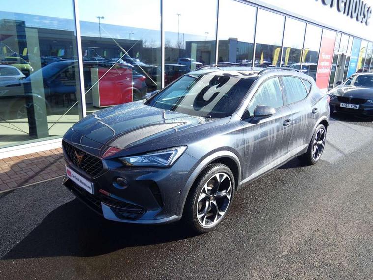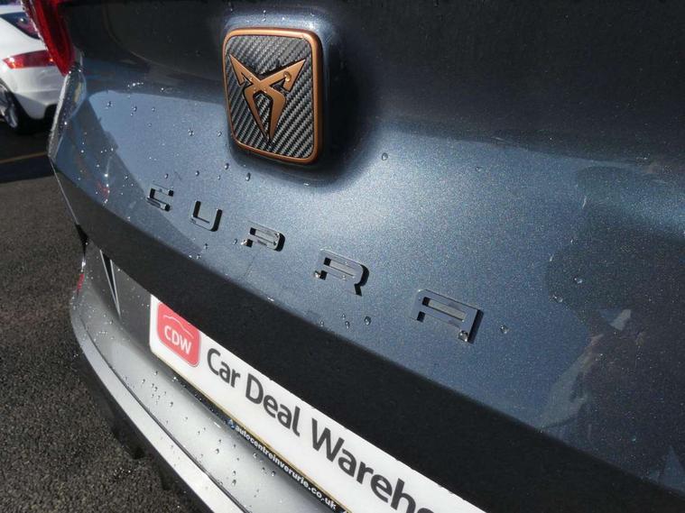 Digital cockpit and configurable dashboard, Driver alert system, Dynamic chassis control with driving profile selection (Comfort, Sport, CUPRA, Individual), E-call, Forward collision warning with automatic braking, Lane assist, Park assist (inc front/rear parking sensors), Predictive adaptive cruise control with speed limiter, RPM, trip computer, outside temp gauge, instrument light brightness, low fuel warning light, lights on reminder, gearshift indicator, Service interval indicator, Speed sensitive power steering, Start/stop system with regenerative braking, Virtual pedal and electric tailgate, Wireless apple carplay, Wireless phone charger, Electronic locking differential and dynamic traction support, Sports suspension with front shock absoption, 2 front and 2 rear USB type C sockets, Auxiliary input socket, DAB radio, Auto dimming rear view mirror, Body colour door handles, Body coloured bumpers, Dark grey wing mirror, Daytime running light with automatic headlight control and coming home feature, Dynamic headlight range control, Electric front/rear windows, Electrically adjustable heated and folding door mirrors with memory function, Front fog lamps with cornering function, Gloss black roof rails and window surrounds, LED Headlights, LED Taillights with dynamic indicator, Rain sensing wipers, Rear diffuser with twin exhaust pipe on each side, Rear side wing doors, Rear wash/wipe, Sports bumpers, Third brake light, Tinted rear windows, VZ logo rear badging, Welcome lights, 12v power supply in centre console, 12V socket, 12v socket in loadspace, 2 front and 2 rear reading lights, 230V socket, 3 seat bench in 2nd row, 60/40 split rear bench seat with armrest and mechanical seat release, Black headlining, Cupra sports pedals, Dust/pollen filter, Front and rear head restraints, Front centre armrest, Height/reach adjust steering wheel, Illuminated interior front door sills, Illuminated sunvisor with mirror, Isofix, Leather heated multi-function sports steering wheel with start stop, CUPRA mode button and gear shift paddles, Luggage tie-down hooks, Single front passenger seat, Three zone climate control with control panel in rear, Variable luggage/load compartment floor, Wraparound lighting, Genuine Nappa leather Pack - Cupra, Navigation system pack - Formentor, Safety and driving pack (XL) - Formentor, 3 point seatbelts on all rear seats, ABS, Brake control system - ESC and brake booster, Child proof door locks, Driver and front passenger airbags with front passenger airbag de-activation, Electronic parking brake, Front and rear disc brakes, Front side curtain airbags, Hill hold control, Seat belt reminder for front and rear seats, Tyre pressure monitoring system, Anti theft alarm system, Keyless entry and start system (KESSY), Locking wheel bolts, Copper and aluminium interior detailing, 19" 'Exclusive' machined sport matte black and silver alloy wheels, Space saver spare wheel,
