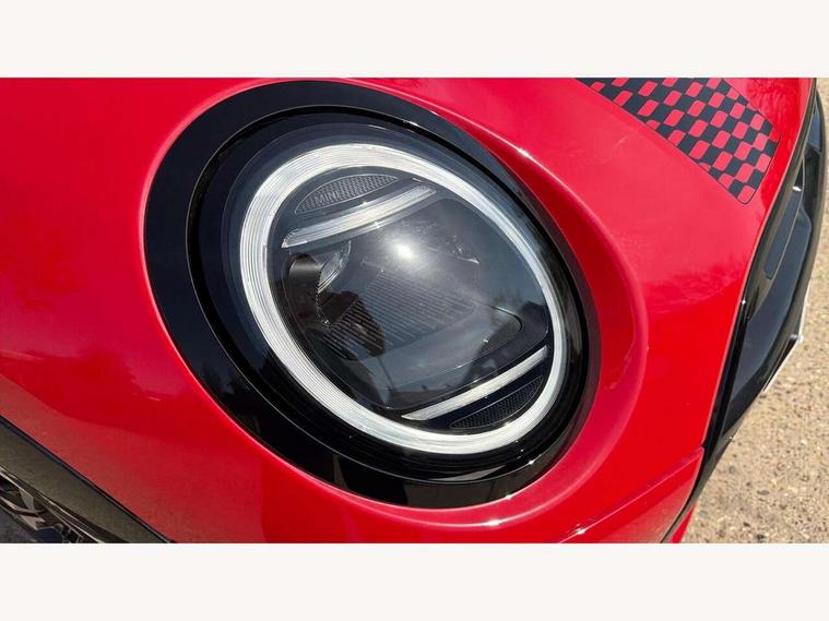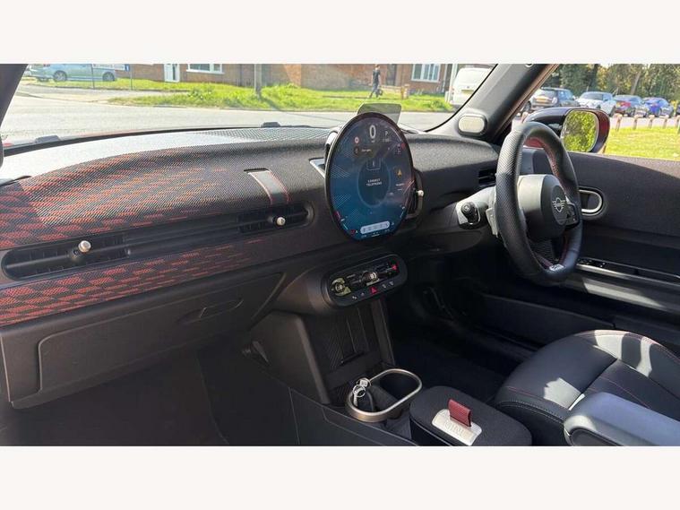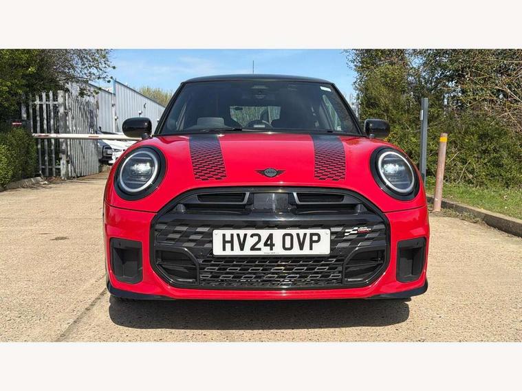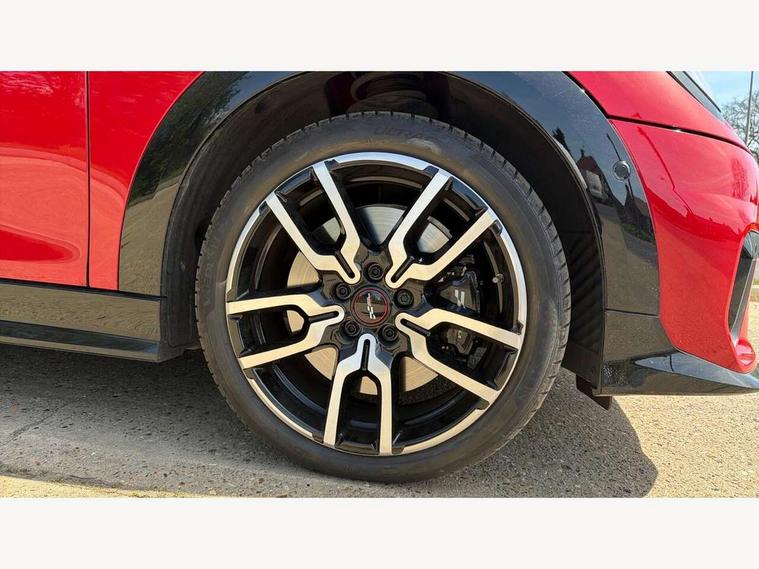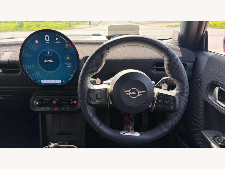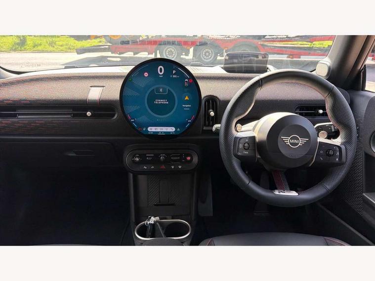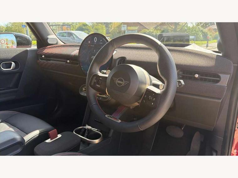 Central toggle bar, Circular OLED Screen, Compatible mobile phone bluetooth with audio streaming, Cruise control, Digital instrument cluster, Electro-mechanical speed dependant steering assistance, Emergency call service, MINI Experience Modes, Mini navigation system, On board computer, Service interval indicator, 7 speed steptronic sport transmission with double clutch, Adaptive suspension, DAB Digital radio, Personal eSim, Auto headlights, Electric adjustable heated door mirrors, Electric front windows, Front and rear apron, Heated rear window, Heated windscreen washer jets, High gloss black wheel arches, High gloss hexagonal patterned grill surround, JCW body kit, LED daytime running lights, LED indicator lights, LED rear lights, Rain sensor window wipers, Rear fog lights, Rear roof spoiler with airblades, Rear window wiper, Third brake light, 2 seat bench in second row, 2 zone automatic air conditioning, 60/40 rear seat bench, Ambient lighting, Cupholders, Dark headliner, Floor mats, Front and rear head restraints, Front compact armrest, Heated steering wheel, Height adjustable passenger seat, Lidded storage box in Black/Red knit, Luggage compartment lighting, Perforated Vescin steering wheel, Single front passenger seat, Steering wheel paddle shift, Sunvisors with vanity mirrors, Vescin/Cord upholstery, Driving assistant pack - Cooper Hatchback, Level 1 pack - Mini Hatchback, Park assistant pack - Cooper Hatchback, 3 point seatbelts on all four seats, 6 Airbags - front, side, head and seat belt tensioners, Acoustic pedestrian protection, Anti-lock braking system (ABS), Brake caliper in Black with JCW badge, DSC - Dynamic Stability Control, Electronic parking brake, Front and rear disc brakes, Front ISOFIX (iSize), Front passenger airbag deactivation, JCW Sport Brakes, Traction control, Tyre pressure monitoring system, Alarm, Immobiliser, Remote central locking, Black/Red decorative dash strap, JCW Black/Red dashboard knit, 18" JCW Lap spoke 2-tone alloy wheels, Tyre repair kit,
