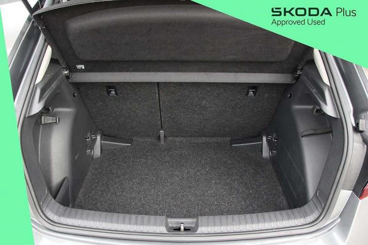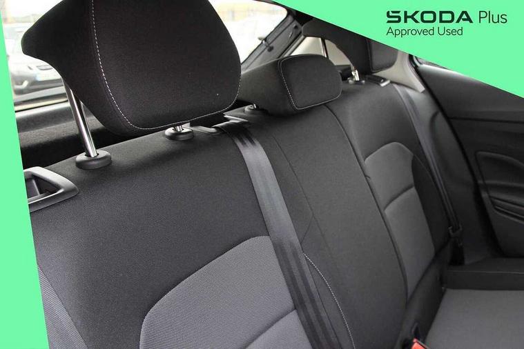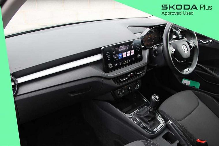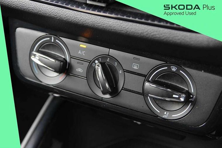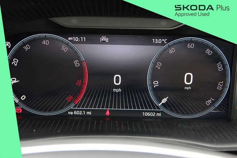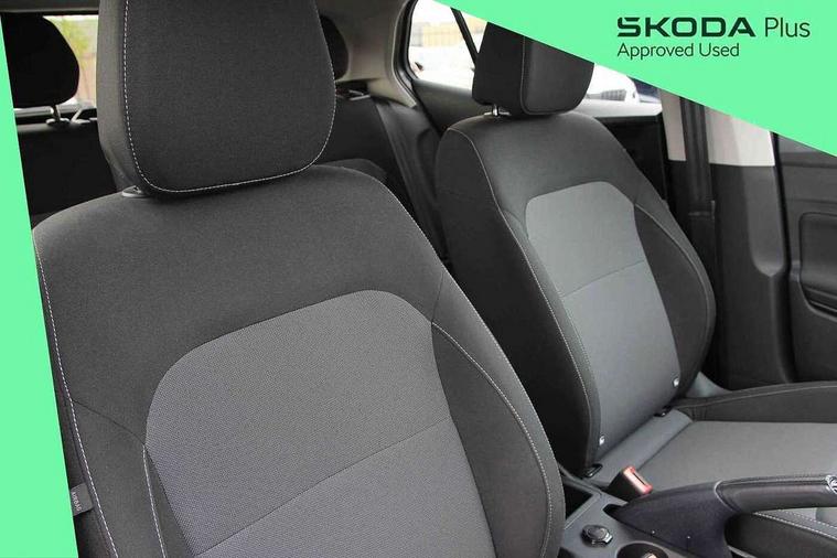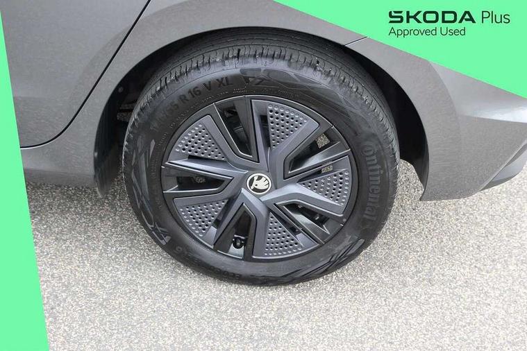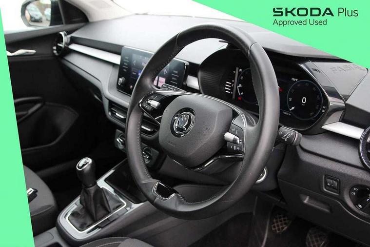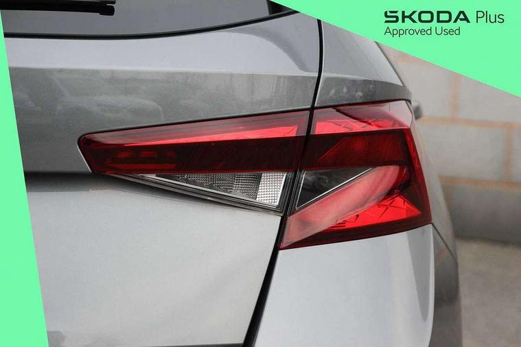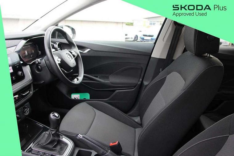 Bluetooth connection, Driver alert system - DAS, Electromechanical power steering, Exterior temperature gauge, Lane assist including road edge detection, Service interval indicator, Virtual cockpit with 10.25" colour display, 2x USB-C in the front (for data transmission and charging), 6 Speakers (4 in front and 2 in rear), Auxiliary socket for external MP3 player, Bolero radio with 8" colour display, DAB digital radio reception, Body coloured bumpers, Dimming rear view mirror with black frame, Door mirror integrated indicators, Electrically adjustable and heated door mirrors, Electrically adjustable front windows with function auto up/down, Front window wiper intermittent control, Headlight range control - Automatic, Ice scraper in fuel cap, LED daytime running lights with coming and leaving home feature, Mechanical adjustable rear windows, Privacy glass, Rear LED fog light, Rear side wing doors, Rear window wiper with washing nozzles, Roof mounted spoiler, SKODA tailgate lettering in chrome, Third brake light, 3 rear headrests, Backrest split and folding, Central console with fixed cup holder and storage box, Chrome handbrake release button, Fabric upholstery, Gearshift knob/handle in leather, Grain satin black interior door handles, Hand brake lever handle in leather, Height adjustable front headrests, Height adjustable steering wheel, ISOFIX and TopTether anchorage points to the outer rear seats, ISOFIX and TopTether on the front passenger seat, Luggage compartment lighting, Pollen filter, Rear seat bench unsplit, Single front passenger seat, Storm grey headlining, Sun visors with mirror and airbag label on passenger side, Ticket holder, Umbrella in drivers door, 3-point height adjustable front seats belts with pretensioner and force limiter, Automatic warning lights in case of crash, Driver and passengers airbag with switch off function, e-Call+, ESC including ABS, MSR, ASR, EDS, HBA and XDS, Front and rear seat belt warning, FRONT ASSIST (AEB City and AEB Inter Urban), Front side airbags, Head airbags, One tone horn, Pedestrian protection, Three rear 3-points safety seat belts with pretensioner and force limiter including stop function for outer rear seat belts, Tyre pressure monitoring system, Anti-theft alarm system including immobiliser, interior monitoring, backup horn, and towing protection, Anodized cross line upper decorative trim, Colour Edition air vents, Grain satin black central console cover, Grain satin black lower decorative trim, Satin black door and side trim panel in front, Anti-theft wheel bolts protection, Super-low rolling resistance tyres,