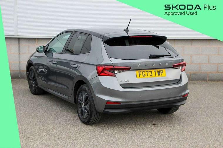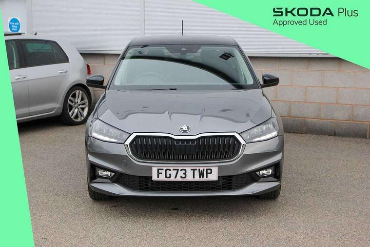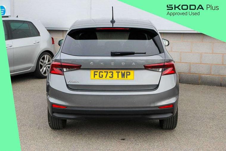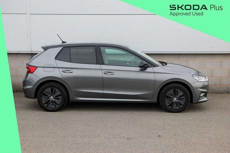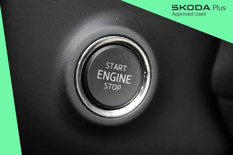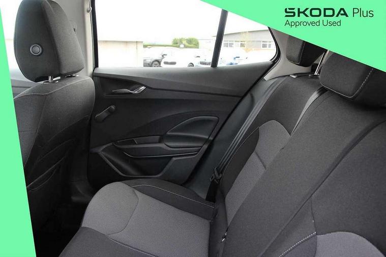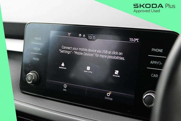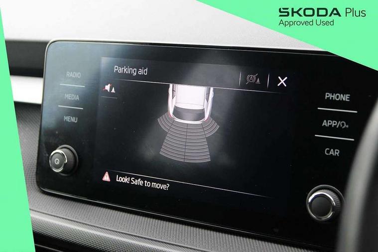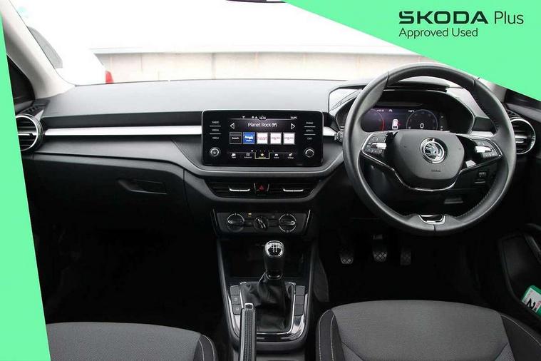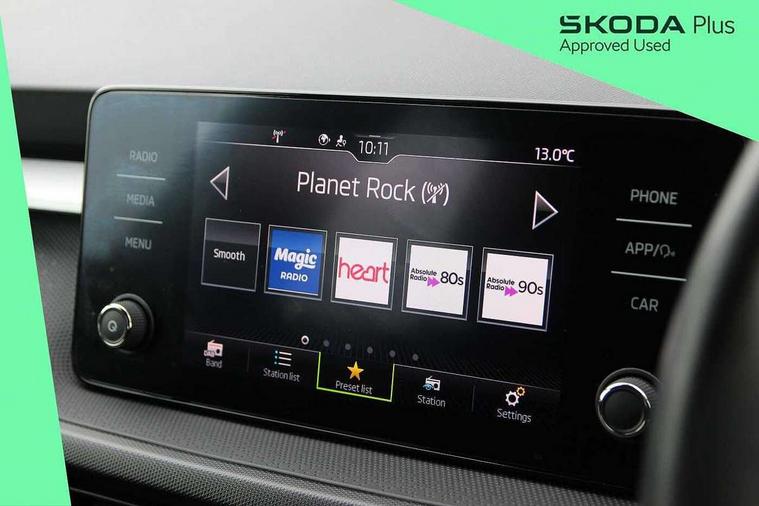 Bluetooth connection, Driver alert system - DAS, Electromechanical power steering, Exterior temperature gauge, Lane assist including road edge detection, Service interval indicator, Virtual cockpit with 10.25" colour display, 2x USB-C in the front (for data transmission and charging), 6 Speakers (4 in front and 2 in rear), Auxiliary socket for external MP3 player, Bolero radio with 8" colour display, DAB digital radio reception, Body coloured bumpers, Dimming rear view mirror with black frame, Door mirror integrated indicators, Electrically adjustable and heated door mirrors, Electrically adjustable front windows with function auto up/down, Front window wiper intermittent control, Headlight range control - Automatic, Ice scraper in fuel cap, LED daytime running lights with coming and leaving home feature, Mechanical adjustable rear windows, Privacy glass, Rear LED fog light, Rear side wing doors, Rear window wiper with washing nozzles, Roof mounted spoiler, SKODA tailgate lettering in chrome, Third brake light, 3 rear headrests, Backrest split and folding, Central console with fixed cup holder and storage box, Chrome handbrake release button, Fabric upholstery, Gearshift knob/handle in leather, Grain satin black interior door handles, Hand brake lever handle in leather, Height adjustable front headrests, Height adjustable steering wheel, ISOFIX and TopTether anchorage points to the outer rear seats, ISOFIX and TopTether on the front passenger seat, Luggage compartment lighting, Pollen filter, Rear seat bench unsplit, Single front passenger seat, Storm grey headlining, Sun visors with mirror and airbag label on passenger side, Ticket holder, Umbrella in drivers door, 3-point height adjustable front seats belts with pretensioner and force limiter, Automatic warning lights in case of crash, Driver and passengers airbag with switch off function, e-Call+, ESC including ABS, MSR, ASR, EDS, HBA and XDS, Front and rear seat belt warning, FRONT ASSIST (AEB City and AEB Inter Urban), Front side airbags, Head airbags, One tone horn, Pedestrian protection, Three rear 3-points safety seat belts with pretensioner and force limiter including stop function for outer rear seat belts, Tyre pressure monitoring system, Anti-theft alarm system including immobiliser, interior monitoring, backup horn, and towing protection, Anodized cross line upper decorative trim, Colour Edition air vents, Grain satin black central console cover, Grain satin black lower decorative trim, Satin black door and side trim panel in front, Anti-theft wheel bolts protection, Super-low rolling resistance tyres,