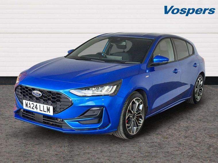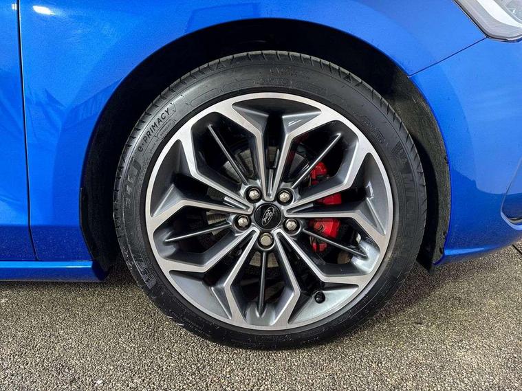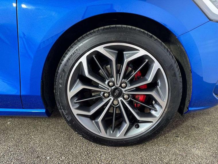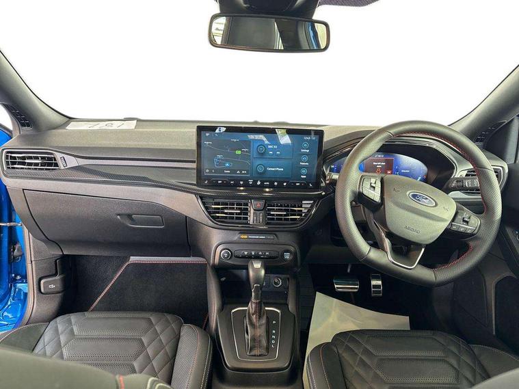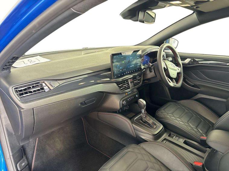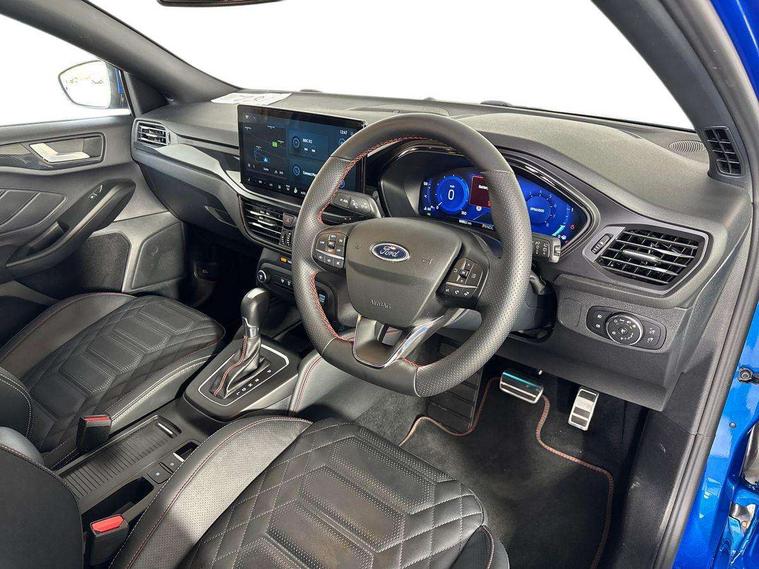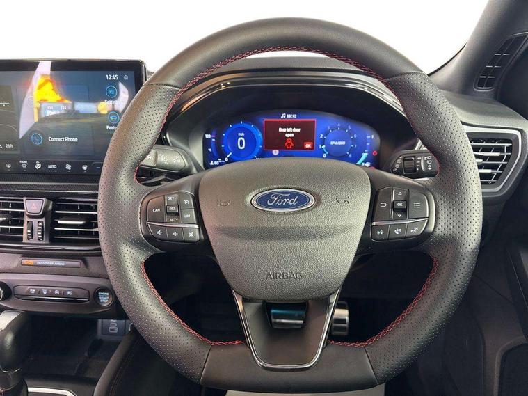 12.3" Digital instrument cluster, Bluetooth system, Digital clock, Easy fuel capless refuelling system, Eco mode, Ford SYNC4 Nav with 13.2'' touchscreen, DAB, Emergency Assistance, Apple Carplay & Android Auto, B&O Premium Audio with 10 speakers, FordPass Connect, Lane keeping system - lane keeping alert and lane keeping aid, PAS, Rev counter, Selectable drive mode, Service interval indicator, Trip computer, Wireless charging pad, Sports tuned suspension, 2 USB ports, Auto headlamps (on/off), Body coloured door handles, Electrically operated front and rear windows with one touch opening and closing, Electrically operated heated power fold door mirrors with puddle lamp with side indicators, Front variable intermittent wipers with electric wash, Heated rear window, LED daytime running lamp, LED rear lamps, LED third brake light, Polished twin tailpipe, Privacy glass, Quickclear heated windscreen, Rain sensor, Rear side wing doors, Tailgate wash/wipe, Unique ST-Line grille, full bodystyling kit, and large body coloured rear roof spoiler, 3 rear headrests, 3 seat bench in 2nd row, Dual zone electronic air temperature control, Full sensico premium upholstery, Height adjustable front headrests, Isofix child seat preparation, Load through ski hatch, Manual 2-way passenger seat adjust, Power 4-way driver seat adjust, with power lumbar adjust, Reach + rake adjustable steering column, Single front passenger seat, ST-Line Design pack - Focus, Winter pack - Focus, 3x3 point rear seatbelts, ABS+Electronic Brake force Distribution, Auto hold function, Driver airbag, EDL traction control, Electronic parking brake, Electronic stability control, Front and rear seatbelt reminder, Front inertia reel height adjustable seatbelts with pre-tensioners, Front passenger airbag, Front side airbags, Passenger airbag deactivate switch, Post collision braking, Pre collision assist with autonomous emergency braking and pedestrian/cyclist detection, Remote/power child rear door locks, Side curtain airbags, Three rear inertia reel lap/diagonal seatbelts, Tyre pressure monitoring system, Keyless entry and keyless start, MyKey system, Remote central locking & engine immobiliser, Thatcham alarm with power door dead locks, 18" 5x3 spoke pearl grey high gloss machined finish alloy wheels with mini spare wheel,