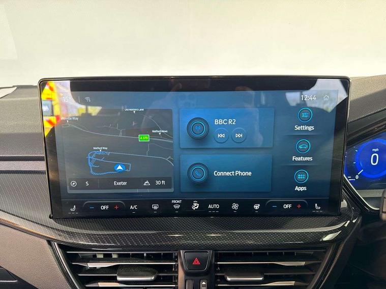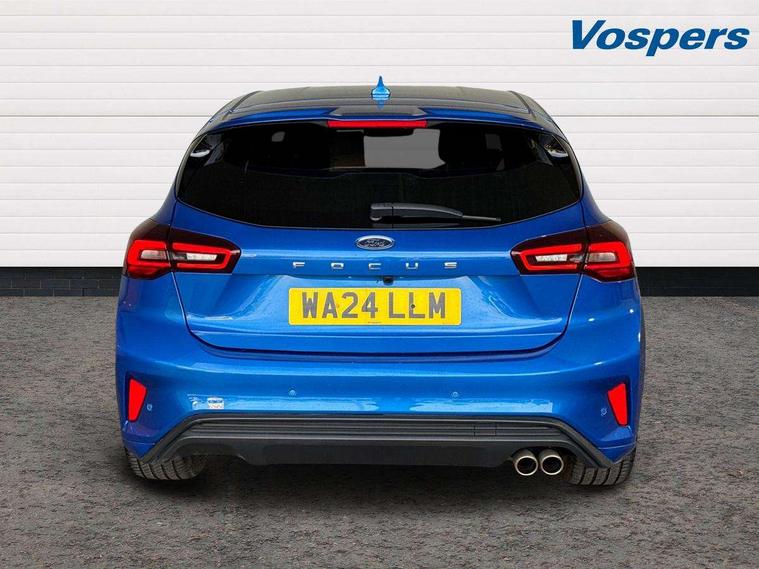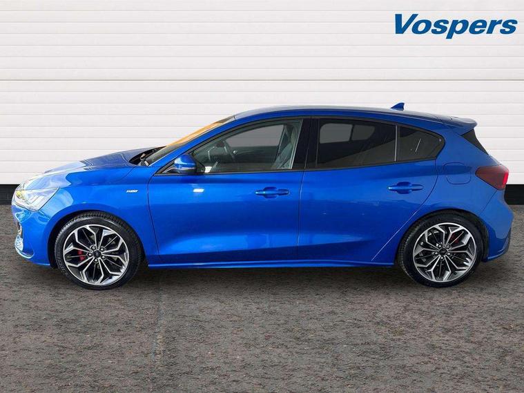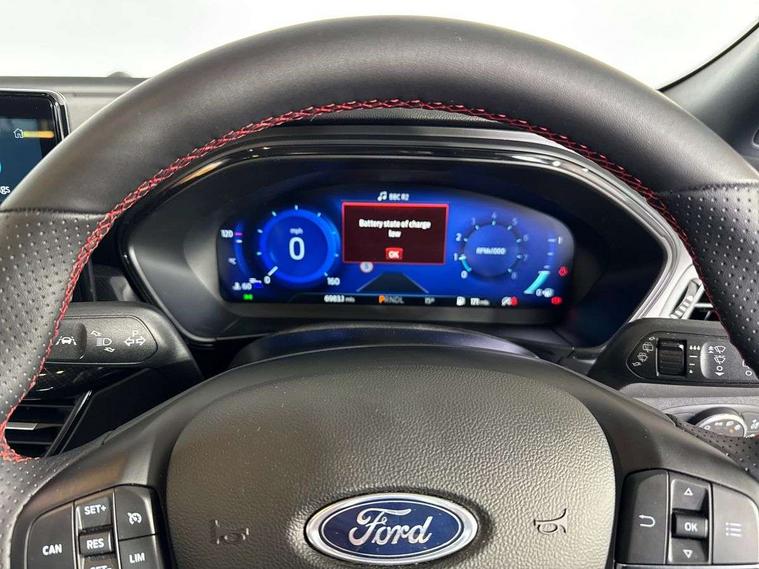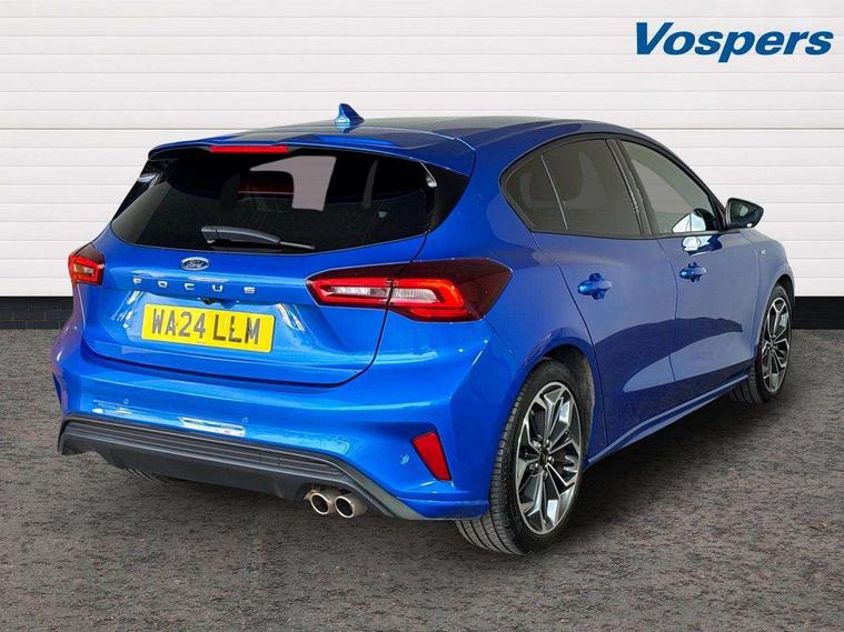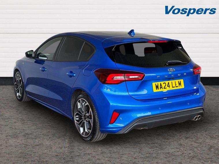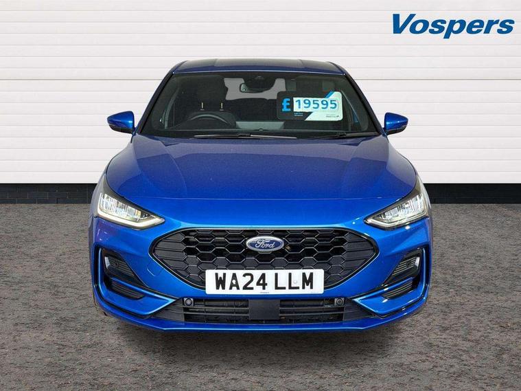 12.3" Digital instrument cluster, Bluetooth system, Digital clock, Easy fuel capless refuelling system, Eco mode, Ford SYNC4 Nav with 13.2'' touchscreen, DAB, Emergency Assistance, Apple Carplay & Android Auto, B&O Premium Audio with 10 speakers, FordPass Connect, Lane keeping system - lane keeping alert and lane keeping aid, PAS, Rev counter, Selectable drive mode, Service interval indicator, Trip computer, Wireless charging pad, Sports tuned suspension, 2 USB ports, Auto headlamps (on/off), Body coloured door handles, Electrically operated front and rear windows with one touch opening and closing, Electrically operated heated power fold door mirrors with puddle lamp with side indicators, Front variable intermittent wipers with electric wash, Heated rear window, LED daytime running lamp, LED rear lamps, LED third brake light, Polished twin tailpipe, Privacy glass, Quickclear heated windscreen, Rain sensor, Rear side wing doors, Tailgate wash/wipe, Unique ST-Line grille, full bodystyling kit, and large body coloured rear roof spoiler, 3 rear headrests, 3 seat bench in 2nd row, Dual zone electronic air temperature control, Full sensico premium upholstery, Height adjustable front headrests, Isofix child seat preparation, Load through ski hatch, Manual 2-way passenger seat adjust, Power 4-way driver seat adjust, with power lumbar adjust, Reach + rake adjustable steering column, Single front passenger seat, ST-Line Design pack - Focus, Winter pack - Focus, 3x3 point rear seatbelts, ABS+Electronic Brake force Distribution, Auto hold function, Driver airbag, EDL traction control, Electronic parking brake, Electronic stability control, Front and rear seatbelt reminder, Front inertia reel height adjustable seatbelts with pre-tensioners, Front passenger airbag, Front side airbags, Passenger airbag deactivate switch, Post collision braking, Pre collision assist with autonomous emergency braking and pedestrian/cyclist detection, Remote/power child rear door locks, Side curtain airbags, Three rear inertia reel lap/diagonal seatbelts, Tyre pressure monitoring system, Keyless entry and keyless start, MyKey system, Remote central locking & engine immobiliser, Thatcham alarm with power door dead locks, 18" 5x3 spoke pearl grey high gloss machined finish alloy wheels with mini spare wheel,