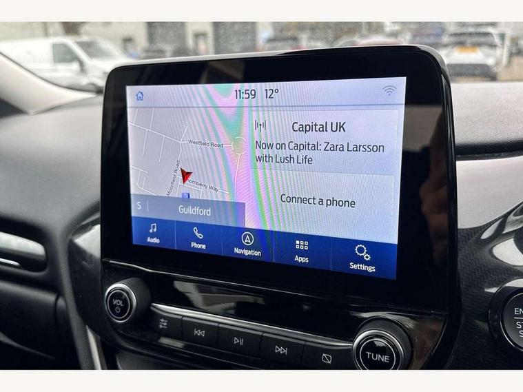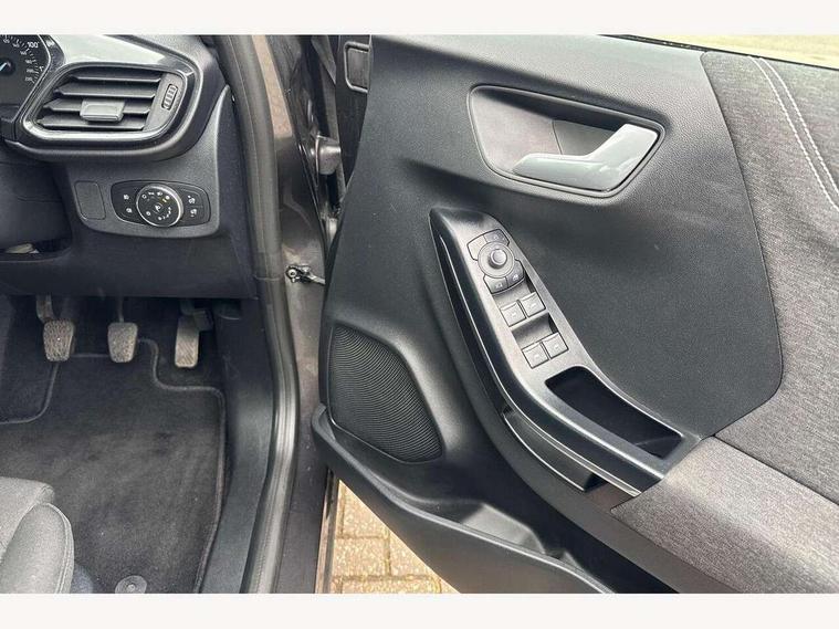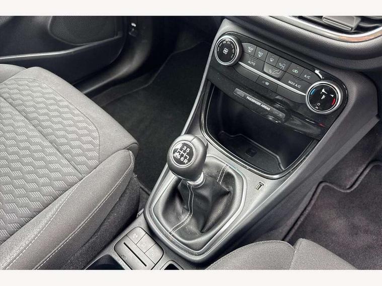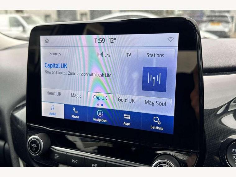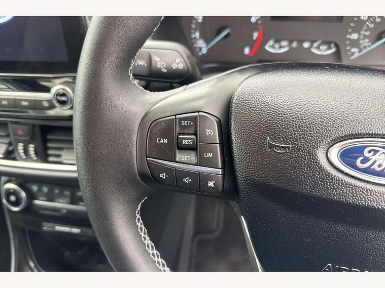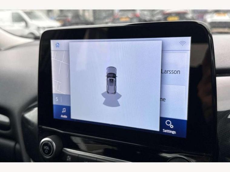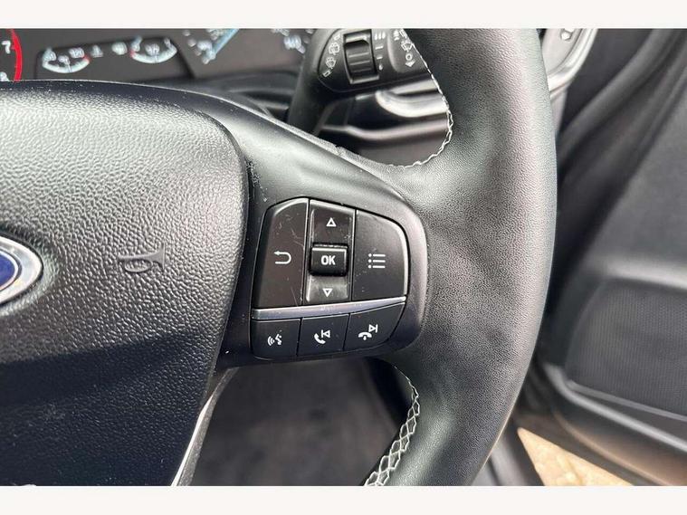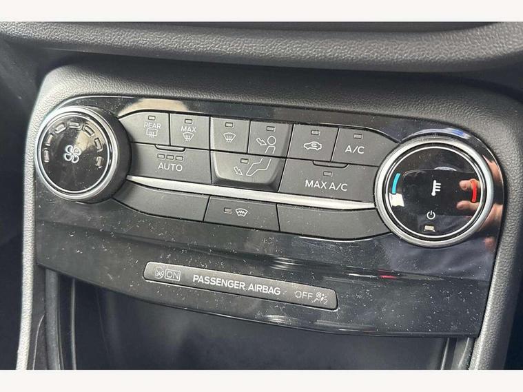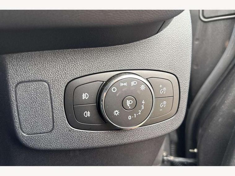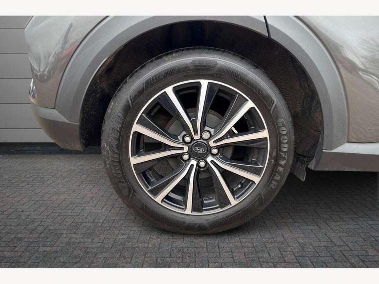 Driver impairment monitor, Emergency call service, Ford easy fuel, Lane keeping aid with lane departure warning, Power assist steering, Power start button, Rear parking sensor, Selectable drive modes(Normal, Eco, Sport, Slippery and Trail), Speed sign recognition, Standard suspension, Automatic headlights with auto high beam, Automatic rain sensing wipers, Body colour rear spoiler, LED rear lamps, Power foldable heated door mirrors with puddle lamps, Projector headlamps with LED day time running lights and front fog lamps, Quickclear heated windscreen, Rear side wing doors, Rear wiper, Third brake light, 3 seat bench in 2nd row, Centre console with armrest and stowage, Electronic automatic temperature control (EATC), Ford megabox extended bootspace, Front and rear head restraints, Front floor mats, Manual 2 way passenger seat adjustment, Manual 4 way driver seat adjust with lumbar adjustment, Sensico leather steering wheel/gear knob/handbrake, Single front passenger seat, Titanium cloth upholstery, Ford SYNC 3 navigation pack - Puma, 3 rear seatbelts, Child safety lock, Electronic stability control (ESC) and hill start assist, Pedestrian/cyclist detection & post-collision braking, Pre collision assist system, Tyre pressure monitoring system (TPMS), Thatcham alarm, 17" 10 spoke absolute black machined finish alloy wheel,