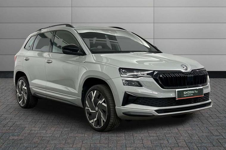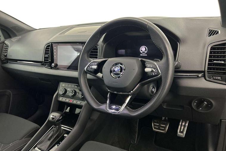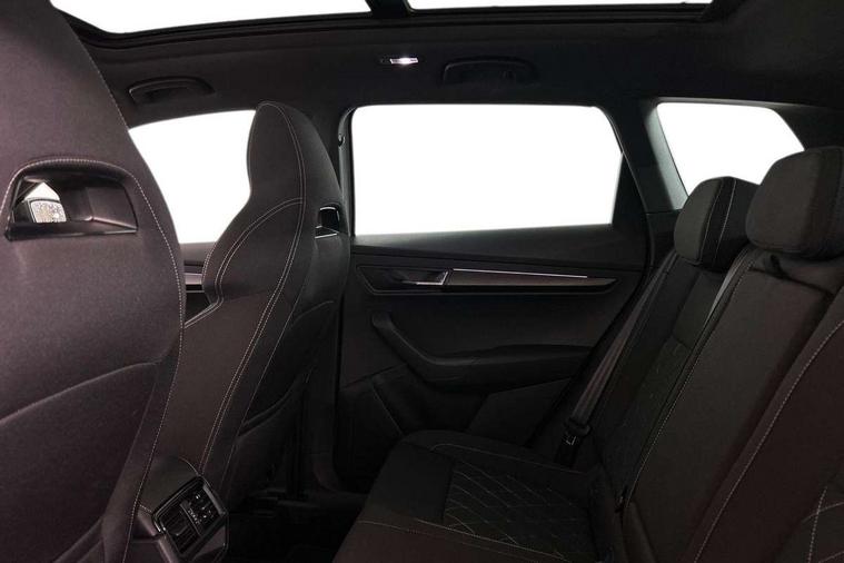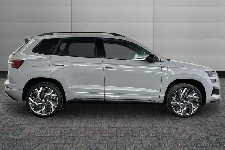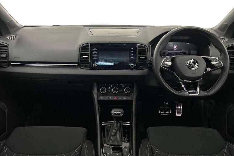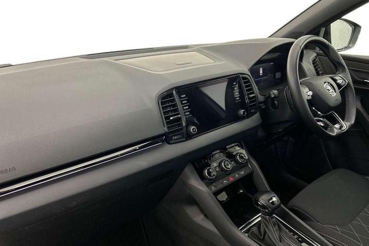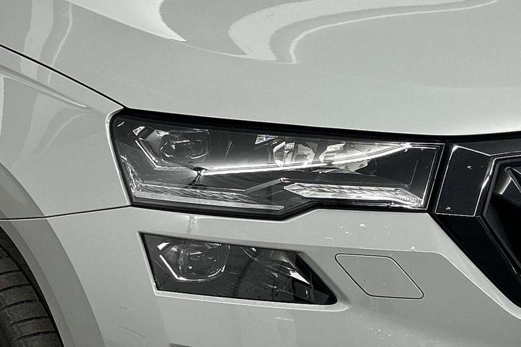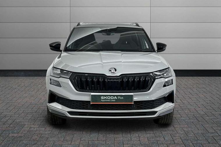8" Digital display, Care connect, Driver fatigue sensor, Emergency services call system, Outside temperature gauge, Service interval indicator, SmartLink wireless for Apple and wired for Android, Start/stop system with regenerative braking, USB C Port x 2 in front centre console, Virtual pedal with electrically operated boot door, 8 Speakers, DAB radio with Bluetooth, USB connection, Acoustic glass, Aero front windscreen wipers with intermittent function, Auto dimming rear view mirror with light and rain sensors, Black door mirrors, Black electric window control buttons, Black radiator grille, Black roof rails, Body colour door handles, Dynamic headlight range control with cornering light function, Electric front and rear windows with child proof lock, Front door steps with SportLine logo, Heated rear windscreen, LED daytime running lights, LED rear lights with high functionality welcome effect and dynamic indicators, Light assistant (coming/leaving home/tunnel light), Panoramic sliding sunroof, Plastic scuff plates, Privacy glass, Protective door side sills in body colour, Rear diffuser, Rear side wing doors, Rear spoiler, Rear window wiper with washer system and intermittent control, Safety reflectors on front doors, Skoda lettering on tailgate in black, Sportline badge on front fender, Sportline decorative inserts with badging, Sports front and rear bumpers, 1.5 litre bottle holders in driver and front passenger door panels, 12V socket in boot, 12v socket in front centre armrest with storage compartment and rear air vents, 2 Folding hooks and nets in boot, 3 rear height adjustable headrests, 3 seat bench in 2nd row, 3 spoke leather sports multifunction steering wheel and silver stitching with gear shift paddles, 4 foldable roof handles with rear coat hooks, Black floor carpet, Black roof headlining, Chrome inner door handles, Double sided boot floor, Foldable hooks in the boot, Front head restraints, Height adjustable front three point seats belts with tensioners, Height/reach adjust steering wheel, Ice scraper, Illuminated glovebox, Illuminated luggage compartment, Isofix child seat preparation outer rear, Manual lumbar support for front seats, Pen holder, Pollen filter, Rear boot cover, Rear reading lights, Rear seats fixed folding and divided 60:40, Rubbish bin door, Safety vest holder, Single front passenger seat, Storage box in upper central dashboard closed, Sunvisors with illuminated vanity mirrors, Textile floor mats, Ticket holder, Titan black interior ceiling, Welcome animation with sportline logo, Light Pack - Karoq, Parking pack - Karoq, Automatic door unlocking in case of crash, Automatic fuel cut off in case of crash, Child locks on rear doors, Driver airbag, Electronic parking brake with auto hold function, Emergency rear braking signal, ESC including ABS, MSR, ASR, EDS, HBA, DSR, RBS, MKB and traction control, Front side airbags, Hill hold control, Knee airbags, Passenger airbag with switch-off function, Pedestrian monitor, Seatbelt reminder signalisation and pretensioner for all seats, Three point seatbelts rear, Two tone horn, Tyre pressure display, Tyre pressure monitor, Alarm with interior monitoring, back up horn and tilt sensor with safe function, Electronic engine immobiliser, Keyless entry and start/stop, Remote central locking with 2 remote folding keys, Black air vent surround, Black centre console, Satin black dashboard, Satin black door trim, 19" Vega black polished alloy wheels, Anti-theft wheel bolts protection, Matt black aero hub caps, Storage on wheel cover, Tool kit,