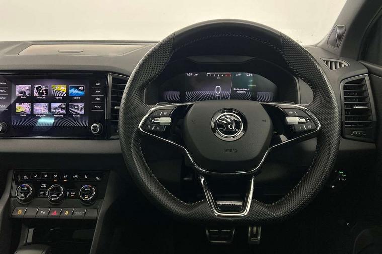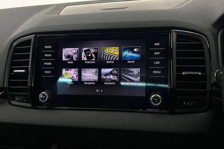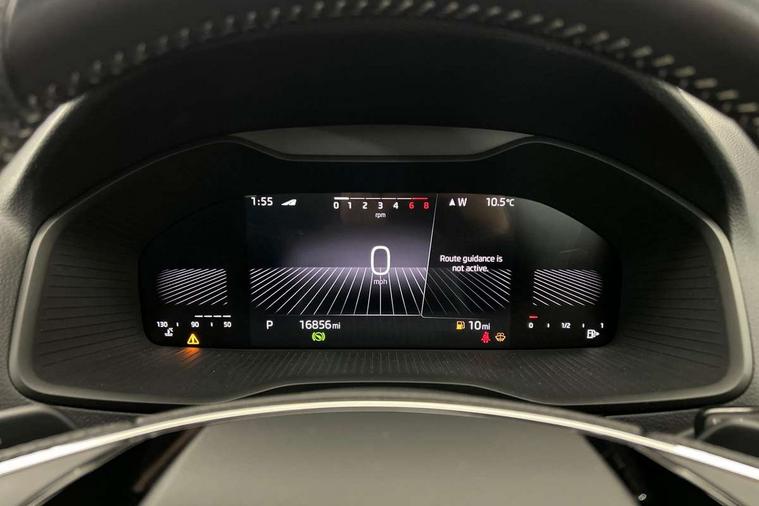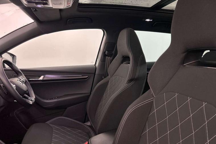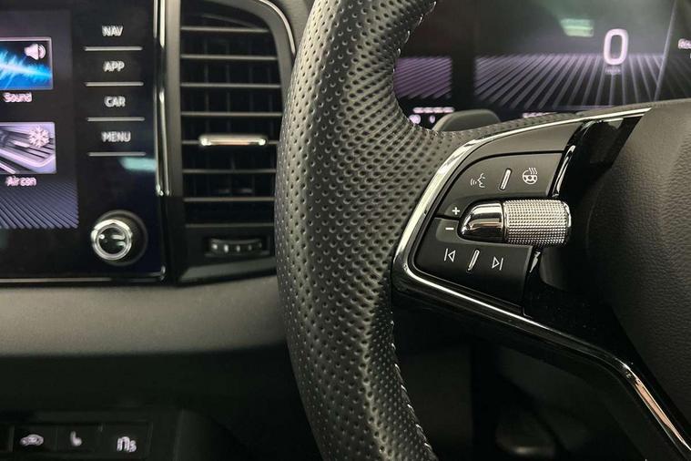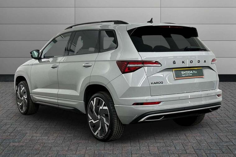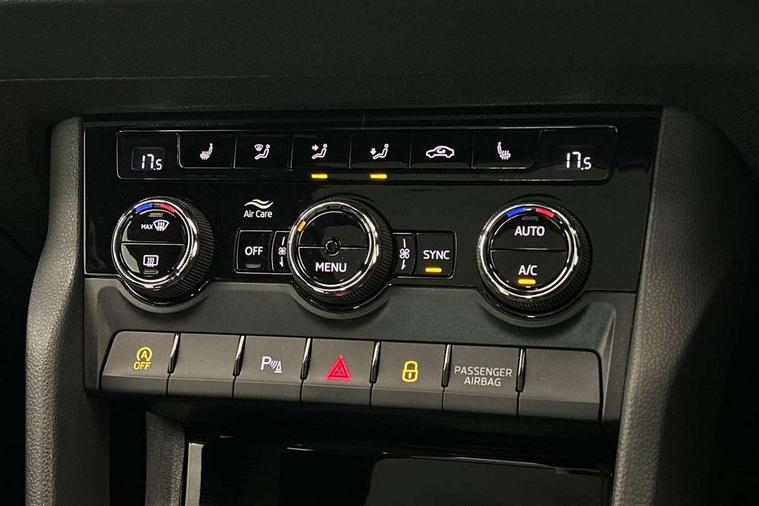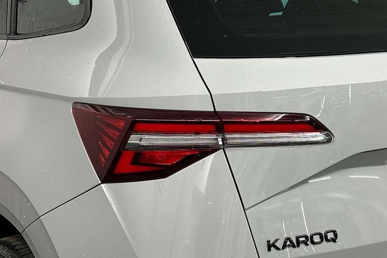 8" Digital display, Care connect, Driver fatigue sensor, Emergency services call system, Outside temperature gauge, Service interval indicator, SmartLink wireless for Apple and wired for Android, Start/stop system with regenerative braking, USB C Port x 2 in front centre console, Virtual pedal with electrically operated boot door, 8 Speakers, DAB radio with Bluetooth, USB connection, Acoustic glass, Aero front windscreen wipers with intermittent function, Auto dimming rear view mirror with light and rain sensors, Black door mirrors, Black electric window control buttons, Black radiator grille, Black roof rails, Body colour door handles, Dynamic headlight range control with cornering light function, Electric front and rear windows with child proof lock, Front door steps with SportLine logo, Heated rear windscreen, LED daytime running lights, LED rear lights with high functionality welcome effect and dynamic indicators, Light assistant (coming/leaving home/tunnel light), Panoramic sliding sunroof, Plastic scuff plates, Privacy glass, Protective door side sills in body colour, Rear diffuser, Rear side wing doors, Rear spoiler, Rear window wiper with washer system and intermittent control, Safety reflectors on front doors, Skoda lettering on tailgate in black, Sportline badge on front fender, Sportline decorative inserts with badging, Sports front and rear bumpers, 1.5 litre bottle holders in driver and front passenger door panels, 12V socket in boot, 12v socket in front centre armrest with storage compartment and rear air vents, 2 Folding hooks and nets in boot, 3 rear height adjustable headrests, 3 seat bench in 2nd row, 3 spoke leather sports multifunction steering wheel and silver stitching with gear shift paddles, 4 foldable roof handles with rear coat hooks, Black floor carpet, Black roof headlining, Chrome inner door handles, Double sided boot floor, Foldable hooks in the boot, Front head restraints, Height adjustable front three point seats belts with tensioners, Height/reach adjust steering wheel, Ice scraper, Illuminated glovebox, Illuminated luggage compartment, Isofix child seat preparation outer rear, Manual lumbar support for front seats, Pen holder, Pollen filter, Rear boot cover, Rear reading lights, Rear seats fixed folding and divided 60:40, Rubbish bin door, Safety vest holder, Single front passenger seat, Storage box in upper central dashboard closed, Sunvisors with illuminated vanity mirrors, Textile floor mats, Ticket holder, Titan black interior ceiling, Welcome animation with sportline logo, Light Pack - Karoq, Parking pack - Karoq, Automatic door unlocking in case of crash, Automatic fuel cut off in case of crash, Child locks on rear doors, Driver airbag, Electronic parking brake with auto hold function, Emergency rear braking signal, ESC including ABS, MSR, ASR, EDS, HBA, DSR, RBS, MKB and traction control, Front side airbags, Hill hold control, Knee airbags, Passenger airbag with switch-off function, Pedestrian monitor, Seatbelt reminder signalisation and pretensioner for all seats, Three point seatbelts rear, Two tone horn, Tyre pressure display, Tyre pressure monitor, Alarm with interior monitoring, back up horn and tilt sensor with safe function, Electronic engine immobiliser, Keyless entry and start/stop, Remote central locking with 2 remote folding keys, Black air vent surround, Black centre console, Satin black dashboard, Satin black door trim, 19" Vega black polished alloy wheels, Anti-theft wheel bolts protection, Matt black aero hub caps, Storage on wheel cover, Tool kit,