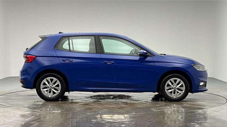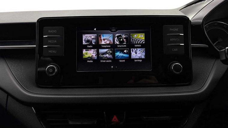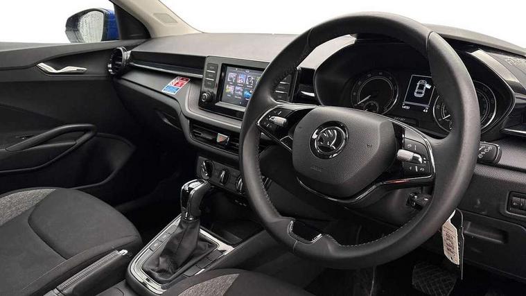 Bluetooth connection, Driver alert system - DAS, Electromechanical power steering, Exterior temperature gauge, Lane assist including road edge detection, Multifunction trip computer in black and white, Rear parking sensors, Service interval indicator, Speed limiter, 2x USB-C in the front (for data transmission and charging), 4 speakers in front, Auxiliary socket for external MP3 player, DAB digital radio reception, Radio Swing with 6.5" colour display, Basic LED Headlights, Basic rear lights, Body colour door mirrors, Body coloured bumpers, Dimming rear view mirror with black frame, Door mirror integrated indicators, Electrically adjustable and heated door mirrors, Electrically adjustable front windows with function auto up/down, Front fog lights, Front window wiper intermittent control, Headlight range control - Automatic, Ice scraper in fuel cap, LED daytime running lights with coming and leaving home feature, Mechanical adjustable rear windows, Rain sensor, Rear LED fog light, Rear side wing doors, Rear window wiper with washing nozzles, Roof mounted spoiler, SKODA tailgate lettering in chrome, Third brake light, 2 reading lights in front and 2 reading lights in rear, 2 spoke leather multifunction steering wheel, 3 rear headrests, Backrest split and folding, Central console with fixed cup holder and storage box, Chrome handbrake release button, Fabric upholstery, Gearshift knob/handle in leather, Grain satin black interior door handles, Hand brake lever handle in leather, Height adjustable front headrests, Height adjustable front seats, Height adjustable steering wheel, ISOFIX and TopTether anchorage points to the outer rear seats, ISOFIX and TopTether on the front passenger seat, Luggage compartment lighting, Manual air conditioning, Manually adjustable lumbar support in front seats, Pollen filter, Rear seat bench unsplit, Single front passenger seat, Storm grey headlining, Sun visors with mirror and airbag label on passenger side, Ticket holder, 3-point height adjustable front seats belts with pretensioner and force limiter, Automatic warning lights in case of crash, Driver and passengers airbag with switch off function, e-Call+, ESC including ABS, MSR, ASR, EDS, HBA and XDS, Front and rear seat belt warning, FRONT ASSIST (AEB City and AEB Inter Urban), Front side airbags, Head airbags, Hill hold assist, One tone horn, Pedestrian protection, Three rear 3-points safety seat belts with pretensioner and force limiter including stop function for outer rear seat belts, Tyre pressure monitoring system, Anti-theft alarm system including immobiliser, interior monitoring, backup horn, and towing protection, Central locking with radio remote control, interior controls, SAFE function and 2 foldable keys, Black painted air vents, Glossy black decorative trim, Grain satin black central console cover, Grain satin black lower decorative trim, Satin black door and side trim panel in front, Anti-theft wheel bolts protection, Super-low rolling resistance tyres,