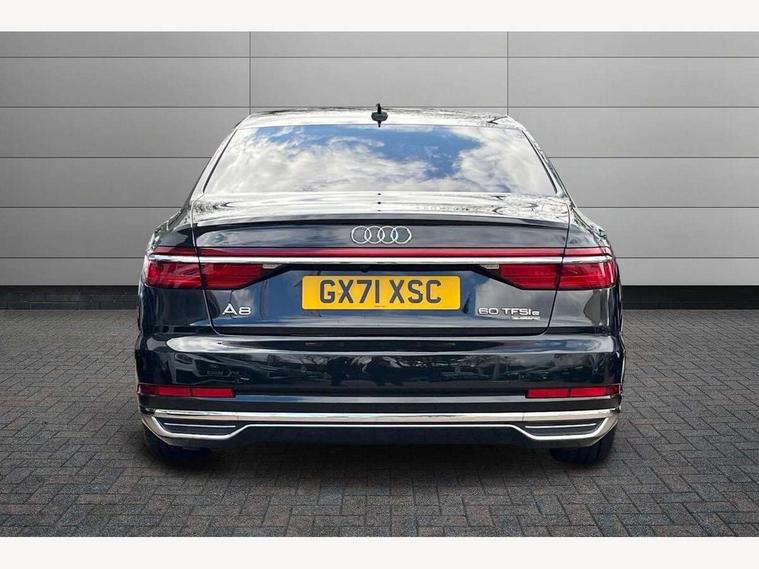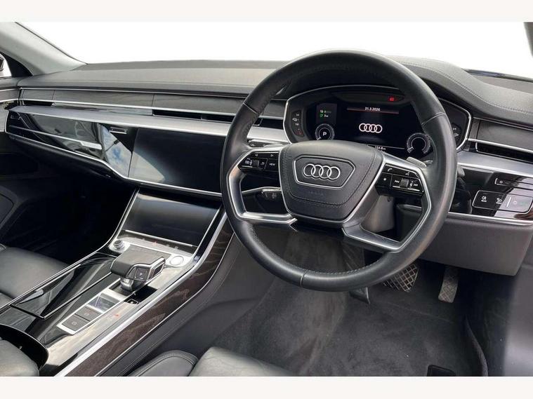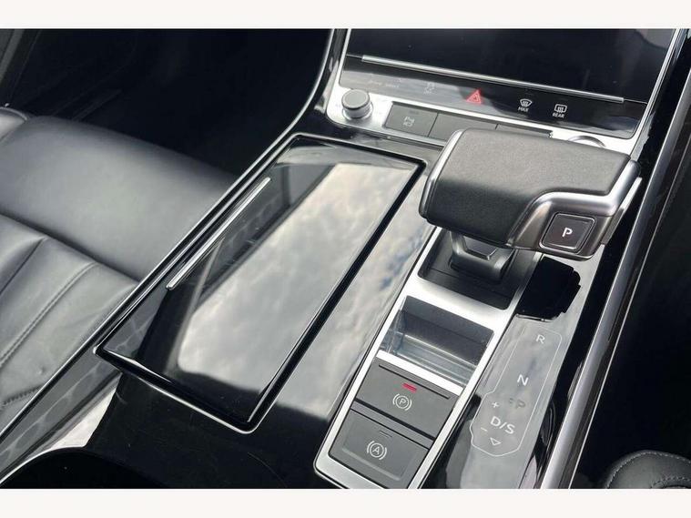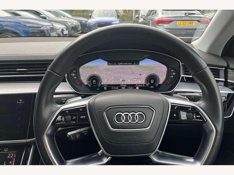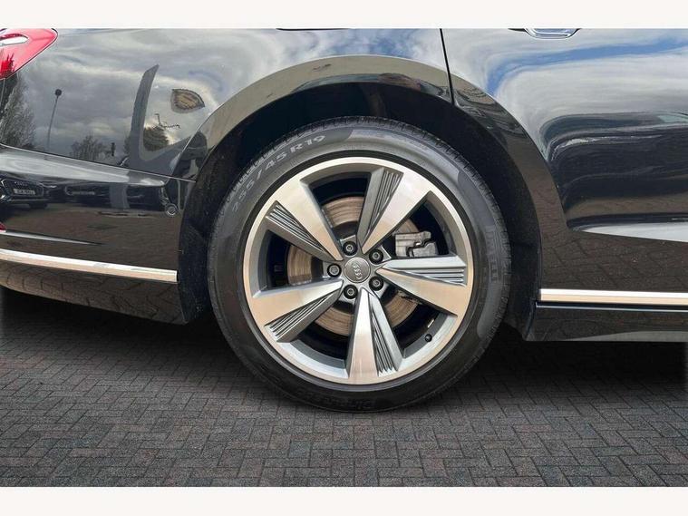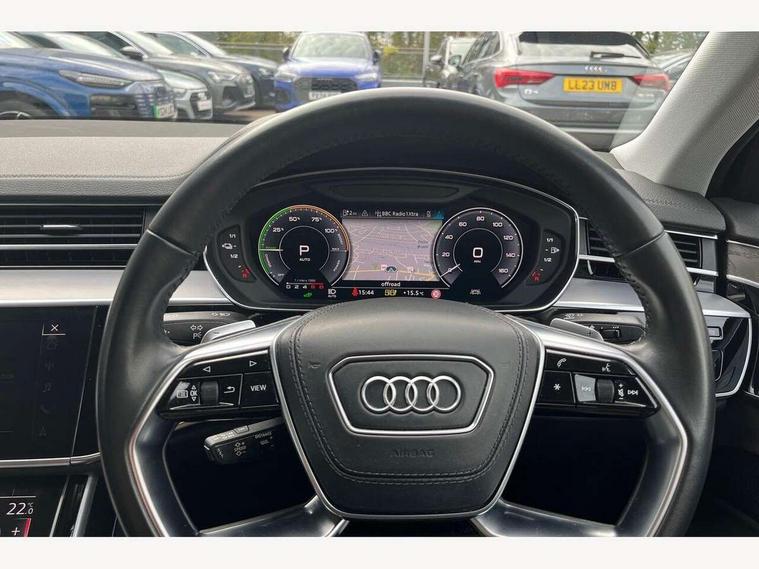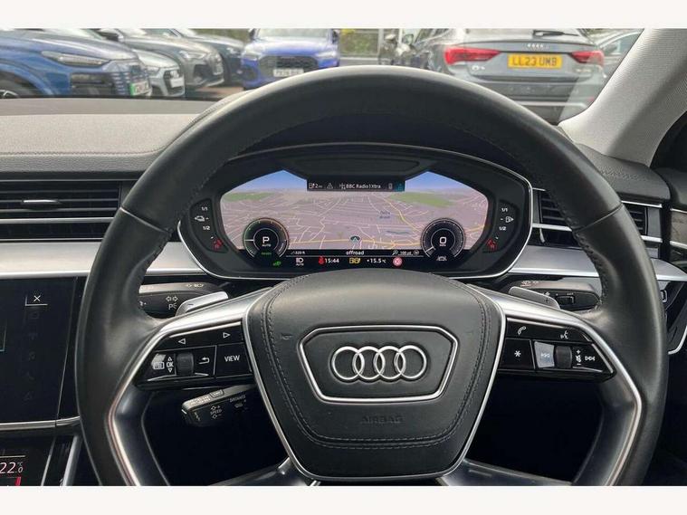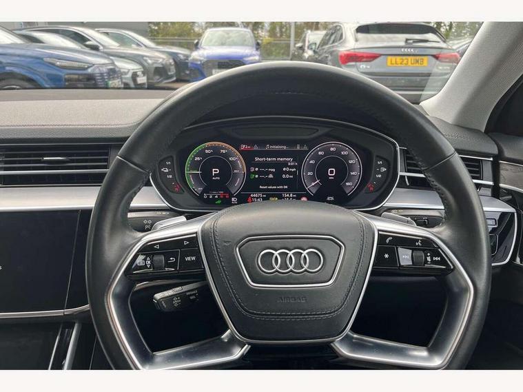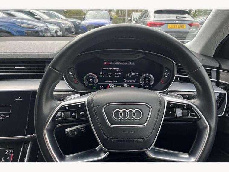 'Lights On' Reminder warning buzzer, Adaptive cruise control with speed limiter, Audi connect safety and service (e-call), Audi drive select, Audi parking system plus with front and rear sensors, Audi virtual cockpit, Audi wireless smartphone interface, Bluetooth interface, Camera based traffic sign recognition, Electro - mechanical power assisted steering, Head up Display, MMI navigation plus with MMI touch + Twin touch screens with haptic feedback, MyAudi app connection for Audi e-tron charging service, Operating buttons in black, glass look with haptic feedback, Power door closure, Power operated tailgate, Rear view camera, Remote fuel filler release, Service interval indicator, 3 pin 10 amp domestic charging cable, 65 litre fuel tank, 8 speed transmission with hill hold assist, Adaptive air suspension, Hybrid propulsion system, Quattro all wheel drive with self locking centre differential, Type 2 mode 3 32 amp charging cable, Type 2 socket for AC charging, Audi music interface, Audi sound system, DAB digital radio module, DVD System, Premium MMI radio plus, USB connection, Audi space frame, Auto dimming rear view mirror, Body colour bumpers, Body colour door handles, Body colour exterior mirror housings, Body colour side protection with aluminium trim strips, Chrome exterior styling, Electric drive specific light signature, Electric front windows, Electric rear windows with isolation switch, Electrically adjustable heated folding + automatically dimming exterior mirrors with memory function and integrated LED indicators, Heat insulating darkened glass in side and rear windows, Heated rear window, Heated windscreen washer jets, High beam assist, LED brake lights, LED daytime running lights, LED Headlights, Rear boot, Rear side wing doors, Side skirts, Third brake light, 3 seat rear bench with centre armrest in 2nd row, 4 way electric lumbar support for driver and front passenger, 4 zone control automatic air conditioning, Centre console with cupholders, Climate controlled seats, Comfort centre armrest front, Door armrest with storage, Door pockets with bottle holder, Driver and front passenger side sunvisors with illuminated vanity mirrors, Dust/pollen filters, Electric front seats with memory function, Front/rear floor mats, Glove compartment cooling, Heated front seats, Height/reach electric steering column with easy exit function, Isofix child seat mounting points on outer rear seats, Leather gearknob, Passenger footwell storage net, Pre-entry climate control, Reading lights, Rear headrests, Roof mounted sunglasses holder, Single front passenger seat, Valcona leather upholstery with comfort front seats, Connect package plus - A8, High gloss styling pack - A8, LED ambient interior lighting pack - A8, 3 point seatbelts on all rear seats, ABS/EBD, Acoustic vehicle alerting system, Active front headrest system, ASR traction control, Audi pre sense basic, Audi pre sense front, Driver/Front Passenger airbags, EDL traction control, Electromechanical parking brake, ESP, Extended pedestrian protection measures, Front and rear side airbags with head airbag system, Front brake discs, callipers painted black, Front passenger airbag deactivation, Rear brake discs, callipers painted black, Rear child proof door locks, Seatbelt reminder + electric contact in buckle + advanced safety equipment, Tyre pressure warning light, Warning triangle and first aid kit, Advanced key, Anti theft alarm tow away protection, Anti-theft wheel bolts and wheel loosening detection, Locking wheel bolts, Remote central locking, Dark matt brushed aluminium lower inlays, Tyre repair kit,