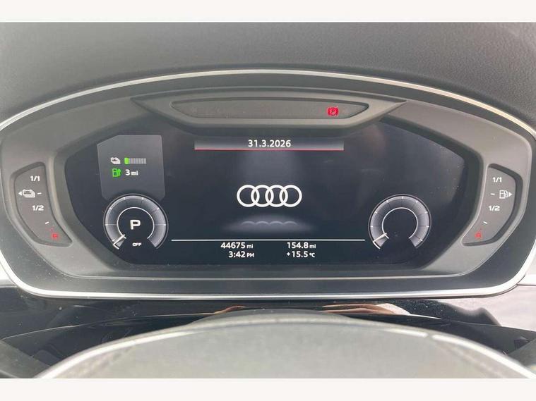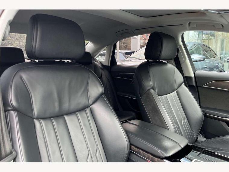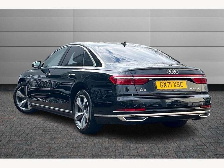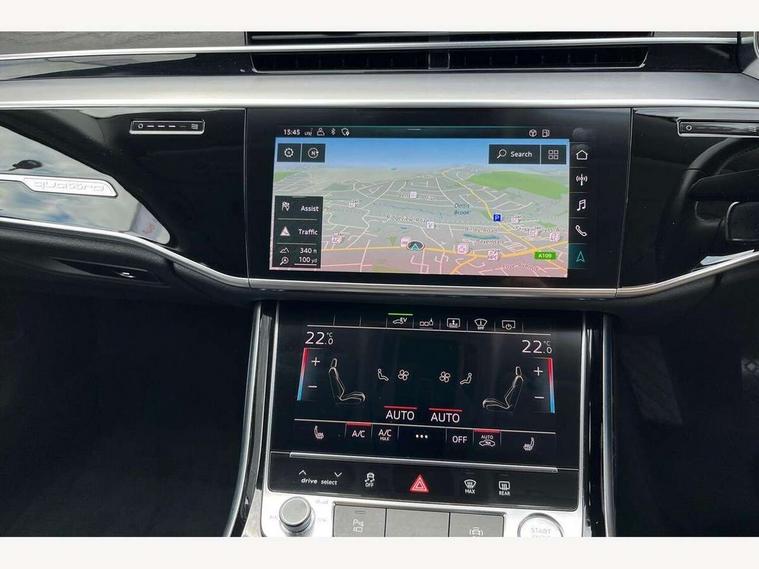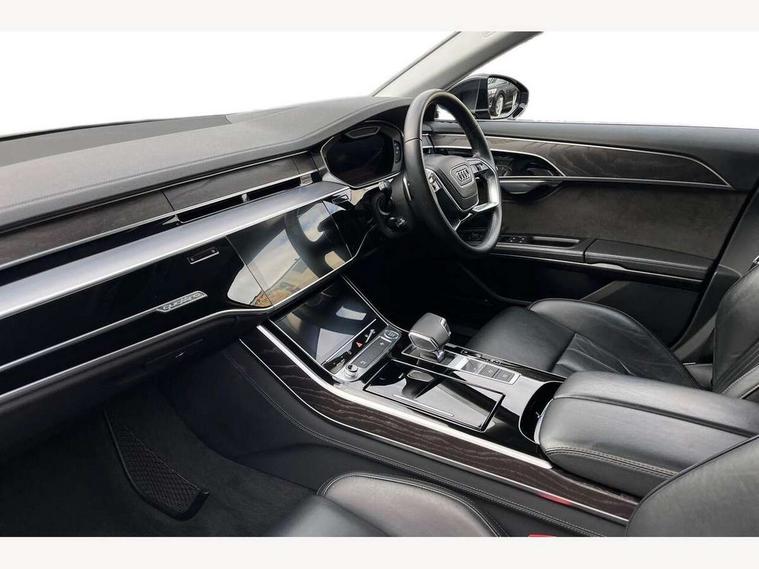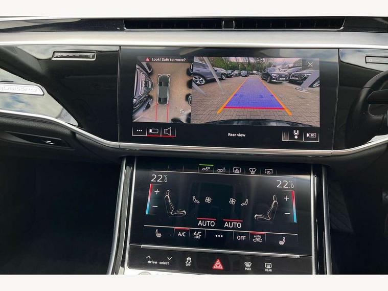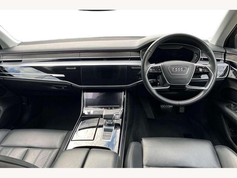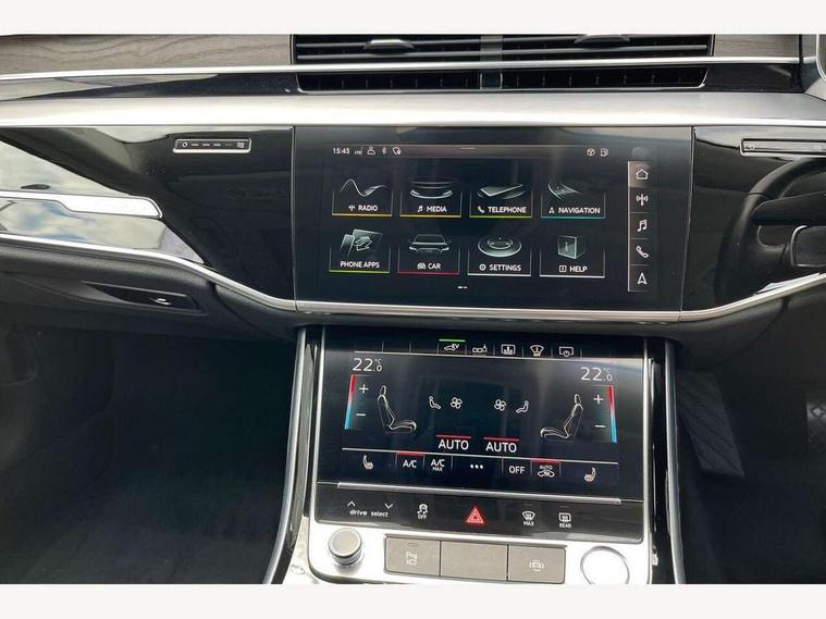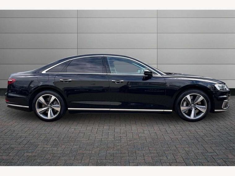'Lights On' Reminder warning buzzer, Adaptive cruise control with speed limiter, Audi connect safety and service (e-call), Audi drive select, Audi parking system plus with front and rear sensors, Audi virtual cockpit, Audi wireless smartphone interface, Bluetooth interface, Camera based traffic sign recognition, Electro - mechanical power assisted steering, Head up Display, MMI navigation plus with MMI touch + Twin touch screens with haptic feedback, MyAudi app connection for Audi e-tron charging service, Operating buttons in black, glass look with haptic feedback, Power door closure, Power operated tailgate, Rear view camera, Remote fuel filler release, Service interval indicator, 3 pin 10 amp domestic charging cable, 65 litre fuel tank, 8 speed transmission with hill hold assist, Adaptive air suspension, Hybrid propulsion system, Quattro all wheel drive with self locking centre differential, Type 2 mode 3 32 amp charging cable, Type 2 socket for AC charging, Audi music interface, Audi sound system, DAB digital radio module, DVD System, Premium MMI radio plus, USB connection, Audi space frame, Auto dimming rear view mirror, Body colour bumpers, Body colour door handles, Body colour exterior mirror housings, Body colour side protection with aluminium trim strips, Chrome exterior styling, Electric drive specific light signature, Electric front windows, Electric rear windows with isolation switch, Electrically adjustable heated folding + automatically dimming exterior mirrors with memory function and integrated LED indicators, Heat insulating darkened glass in side and rear windows, Heated rear window, Heated windscreen washer jets, High beam assist, LED brake lights, LED daytime running lights, LED Headlights, Rear boot, Rear side wing doors, Side skirts, Third brake light, 3 seat rear bench with centre armrest in 2nd row, 4 way electric lumbar support for driver and front passenger, 4 zone control automatic air conditioning, Centre console with cupholders, Climate controlled seats, Comfort centre armrest front, Door armrest with storage, Door pockets with bottle holder, Driver and front passenger side sunvisors with illuminated vanity mirrors, Dust/pollen filters, Electric front seats with memory function, Front/rear floor mats, Glove compartment cooling, Heated front seats, Height/reach electric steering column with easy exit function, Isofix child seat mounting points on outer rear seats, Leather gearknob, Passenger footwell storage net, Pre-entry climate control, Reading lights, Rear headrests, Roof mounted sunglasses holder, Single front passenger seat, Valcona leather upholstery with comfort front seats, Connect package plus - A8, High gloss styling pack - A8, LED ambient interior lighting pack - A8, 3 point seatbelts on all rear seats, ABS/EBD, Acoustic vehicle alerting system, Active front headrest system, ASR traction control, Audi pre sense basic, Audi pre sense front, Driver/Front Passenger airbags, EDL traction control, Electromechanical parking brake, ESP, Extended pedestrian protection measures, Front and rear side airbags with head airbag system, Front brake discs, callipers painted black, Front passenger airbag deactivation, Rear brake discs, callipers painted black, Rear child proof door locks, Seatbelt reminder + electric contact in buckle + advanced safety equipment, Tyre pressure warning light, Warning triangle and first aid kit, Advanced key, Anti theft alarm tow away protection, Anti-theft wheel bolts and wheel loosening detection, Locking wheel bolts, Remote central locking, Dark matt brushed aluminium lower inlays, Tyre repair kit,