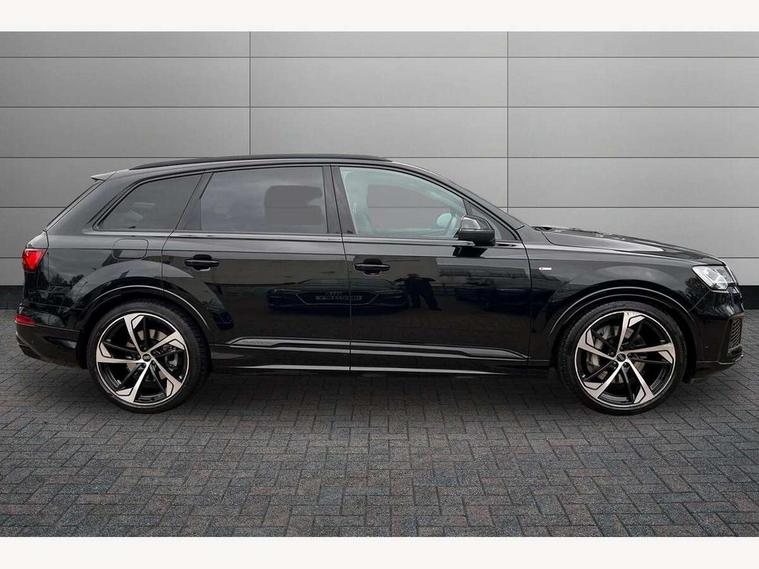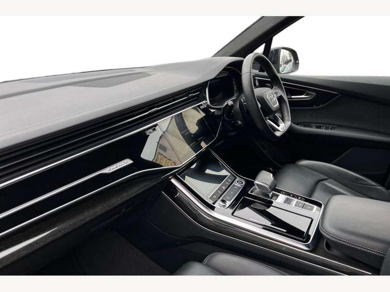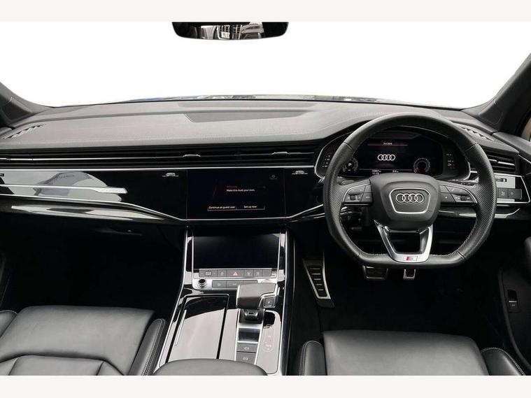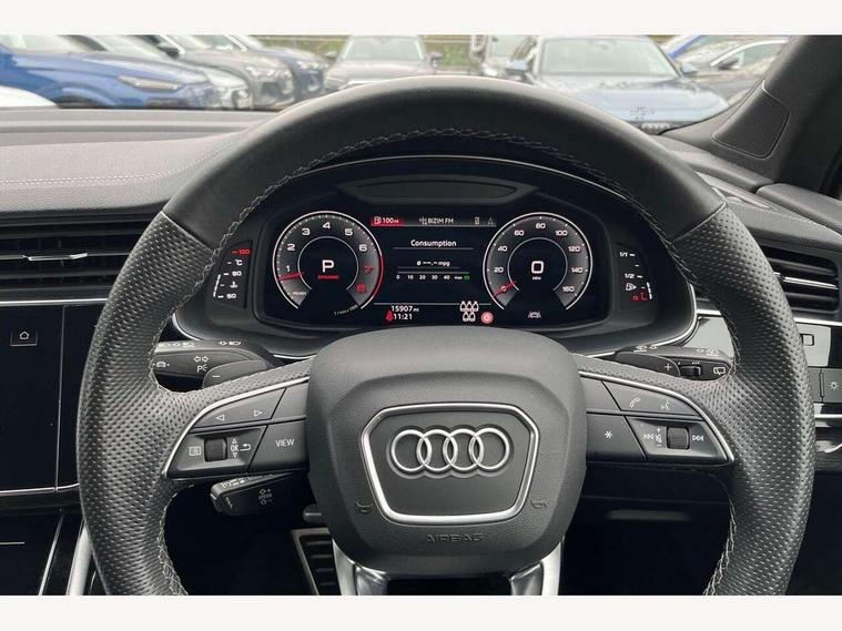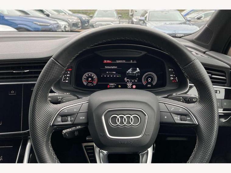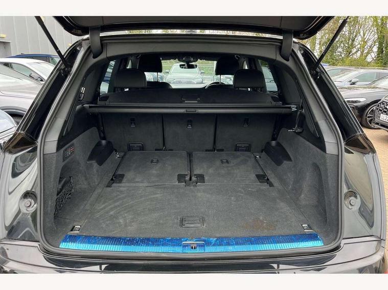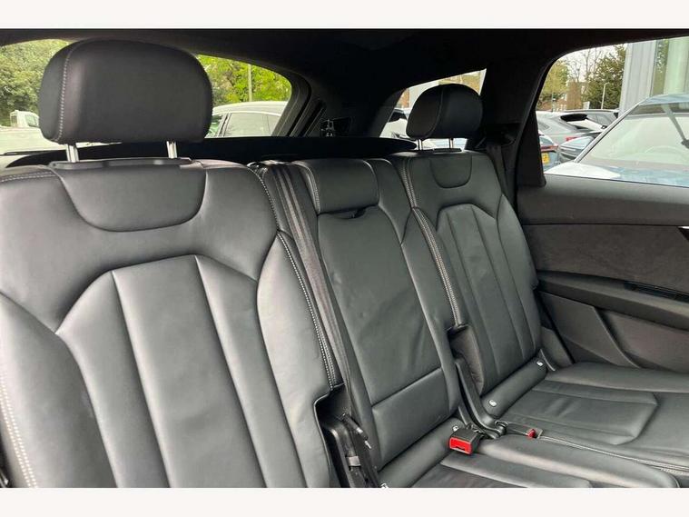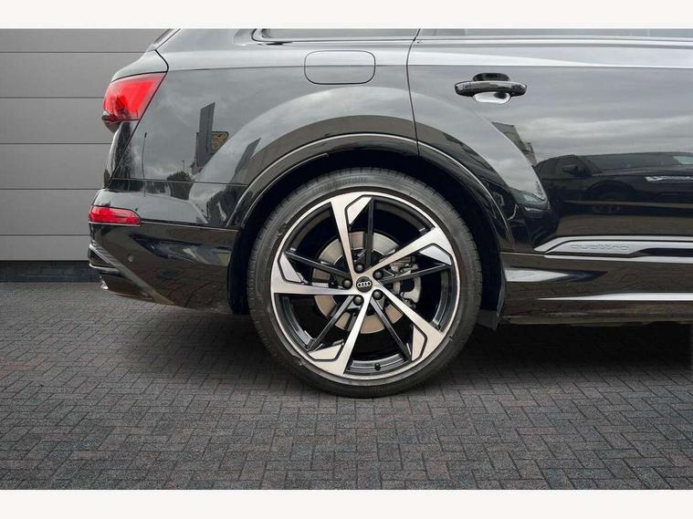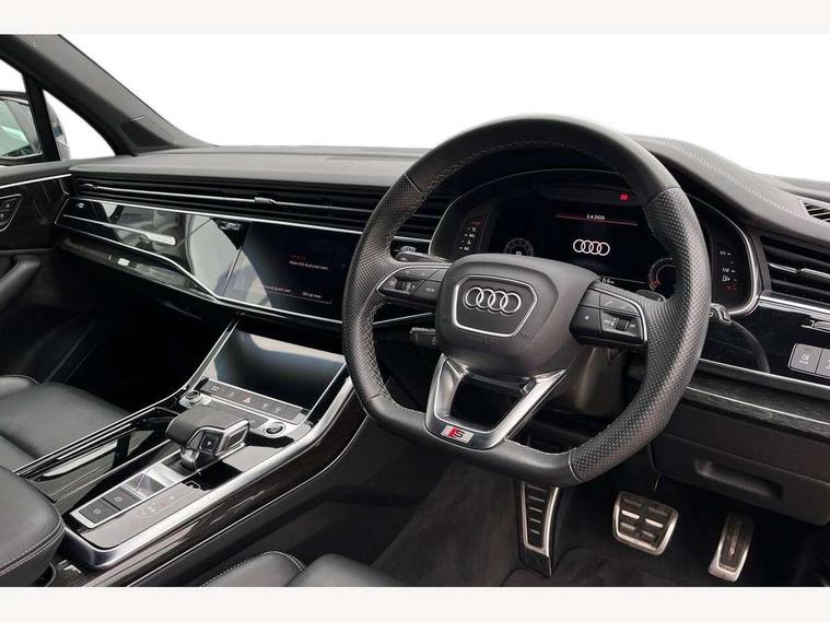Audi connect safety and service (e-call), Audi connect with Amazon Alexa Integration, Audi drive select (Auto, Comfort, Dynamic, Efficiency, Individual, Off-road and All road), Bluetooth interface, Camera based traffic sign recognition, Electromechanical steering, MMI navigation plus with MMI touch screens includes 10.1" and 8.6" screens with haptic feedback, Natural voice recognition, Parking system plus with 360 degree display (front, rear and side sensors) - acoustic and visual park assist system, Power operated tailgate, Rear view camera, Smartphone interface includes wireless Apple carplay/Android Auto, Start/stop system, 48V Mild hybrid technology, 85 litre fuel tank, Adaptive air sports suspension, Quattro all wheel drive with self locking centre differential, Audi music interface - front 2 USB-C ports with charger and data functions, Audi sound system with 6 channel amplifier, 180 watt amplifying capacity and 10 loudspeakers including subwoofer, DAB digital radio module, 3rd brake light, Audi matrix LED headlights with dynamic front and rear indicators, Auto dimming frameless rear view mirror, Black roof rails, Bumpers in contrast paint scandium grey finish includes door trim and wheel arch trim strips, inlays in door strip contain quattro embossing, Electrically adj heated/folding + automatically dimming exterior mirrors with memory + automatic kerb side function for passenger side exterior mirror, Heat insulating glass in windshield, Integrated LED indications in door mirrors, LED daytime running lights, LED rear tail lights, Privacy glass - dark tinted rear and rear side windows from B-pillar backwards, Rear side wing doors, Rear wiper, 2 seat bench in 3rd row, 3 seat bench in 2nd row, 4 zone deluxe automatic climate control, 7 seat layout with ISOFIX points for the front passenger seat and rear passenger seat, Black cloth headlining, Comfort front centre armrest, Electric adjustable front seat with 4 way lumbar support, driver memory functionality, Folding rear seats, Front head restraints, Front/rear floor mats, Heated front seats, Illuminated door sill trims with S logo, LED interior ambient lighting, Luggage compartment cover, Luggage compartment sill protection in stainless steel, Rear head restraints, Single front passenger seat, Stainless steel pedals, Sunvisors with illuminated vanity mirrors, Titanium black styling pack - Q7/SQ7, 3 point seatbelts on all rear seats, Audi pre sense front, Child locks on rear doors, Driver and front passenger, front side and curtain airbags, Electromechanical parking brake, Electronic Stabilisation Control (ESC) including ABS, ASR and EDL, Extended pedestrian protection measures, Hill hold assist, Seatbelt monitoring, Tyre pressure loss indicator, Warning triangle and first aid kit, Anti theft alarm, Anti-theft wheel bolts and wheel loosening detection, Keyless Go, Remote central locking, Polished oak trim with grey finish inlay, Tool kit, Tyre repair kit,