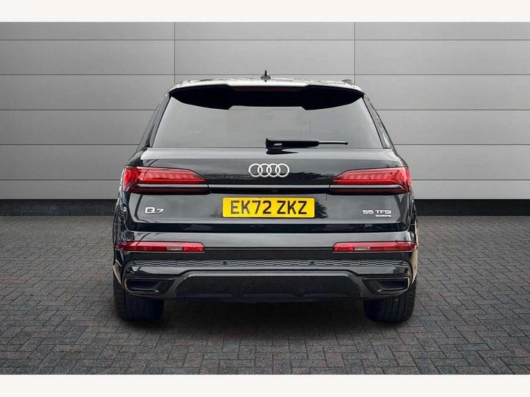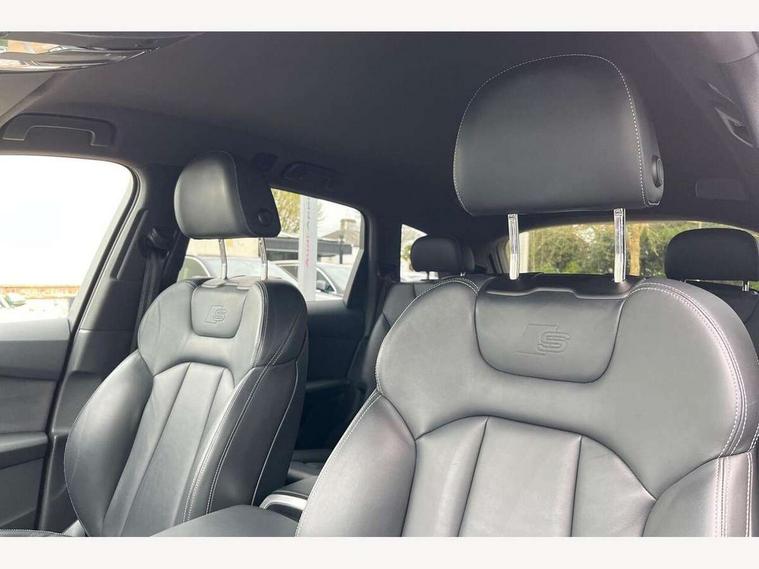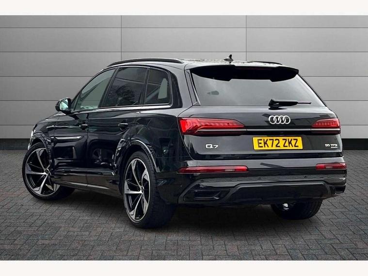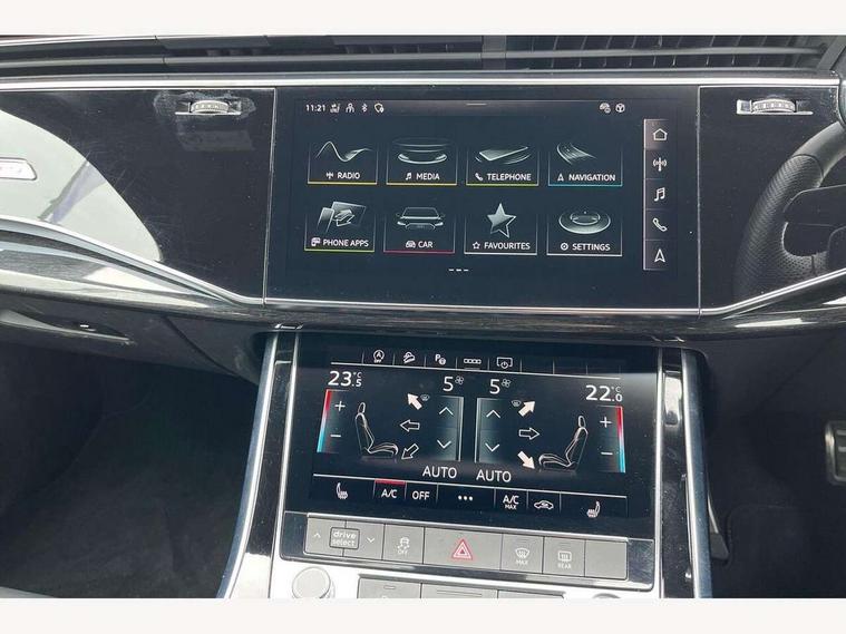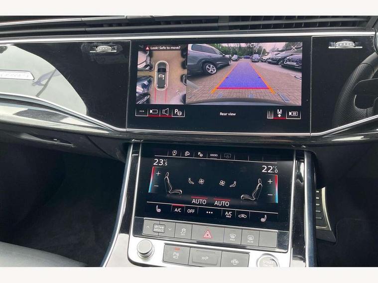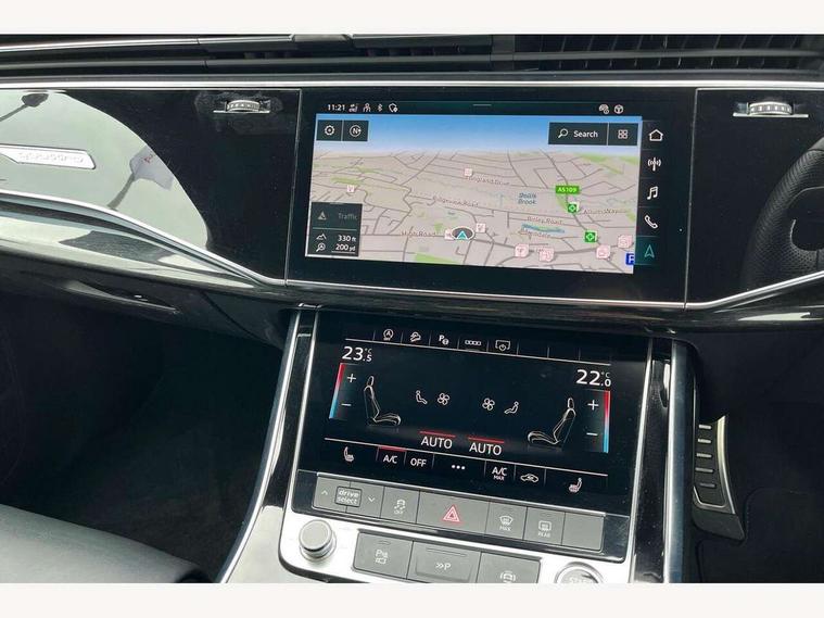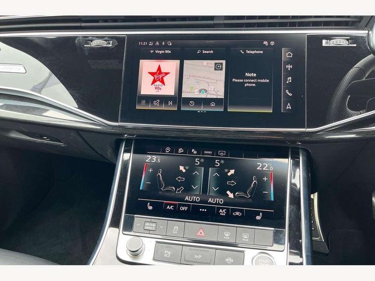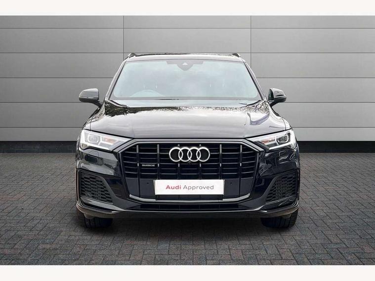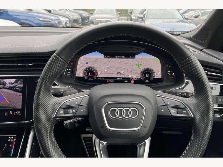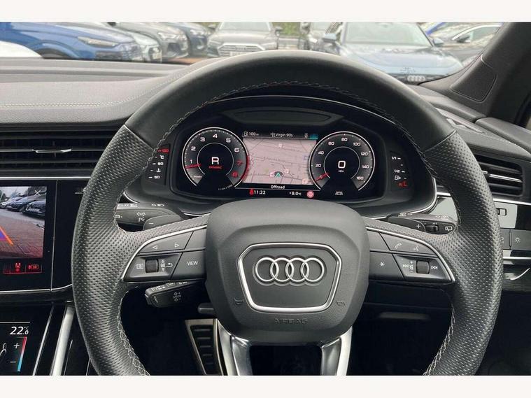 Audi connect safety and service (e-call), Audi connect with Amazon Alexa Integration, Audi drive select (Auto, Comfort, Dynamic, Efficiency, Individual, Off-road and All road), Bluetooth interface, Camera based traffic sign recognition, Electromechanical steering, MMI navigation plus with MMI touch screens includes 10.1" and 8.6" screens with haptic feedback, Natural voice recognition, Parking system plus with 360 degree display (front, rear and side sensors) - acoustic and visual park assist system, Power operated tailgate, Rear view camera, Smartphone interface includes wireless Apple carplay/Android Auto, Start/stop system, 48V Mild hybrid technology, 85 litre fuel tank, Adaptive air sports suspension, Quattro all wheel drive with self locking centre differential, Audi music interface - front 2 USB-C ports with charger and data functions, Audi sound system with 6 channel amplifier, 180 watt amplifying capacity and 10 loudspeakers including subwoofer, DAB digital radio module, 3rd brake light, Audi matrix LED headlights with dynamic front and rear indicators, Auto dimming frameless rear view mirror, Black roof rails, Bumpers in contrast paint scandium grey finish includes door trim and wheel arch trim strips, inlays in door strip contain quattro embossing, Electrically adj heated/folding + automatically dimming exterior mirrors with memory + automatic kerb side function for passenger side exterior mirror, Heat insulating glass in windshield, Integrated LED indications in door mirrors, LED daytime running lights, LED rear tail lights, Privacy glass - dark tinted rear and rear side windows from B-pillar backwards, Rear side wing doors, Rear wiper, 2 seat bench in 3rd row, 3 seat bench in 2nd row, 4 zone deluxe automatic climate control, 7 seat layout with ISOFIX points for the front passenger seat and rear passenger seat, Black cloth headlining, Comfort front centre armrest, Electric adjustable front seat with 4 way lumbar support, driver memory functionality, Folding rear seats, Front head restraints, Front/rear floor mats, Heated front seats, Illuminated door sill trims with S logo, LED interior ambient lighting, Luggage compartment cover, Luggage compartment sill protection in stainless steel, Rear head restraints, Single front passenger seat, Stainless steel pedals, Sunvisors with illuminated vanity mirrors, Titanium black styling pack - Q7/SQ7, 3 point seatbelts on all rear seats, Audi pre sense front, Child locks on rear doors, Driver and front passenger, front side and curtain airbags, Electromechanical parking brake, Electronic Stabilisation Control (ESC) including ABS, ASR and EDL, Extended pedestrian protection measures, Hill hold assist, Seatbelt monitoring, Tyre pressure loss indicator, Warning triangle and first aid kit, Anti theft alarm, Anti-theft wheel bolts and wheel loosening detection, Keyless Go, Remote central locking, Polished oak trim with grey finish inlay, Tool kit, Tyre repair kit,