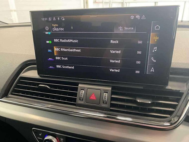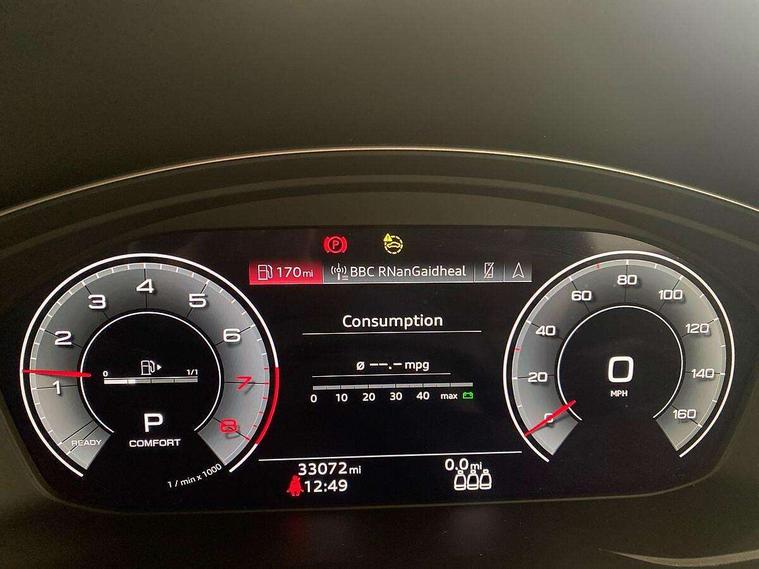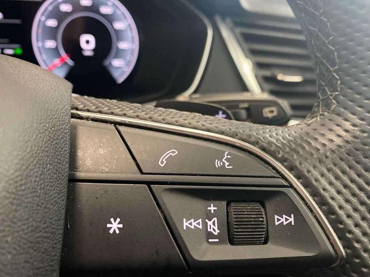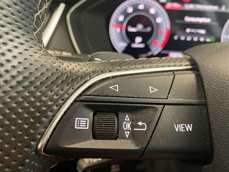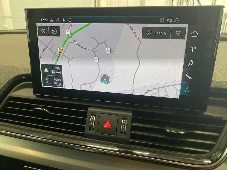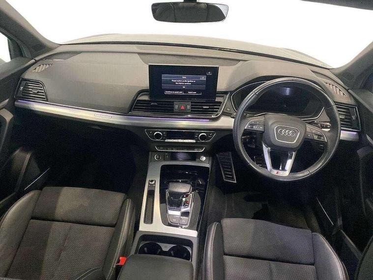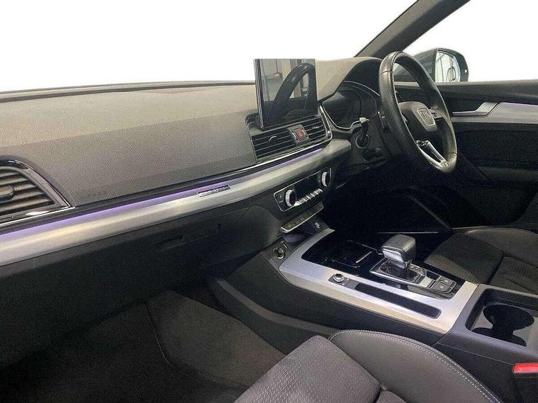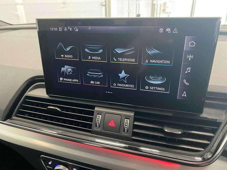 Audi connect safety and service (e-call), Audi connect with Amazon Alexa Integration, Audi drive select, Audi virtual cockpit plus with 12.3" screen and three different layout designs, Audi wireless smartphone interface, Automatic start-stop system with coasting functionality and efficiency programme, Bluetooth interface, Electro - mechanical power assisted steering, MMI navigation plus with 10.1" touch screen, Power tailgate, Reversing camera, Service interval indicator, Voice control system with Audi hotword activation "Hey Audi", 70 litre fuel tank, Quattro on demand, S line sports suspension, DAB Digital radio, Acoustic windscreen, Aluminium roof rails, Audi matrix LED headlights with dynamic front and rear indicators, Auto dimming door mirrors, Auto dimming rear view mirror, Automatic headlight adjustment, Automatic headlights and windscreen wipers, Body colour door mirrors, Body colour rear diffuser with matt aluminium silver surrounds, Body colour underbody protection, Chrome plated exhaust trims, Daytime running lights, Door sills in Selenite silver, Electric adjustable/heated/folding door mirrors, Front air inlet surrounds in aluminium, Front and rear electric windows, Front radiator grille in honeycomb design, Headlight washers, High level LED brake light, Lower bumpers painted in contrast Manhattan grey, Rear chrome trim strip below lights, Rear privacy glass and rear side windows, Rear side wing doors, Rear wiper, Roof bars, S Line badges on the front wings, S Line front and rear bumpers, S Line rear spoiler, S Line side skirts, 2 x USB charging port with aux input socket, 3 rear headrests, 40:20:40 split folding 3 rear bench seat in 2nd row with rear centre armrest, Black cloth headlining, Comfort front centre armrest, Contrast stitching on seats, steering wheel and gear lever gaiter, Deluxe 3 zone electronic climate control, Front head restraints, Front/rear floor mats, Gear lever in black leather, Heated front seats, Height/reach adjustable steering column, Illuminated door sill trims with S logo, ISOFIX child seat mounting and top tether, Manual seat adjustment with 4-way electric lumbar support, Removable luggage compartment floor, Single front passenger seat, Stainless steel pedals, Sunvisors with vanity mirrors, Trunk roller cover, High gloss pack - Q5, LED interior light pack - Q5, 3 point seatbelts on all seats, 6 airbags - Driver, front passenger, curtain and side airbags, Electrically operated child locks on rear doors, Electromechanical parking brake, Electronic stabilisation control including ABS, ASR and EDL, Front passenger airbag deactivation, Hill descent control, Hill hold assist, Multi collision brake assist, Pop-up bonnet for pedestrian protection, Pre sense city, Seat belt force limiter, Seatbelt monitoring, Tyre pressure warning, Warning triangle and first aid kit, Anti theft alarm, Anti-theft wheel bolts, Keyless Go access/ignition system, Remote central locking, Matt brushed aluminium inlays,