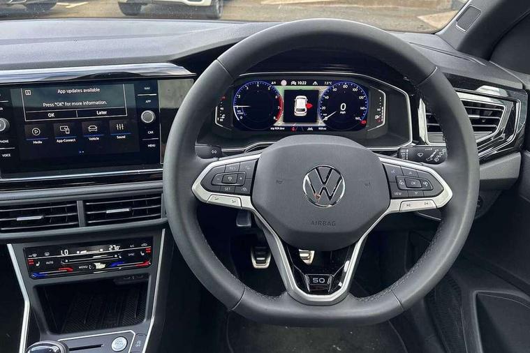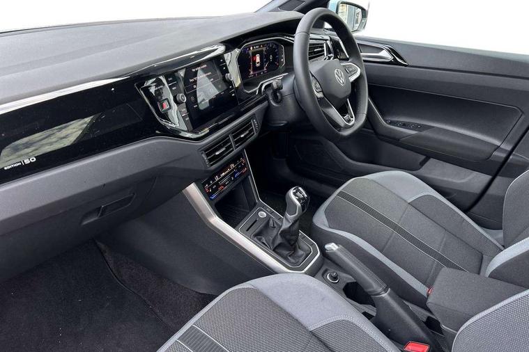 Advanced driver attention and drowsiness monitor, Bluetooth mobile phone interface, Cruise control + speed limiter, Digital Cockpit Pro with 10.25" Display, Driving mode selection, Dynamic road sign display, Emergency call service, Mobile phone preparation with inductive charging function, Multifunction camera, Park distance control, Power assisted speed sensitive steering, Preparation for navigation system with media and internet package, Preparation for We connect and We connect plus, Rear view camera, Speedo and rev counter, electronic odometer, trip, service interval display and exterior temperature gauge, Standard rear axle, Travel Assist - Lane keeping system and traffic jam assist, Trip computer, Warning signal and warning light for front and rear seatbelts not fastened, Washer fluid level indicator, Wireless app connect, Front wheel drive, Rear shock absorpion, Start-stop system with battery regeneration (recuperation - energy recovery during braking), DAB Digital radio, Diversity antenna for FM reception, Automatic dimming interior rear view mirror, Automatic headlight control with LED separate daytime running lights with coming/leaving home function, Body colour bumpers with chrome inserts, Body colour door handles, Edition 50 on scuff plates in door apertures, Electric front windows, Electric panoramic sunroof with glass sliding and tilting, Engine badge deletion, Heat insulating and laminated safety glass windshield, Power folding adjustable/heated exterior mirrors and front passenger exterior mirror lowering function, Rain sensor, Rear electric windows, Rear fog light, Rear side wing doors, Rear tinted glass from B-pillar backwards approx 65% tinted, Rear windscreen washer and wiper with interval delay, Third brake light, 12V power socket in centre console, 2 front and 2 rear reading lights with switch off delay and dimmer, 2 USB-C ports in the front, 2 USB-C charging sockets on the center console in the rear, 3 rear head restraints, 50 on steering wheel, 60/40 split folding rear seat and rear seat bench not split, Air care climatronic air conditoning system with active combination filter and 2-zone temperature control, Carpet mats, front and rear, Ceramique roof lining, Chrome plated radiator grille inserts, air vent surrounds and light switch surrounds, Door and side trim panel, Driver and front passenger seat height adjustment, Driver/passenger sunvisors with illuminated vanity mirrors, Front centre armrest, Front seat backrest storage pockets, Handbrake lever handle in leather, Headliner in recycled material, Isofix child seat preparation easy-fit (for two outer rear seats, and front passenger seat) compatible with I-size, Leather trimmed gear knob, Luggage compartment cover, Luggage compartment lighting, Lumbar adjustment for front seats, Removable luggage compartment floor, Single front passenger seat, Sports Edition 50 comfort seats in front, Standard pedal cluster, Three spoke leather wrapped multifunction steering wheel, Tracks cloth upholstery, Driver's assistance pack - Polo, IQ LED matrix headlights pack - Polo, Light and vision pack - Polo, 3 point height adj front seatbelts + pretensioners, 3x3 point rear seatbelts, ABS, Driver and front passenger airbag with front passenger airbag deactivation, Drivers and front passengers safety optimised head restraints, ESC (Electronic stability control) + EDL (Electronic Differntial lock) and ASR (Traction control), Extended and predictive pedestrian/ cyclist protection, Front assist with autonomous emergency braking (for Adaptive Cruise Control ACC up to 130 mph), Front curtain and side airbags with center airbag, Front disc brakes, Hill hold control, Manual child lock in rear doors, Rear drum brakes, Single tone horn, Tyre pressure loss indicator, Alarm with interior protection, Anti-theft alarm system with interior monitoring, backup horn, and towing protection, Anti-theft wheel bolts, Electronic engine immobiliser, Keyless locking and starting system keyless access with safelock, Low rolling resistance tyres,