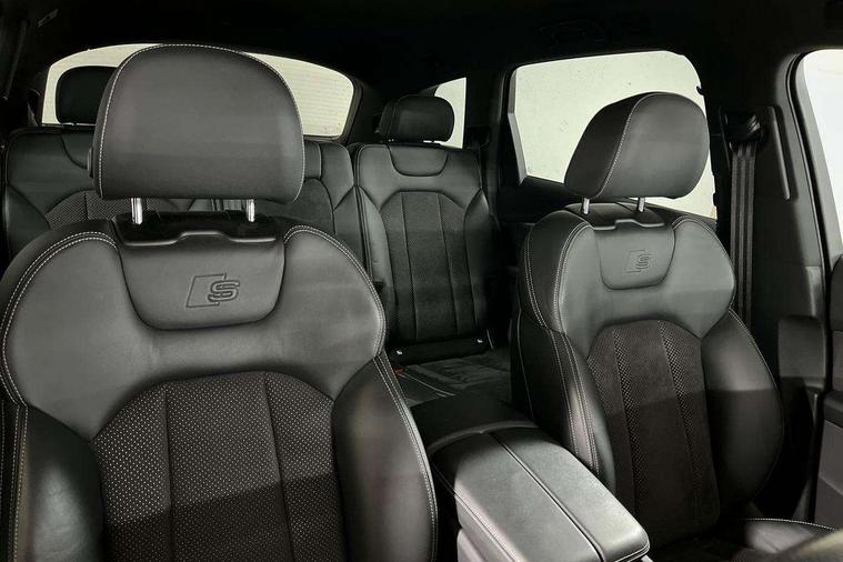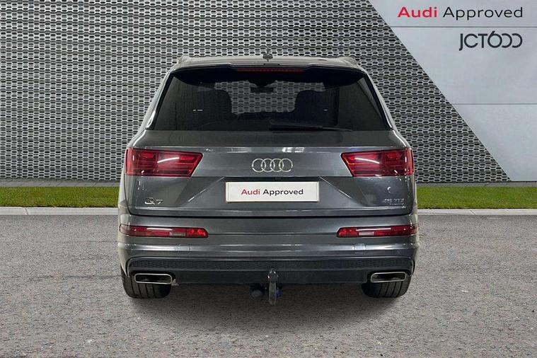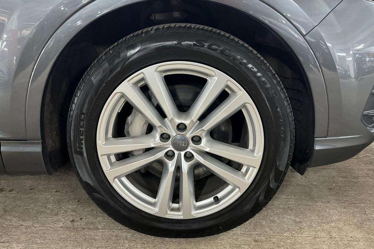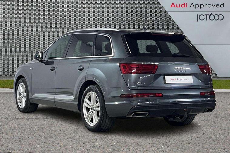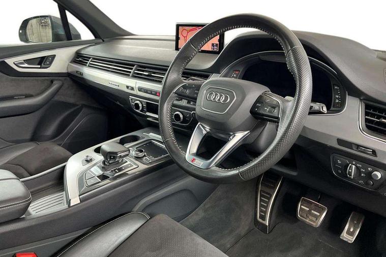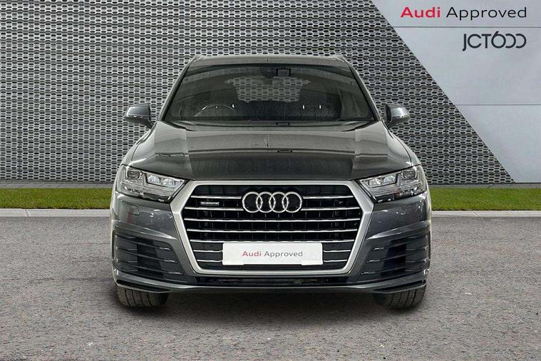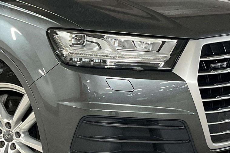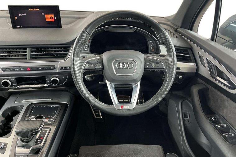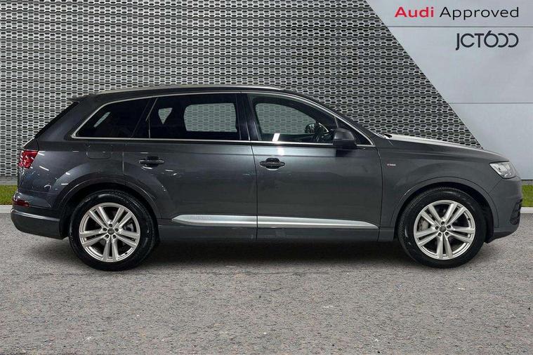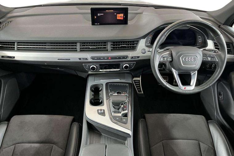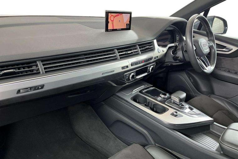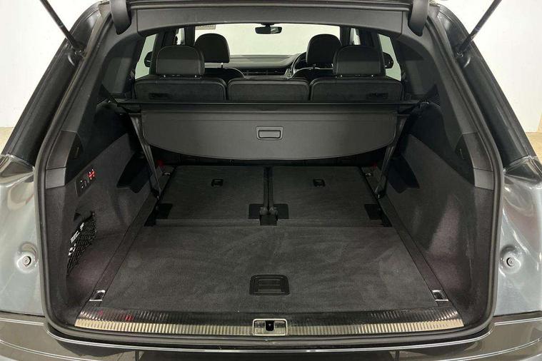 8.3" central fold-down colour display with high-resolution graphics, Audi connect safety and service (e-call), Audi drive select, Audi phone box with wireless charging, Audi smartphone interface, Audi virtual cockpit - 12.3" high-resolution LCD display with fully customisable instrument cluster, Colour driver's information system display, MMI - Multi Media Interface control system, MMI navigation plus with MMI touch, Mobile phone preparation with bluetooth interface, Power tailgate, Service interval indicator, Servotronic speed related PAS, Speed limiter, Start/Stop system with energy recuperation, Voice control system, Adaptive air suspension, 2 USB ports, 2x SD card slot, Audi music interface, Aux-in socket, DAB digital radio module, DVD System, MMI radio plus, Acoustic windscreen, Auto dimming rear view mirror, Electric front+rear windows, Electric/heated/folding door mirrors with memory, Green tinted heat insulating glass, Headlight washers, High beam assist, LED daytime running lights, Loading sill protector in stainless steel, Platinum grey front lip spoiler, Privacy glass, Rain and light sensors, Rear wiper, Roof spoiler, S Line badge on wings, S Line body styling, S Line front and rear bumpers, 2 cupholders in front centre console, 35/30/35 split fold 2nd row seats, Door sill trims with S line logo, Electric 3rd row 50/50 split/fold, Front ashtray and cigar lighter, Front centre comfort armrest with storage + cupholders, Front head restraints, Front/rear floor mats, Gearshift paddles, ISOFIX child seat mounting for 6 passenger seats with front passenger airbag deactivation includes top tether, Leather gear knob, Luggage compartment cover, Rear centre armrest with 2 cupholders, Rear headrests, Stainless steel pedals, Sunvisors with illuminated vanity mirrors, Interior light pack - Q7, 3 point seatbelts on all seats, ABS+Electronic Brake force Distribution, Curtain airbags, Driver and passenger airbags, EDL + ASR, Electrically operated child locks on rear doors, Electromechanical parking brake, Electronic stability control, Front side airbags, Hill descent control, Hill hold assist, Seatbelt warning, Traction control, Tyre pressure loss indicator, Warning triangle and first aid kit, Anti theft alarm, Anti-theft wheel bolts, Immobiliser, Keyless Go access/ignition system, Remote central locking, Chrome door inserts, Tool kit, Tyre repair kit,