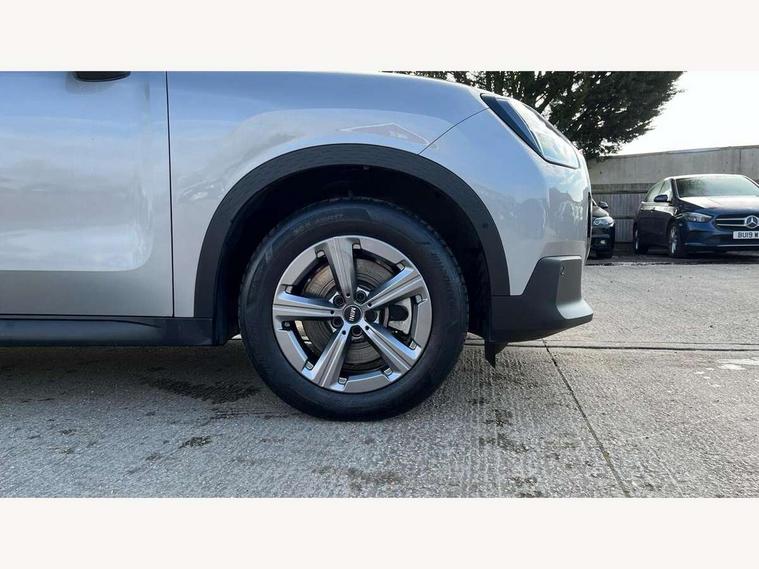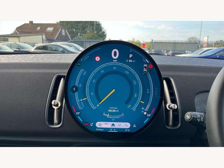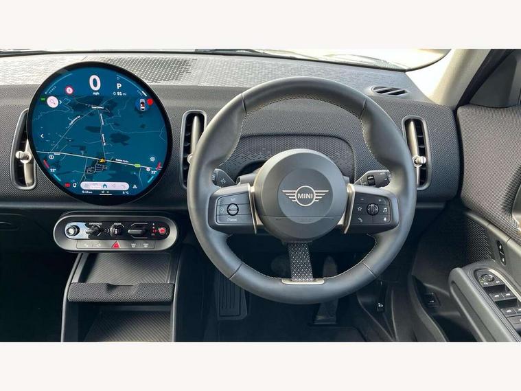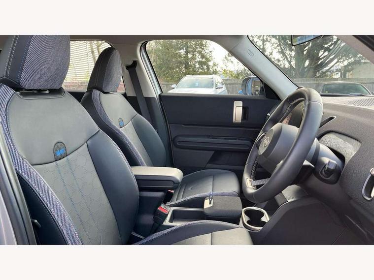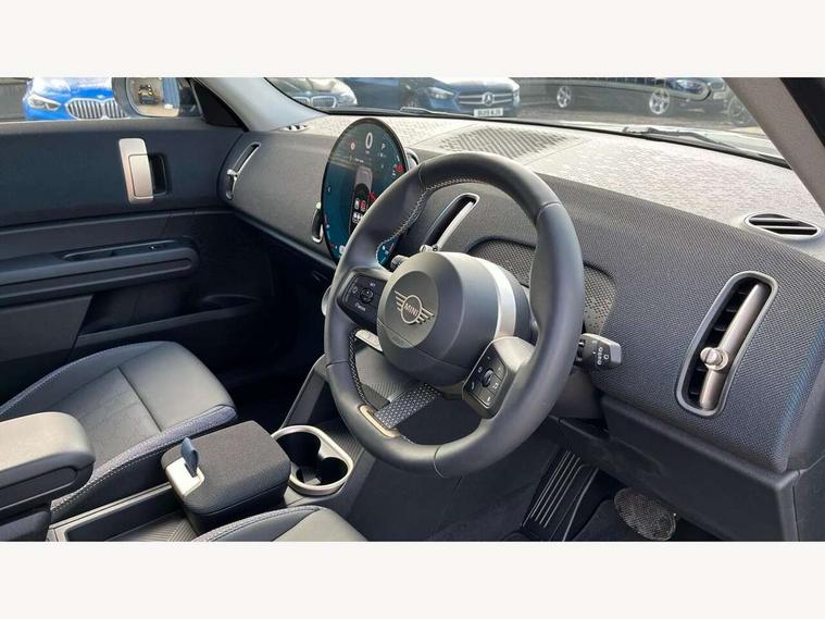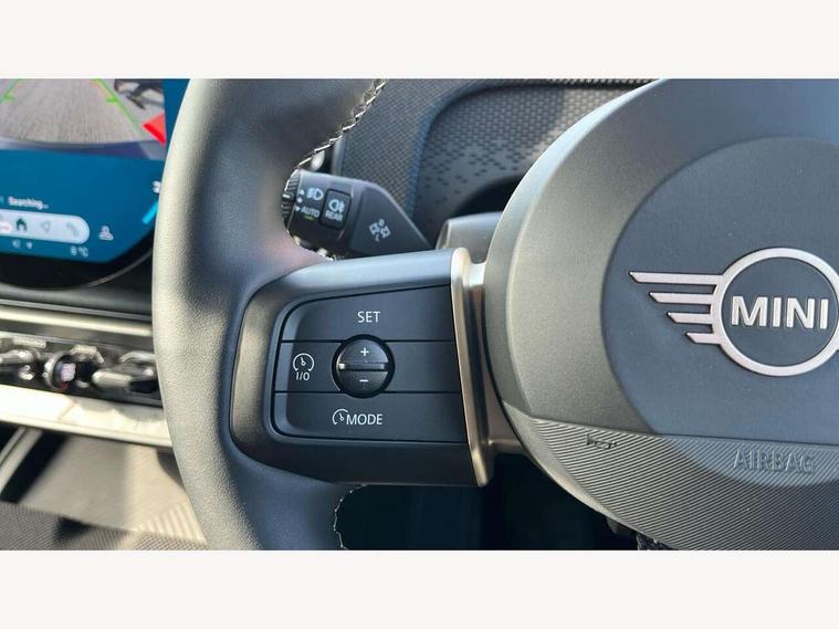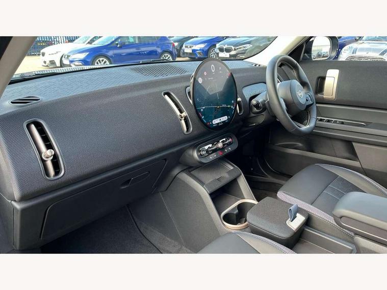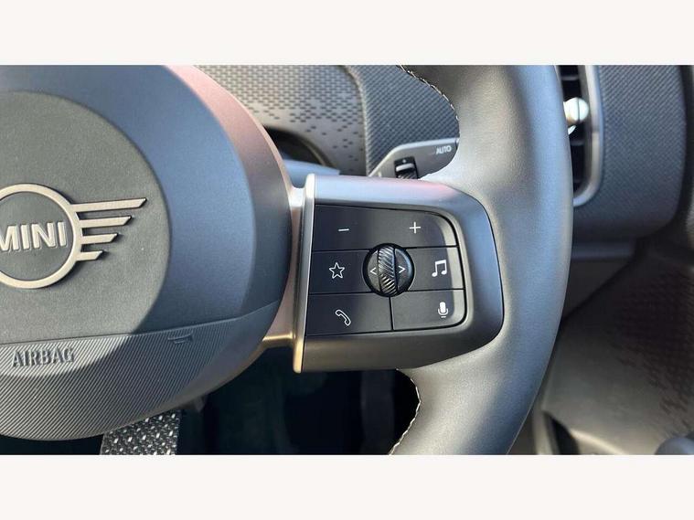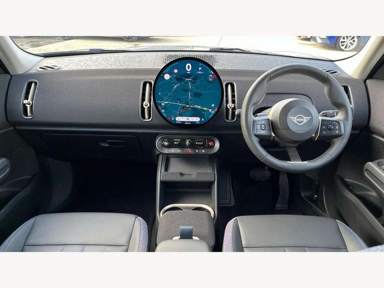 Bluetooth connection, Circular OLED Screen, Compatible mobile phone bluetooth with audio streaming, Cruise Control (DCC), Digital dashboard display, Driving assistant, E-call, Electro-mechanical speed dependant steering assistance, MINI Experience Modes, Mini navigation system, MINI TeleServices, Parking assistant in camera and ultrasound based assistance system, rear view camera, parking aid and distance control, Auto transmission with Paddles, Larger capacity fuel tank, 6 speakers, DAB Digital radio, Personal eSim, Auto tailgate, Electric adjustable heated door mirrors, Front and rear electric windows, Heated rear window, LED daytime running lights, LED Headlights, LED rear lights, LED third brake light, Rain sensor with auto headlights, Rear side wing doors, Rear window wiper, Roof rails, 3 seat bench in 2nd row, 60/40 split rear bench seat, Auto air conditioning, Floor mats, Front armrest, Front headrests, Heated steering wheel, Height and length steering column adjustment, Light headliner, Rear headrests, Single front passenger seat, Sport Vescin Steering Wheel, Sunvisors with vanity mirrors, Vescin/Cloth upholstery, 3x3 point rear seat belts, 6 Airbags - front, side, head and seat belt tensioners, ABS, DSC - Dynamic Stability Control, Electronic handbrake, Electronic Stability Programme (ESP), Front ISOFIX (iSize), Hill hold assist, Hill start assist, Manual rear child locks, Traction control, Tyre pressure monitoring system, Warning triangle, Alarm system with tilt sensor, monitoring doors, bonnet interior and tailgate, Auto drive away locking, Deadlocking function, Electronic vehicle immobiliser, Locking wheel bolts, Remote control locking, Start/stop toggle with keyless go, Black/Blue dashboard knit, MINI Mobility Kit,