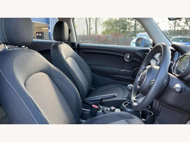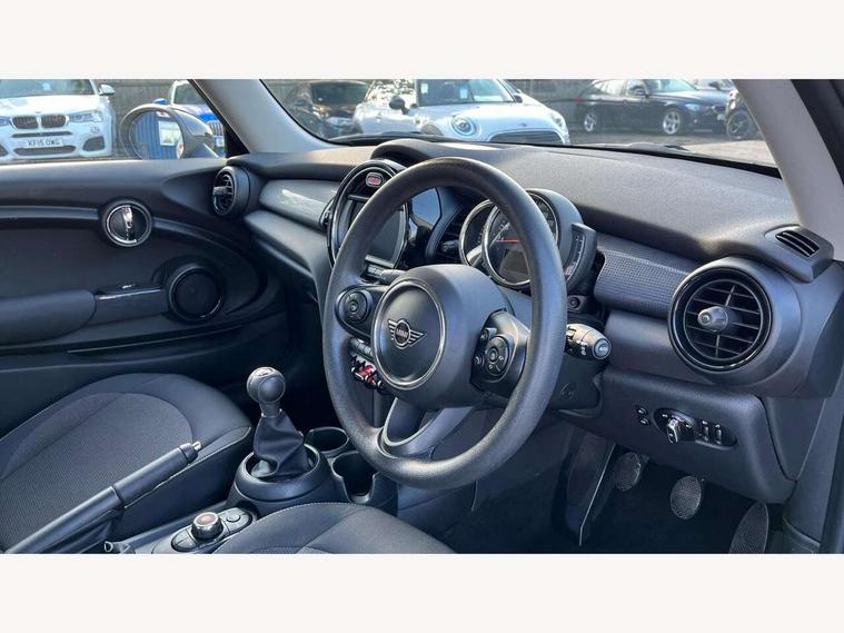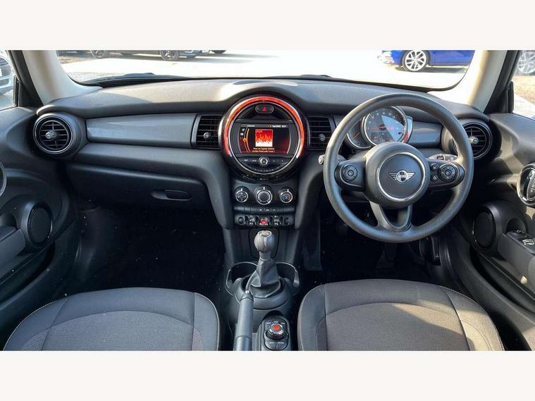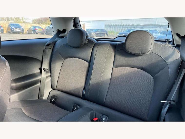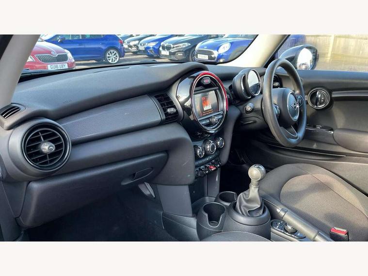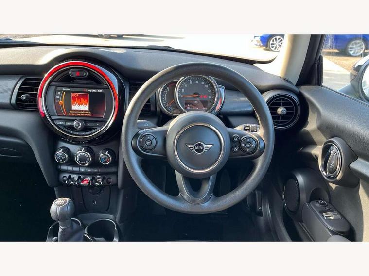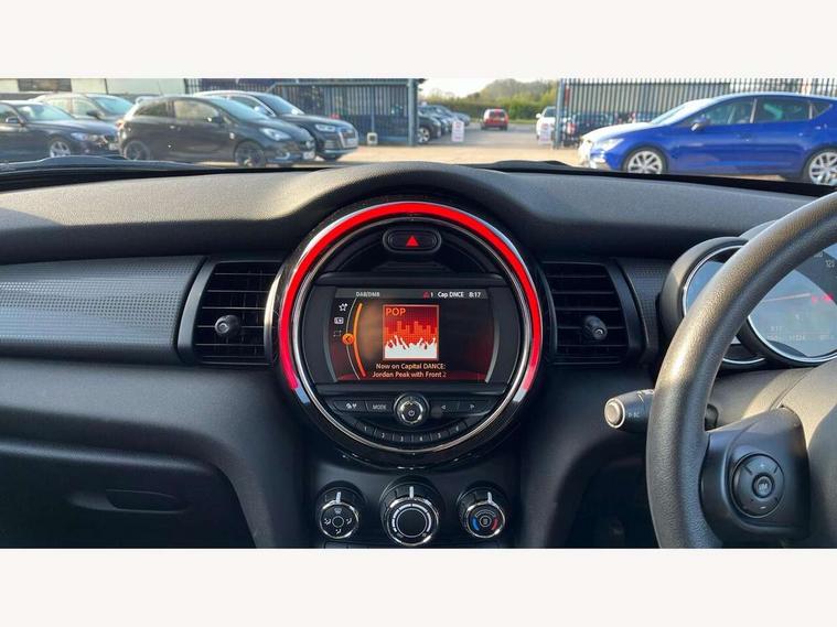 Compatible mobile phone bluetooth with audio streaming, Instrument cluster, Mini E-call, MINI TeleServices, On board computer, Service interval indicator, 6.5" touchscreen with LED ring, FM tuner and DAB digital radio, Automatic headlight activation switch, Body colour fuel filler cap, Chrome border high gloss black slats radiator grille, Dynamic brake lights, Electric front+rear windows, Heated rear window, Heated windscreen washer jets, LED headlight with closed ring and daytime driving lights, Left exhaust tailpipe with chrome finisher, Metal door sill strips with MINI imprint, Model logo Cooper on right of tailgate, Rain sensor window wipers, Rear fog lights, Rear LED lights with union jack design, Rear window wiper, Side scuttle panel with integrated indicator, Sun/heat protection glass, White indicator lenses, 12V Accessory socket in centre console, 4 lashing eyes in luggage compartment, 60/40 split folding rear seat, Chrome interior highlights, Colour line - Carbon black, Cupholders, Front and rear isofix with front passenger airbag deactivation, Glove compartment, Height and length steering column adjustment, Interior lighting with 12 basic colours selectable via toggle switch in roof, Leather gearshift lever and handbrake gaiters, LED reading lights, vanity mirror lights, front foot well light and spotlight on front seats, Manual air conditioning, Mechanical seat adjustment, driver seat height adjust, forward/back and front seats backrest, Mini logo projection on floor from drivers exterior mirror, Multifunction steering wheel, Satellite grey headlining, Storage compartments in doors, Sunvisors with vanity mirrors, 3 point seatbelts on all four seats, 6 Airbags - front, side, head and seat belt tensioners, Anti-lock braking system (ABS), DSC - Dynamic Stability Control, Front and rear disc brakes, Hill start assist, Single tone fanfare horn, Tyre pressure monitoring system, Alarm system with tilt sensor, monitoring doors, bonnet interior and tailgate, Electronic vehicle immobiliser, Start/stop toggle with keyless go, Tool kit,