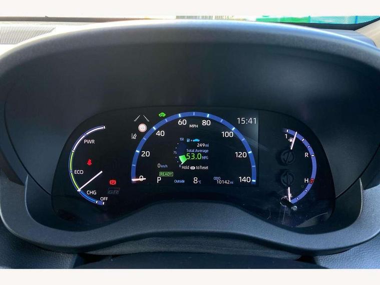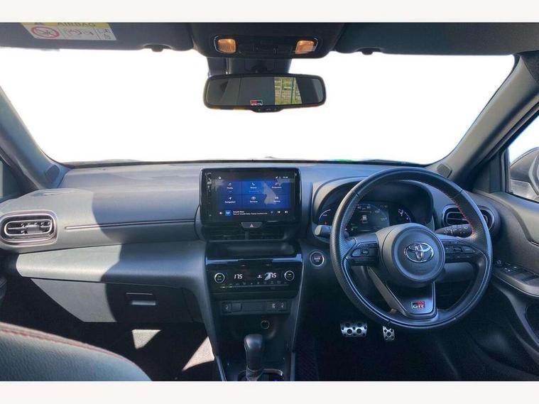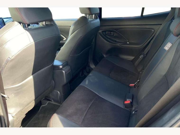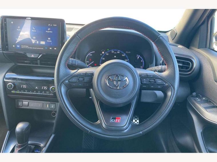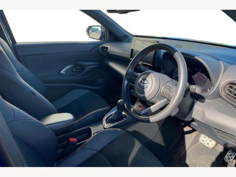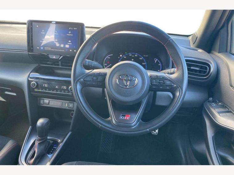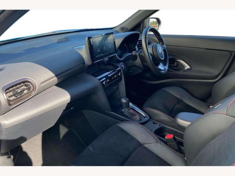 7" Multi information display screen, Adjustable speed limiter, Bluetooth connectivity, Driver attention alert system, eCall emergency system, Electric power steering, Full range intelligent adaptive cruise control, Hybrid system indicator, Key reminder warning, Lane trace assist, Multimedia, audio, telephone and voice recognition switches on steering wheel, My T Connected services, Pre-collision system enhanced with emergency steering assist, Reversing camera, Road sign assist - RSA, GR suspension tuning, Steering assisted vehicle stability control, 6 speakers, DAB Digital radio, USB connection, 3rd brake light, Acoustic windscreen glass, Aluminium roof rails, Anti-jam protection on power windows, Auto high beam [AHB] with on/off switch, Automatic headlights, Automatically retractable door mirrors, Black lower front grille, Black rear bumper, Black rear under run, Black Shark-fin antenna, Black wheel arch mouldings, Body colour door handles, Body colour front bumper, Dark chrome plated insert on upper front grille, Electric adjustable heated door mirrors, Electrochromatic auto dimming rear view mirror, Follow me home headlights, Front and rear electric windows with auto up/down function, Front intermittent wipers, Gloss black upper front grille, Headlight cut off reminder, Indicators integrated on door mirrors, Intermittent rear wiper, LED daytime running lights guide, LED front fog lights, LED front light guide, LED Indicators, LED projector headlights, LED rear light guide, Manual headlight levelling, Noise reduction layer on windscreen, Privacy glass, Rain sensor, Rear LED lights with sequential indicators, Rear side wing doors, Rear spoiler, Rear window defogger, 12v power outlet - front, 12V power point in boot, 2x Rear coat hooks, 3 seat bench in 2nd row, 3 spoke leather sports steering wheel, 40:20:40 split folding rear bench seat, Adjustable speed limiter switch on steering wheel, Black roof lining, Boot light, Central armrest, Centre console in light blue ambent lighting, Driver and front passenger personal lights, Driver and passenger seatback pockets, Dual zone automatic air conditioning, Fabric door trim, Footwell in light blue ambient lighting, Front console box, Front cup holders, Front head restraints, Front sport seats, Glovebox, GR scuff plates, Heated driver and passenger seats, Height adjustable driver's seat, Height adjustable front passenger seat, Hooks for luggage holding belts, ISOFIX child restraint system, Lane departure alert switch on steering control, Leather gearshift, Light blue ambient lighting on front doors, Light on driver and front passenger sun visor, Manual telescopic and tilting steering wheel, Mirror on driver and passenger sun visor, Nanoe-X air purifier, Perforated alcantara/leather upholstery, Pollen air filter, Power adjustable lumbar support on driver seat, Rear cup holders, Rear head restraints, Single front passenger seat, Soft tonneau cover, Storage box under boot floor, Tech pack - Yaris Cross, 3x3 point rear seat belts, ABS+EBD+Brake assist, Driver and passenger central airbags, Driver and passenger front airbags, Driver and passenger side airbags, Electronic parking brake, Emergency brake light system (EBS), Front seat belt reminder, Hill start assist control (HAC), Passenger airbag on/off switch, Pre-collision system with pedestrian and cyclist detection, Rear door child safety locks, Rear passenger side airbags, Rear seat belt reminder, Traction control, Tyre pressure warning system, Immobiliser, Intrusion alarm, Keyless smart entry with push button start, Power door locks, Power passenger window lock, Remote door lock, Tyre repair kit,