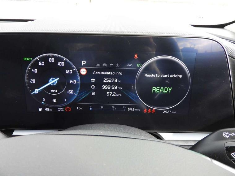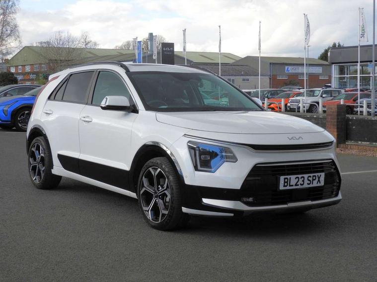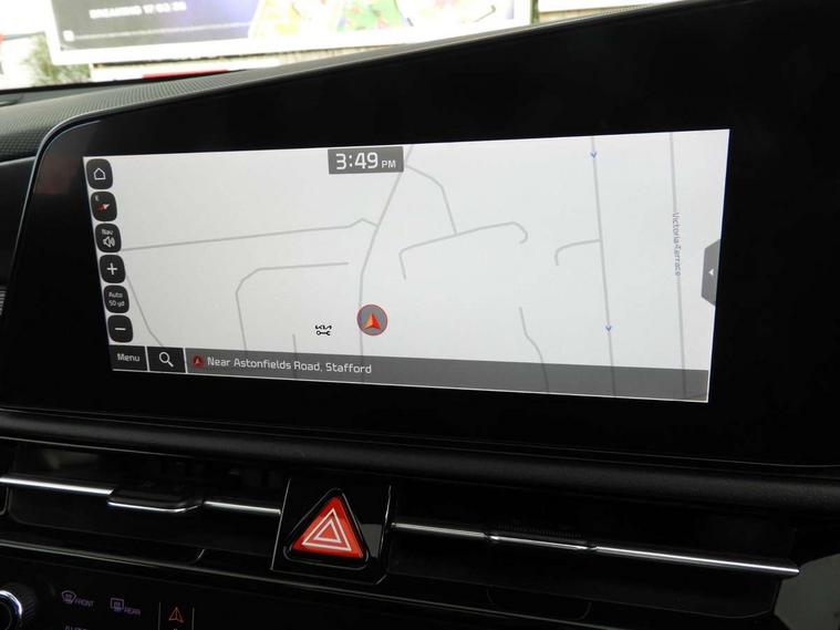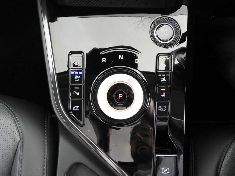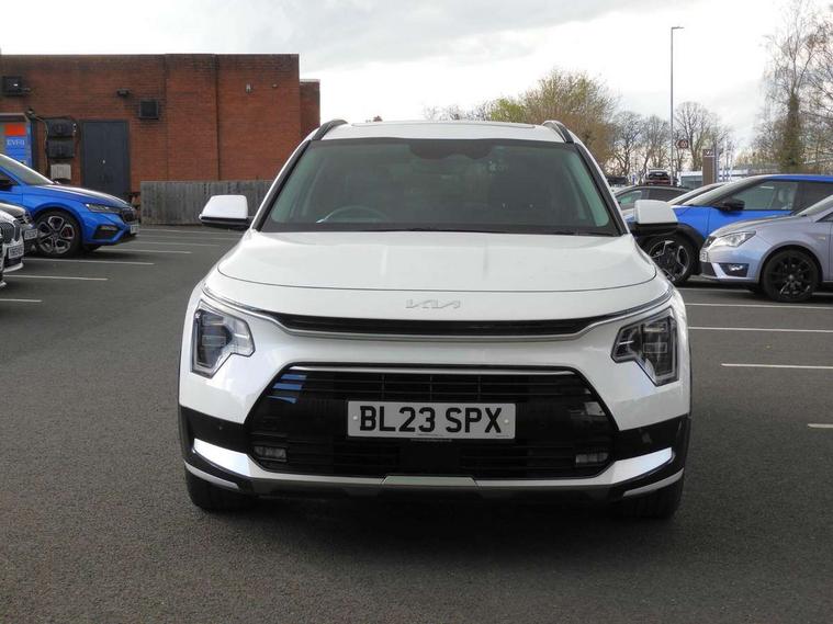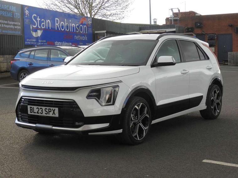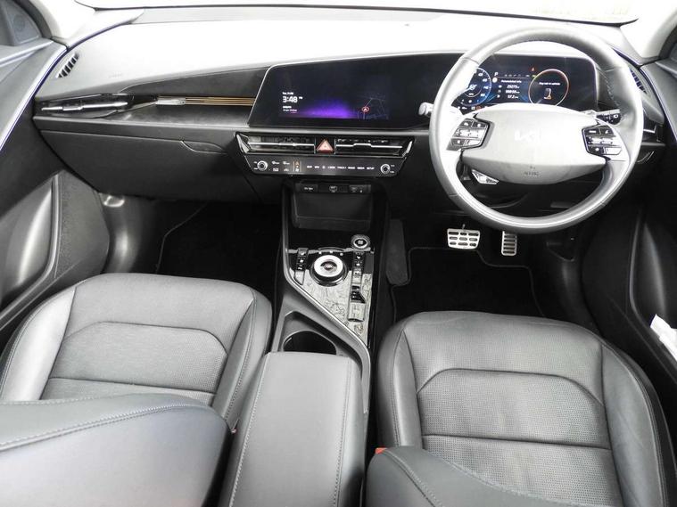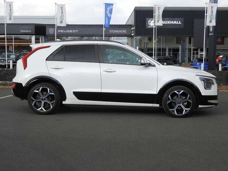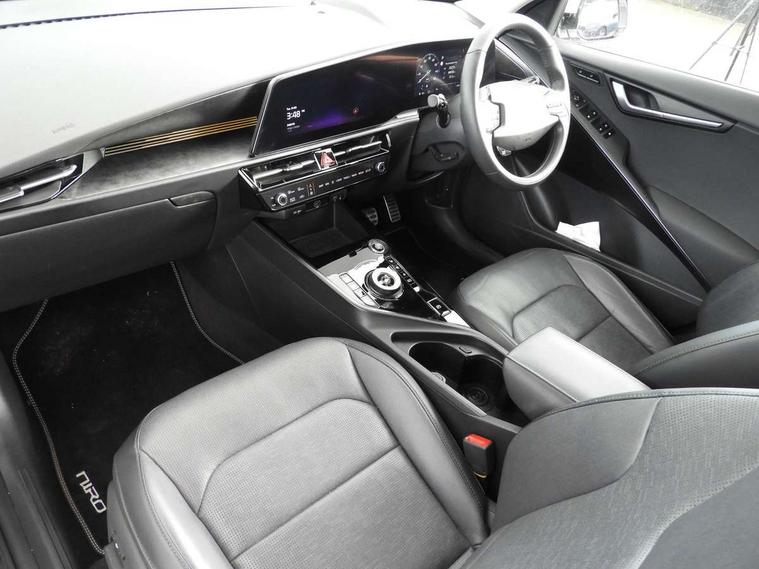 10.25" Supervision colour cluster display, 10.25" touchscreen satellite navigation, Adaptive smart cruise control function (SCC) with stop and go, Apple car play/Android Auto with voice control, Blind spot collision avoidance assist, Drive mode select (Eco, sport), E-call, Emergency stop signalling system, Forward Collision-Avoidance Assist (FCA) 1.5 - City/Pedestrian/Cyclist/Junction turning, Front parking sensors, Head up Display, Highway Driving Assist (HDA), Kia Connect (UVO), Lane Following Assist (LFA), Lane keep assist, Motor driven power steering, Parking collision avoidance assist (PCA), Power opening/closing tailgate, Rear cross traffic alert, Rear parking sensors, Remote smart parking assist, Reversing camera with dynamic guide lines, Safe exit warning (SEW), Speed limit assist, Trip computer with distance/fuel consumption/average speed, Wireless Smartphone charger, 220v AC Inverter, 'Shark fin' mobile antenna, 2 type C USB ports on front seats, 2 USB ports in centre console including 1 type C, 6 speakers, Bluetooth with music streaming, DAB Digital radio, Steering wheel mounted controls, Acoustic windshield, All round electric windows with drivers and front passenger auto up/down and safety function, Auto dimming rear view mirror, Automatic defog system, Automatic headlight control system, Black grille with chrome surround, Body colour bumpers, Body colour exterior door handles, Deluxe door scuff plates, Dual LED headlights (low and high projection), Electric heated door mirrors, Electrically folding door mirrors, Front and rear chrome skid plates, Front fog lights, Heated rear window with timer, High gloss black cladding, High gloss black door mirrors, LED daytime running lights, LED rear combination lights, LED third brake light, One touch single tilting/sliding power sunroof, Privacy glass - Rear windows and tailgate, Rain sensing front wipers, Rear fog lights, Rear side wing doors, Rear spoiler, Rear wiper, Roof rails, Solar glass windscreen, Welcome and follow-me home light functionality, Windscreen Washer Level Warning, 12V socket in front, 12V socket in luggage compartment, 3 seat bench in 2nd row, 60:40 split remote folding rear seats, All-round height adjustable headrests, Aluminium pedals, Artificial leather centre console storage box, Artificial leather steering wheel, Centre console cupholder, Chrome coating interior door handles, Driver and front passenger power adjusted seat, Driver power adjusted memory seat, Driver/passenger sunvisors with illuminated vanity mirrors, Drivers seat power lumbar support, Dual zone automatic air conditioning, Front and rear door storage, Heated front seats, Heated outer rear seats, Heated steering wheel, Illuminated glovebox, Interior door lock/unlock function, ISOFIX Child seat top tethers and anchor fixings, LED overhead console, 2nd row and luggage lamp, Luggage area load cover, Luggage board, Paddle shifts, Passenger premium relaxation seat, Power adjustable lumbar support on front passenger seat, Rear armrest, Seatback pocket - driver, Seatback pocket - front passenger, Shift by wire SBW, Single front passenger seat, Tilt/telescopic adjustable steering wheel, Vegan leather upholstery, Ventilated front seats, Ventiliation ducts to rear compartment, Towing pack - Niro, 3 point seatbelts on all seats, ABS, Automatic unlocking of doors in case of impact, Centre side front airbags, Curtain and side airbags, Drivers knee airbag, Dual shell horn, Electric parking brake with auto hold function, Electronic stability control, Front passenger airbag deactivation, Height adjustable front seatbelts, Hill start assist control (HAC), Manual rear child locks, Rear seat alert system, Traction control, Tyre pressure monitoring system, Alarm system and engine immobiliser, Deadlocks, Engine Start/Stop Button with Smart Entry System, Locking wheel nuts, Visible vehicle identification number, Warranty - 7 Years/ 100, 000 miles, Centre fascia chopped carbon, 18" Alloy wheels, Tyre mobility kit,