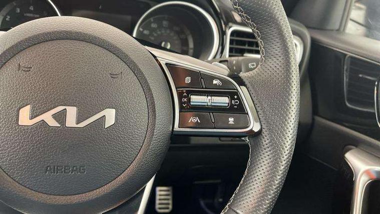 10.25" touchscreen satellite navigation, 4.2" supervision colour cluster display, Apple car play/Android Auto with voice control, Bluetooth with Voice Recognition & Music Streaming, Drive mode select (Normal and Sport), Driver attention warning + (DAW) with leading vehicle departure warning, Emergency call service, Emergency stop signalling system, Forward Collision-Avoidance Assist (FCA) - City/Pedestrian/Cyclist, Kia connect UVO, Lane Following Assist (LFA), Lane keep assist, Manual speed limit assist, Motor driven power steering, Rear parking sensor, Reversing camera system with dynamic guidelines (Integrated into centre fascia screen), Smart cruise control with stop/go functionality, Trip computer, Intelligent Stop and Go, 6 speaker audio system, DAB Radio with MP3, Illuminated USB ports, Steering wheel mounted controls, USB Fast Charger in Front Centre Console, USB type A port, All-round Electric Windows with Front Auto Up & Down Function, Auto dimming rear view mirror, Automatic defog system, Automatic headlights control, Body colour bumpers, Body colour exterior door handles, Body coloured and dark chrome rear skid plate, Body coloured side sill mouldings, Dark chrome window surround, Electric adjustable/heated/folding door mirrors with LED Indicators, Heated rear window with timer, High beam assist, High gloss black and dark chrome radiator grille, High gloss black door mirrors, High Gloss Black rear spoiler - roof, LED daytime running lights, LED front fog lights, LED Headlights, LED High-mounted Brake Light, LED honeycomb rear light, LED rear combination lights, LED rear fog light, Privacy glass (rear side windows and tailgate), Rain sensing front wipers, Rear side wing doors, Rear wash/wipe, Satin chrome dual exhaust trim, Tinted glass, Wide view drivers door mirror, Windscreen Washer Level Warning, 1 x Front 12V socket, 12V power socket in luggage compartment, 3 seat bench in 2nd row, 3 x passenger assist grips, 60/40 split folding rear seat, All-round height adjustable headrests, Aluminium pedals, Black headlining, Centre console storage box/armrest, Cloth/faux leather upholstery, Cupholders in centre console, Cupholders in rear armrest, Dash illumination dimmer switch, Door courtesy lamps, Driver & Front Passenger Sunvisors with Vanity Mirror Illumination & Ticket Holder, Driver + front passenger electric lumbar support, Driver's seat height adjuster, Dual Height Luggage Area Floor, Dual zone automatic air conditioning, Faux leather door centre trim, Front and rear door storage, Front cabin map light with sunglasses case, Front Passenger Seat Height Adjuster, Front seat back pockets, Heated front seats, Heated steering wheel, Interior door lock/unlock function, ISOFIX Child seat top tethers and anchor fixings, Leather D-Cut steering wheel, Leather handbrake, Luggage area light, Luggage area parcel shelf, Luggage hooks, Rear centre armrest, Rear coat hooks, Single front passenger seat, Tilt/telescopic adjustable steering wheel, All round 3-point seatbelts, Anti-lock braking system (ABS), Brake assist system, Dual front side airbags, Dual horn, EBD - Electronic brakeforce distribution, Electronic parking brake, Electronic stability control (ESC) and vehicle stability management (VSM), Front passenger airbag cut-off switch, Height adjustable front seatbelts, Hill start assist control (HAC), Impact sensing auto door unlocking, Rear door child safety locks, Seatbelt reminder warning, Twin curtain airbags, Twin front airbags, Tyre pressure monitoring system, Alarm system, Engine Immobiliser & Deadlocks, Locking wheel nuts, Remote central door locking with fold away key, Speed sensitive auto door locking, Satin Chrome Fascia Trim, 17" GT-Line alloy wheels, Tyre mobility kit,
