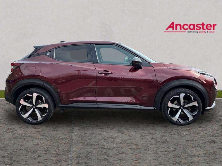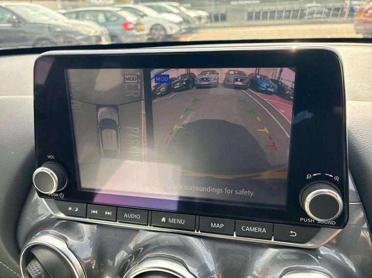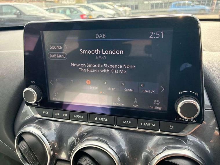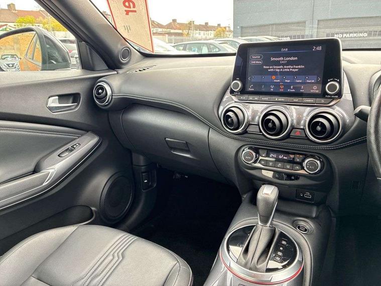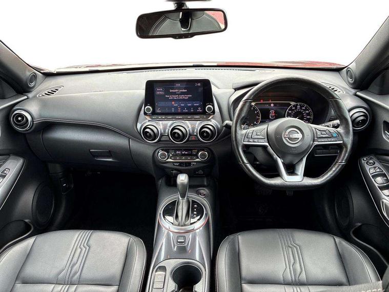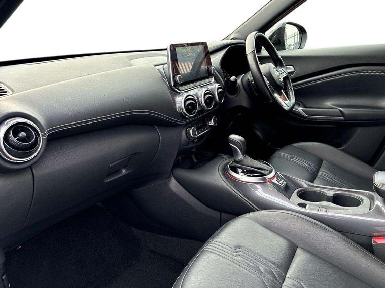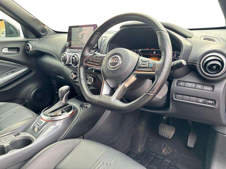 7" full colour TFT screen combimeter, Apple CarPlay and Google Android auto, Drive modes select (Eco, normal and sport), Emergency and breakdown call, Front parking sensor, Idle start/stop system, Intelligent lane intervention, Lane departure warning system, Nissan connect 8" touch screen entertainment system, Nissan connect nav with TomTom traffic, Nissan connect services and Wifi connection, Outside temperature sensor, Power Steering, Rear parking sensor, Traffic sign recognition, Trip computer, Voice recognition, Gasoline particulate filter, 10 Bose speakers 6 speakers and 2 headrest speakers for driver/passenger seats, Bluetooth system, USB, Aux-in and 12V socket, Bose personal sound stage control, DAB Digital radio, Rear console USB port, Auto dimming interior rear view mirror, Auto headlights, Automatic hazard signal with emergency stop signal, Body colour bumpers, Body colour door handles, Electrically adjustable door mirrors with integrated indicators, Follow me home headlights, Front and rear electric window with one touch driver window, Heated and auto folding door mirrors, High beam assist, LED daytime running lights, LED front fog lights, LED headlamps, LED rear fog lamp, LED rear lamps, Rain sensor windscreen wipers, Rear privacy glass, Rear side wing doors, Rear wiper, Thermaclear heated windscreen, Three blink turn signal, 3 height adjustable rear headrests, 3 seat bench in 2nd row, 60/40 split folding rear seat, Automatic climate control, Card holder on driver sunvisor, Door ambient lighting, Driver and passenger sliding and reclining seats, Driver seat back pocket, Driver side rear coat hanger, Driver/passenger sunvisors and vanity mirrors, Front and rear cabin lights, Front armrest, Front door pockets with bottle holders, Front head restraints, Front passenger isofix child seat anchorage point, Front/rear passenger grab handles, Gear console ambient circle lighting, Grey synthetic leather kneepad, Heated front seats, Height adjustable driver's seat, Height adjustable passenger seat, Internal chrome door handles, Leather gearshift knob, Leather steering wheel, Luggage board, Luggage space lighting, Monoform sporty seats, Multifunction steering wheel, Passenger seat back pocket, Rear door bottle holders, Single front passenger seat, Steering wheel mounted gearshift paddles, Synthetic leather upholstery, Telescopic steering wheel adjustment, Two cupholders in front centre console, Two rear isofix child seat anchorage points with top tether, Welcome light and console tray ambient lighting, ProPilot pack - Juke, ABS with EBD and brake assist, Active ride control, Active Trace Control, Driver and passenger airbags, Driver and passenger side airbags, Electric handbrake with auto hold function, Electronic Stability Programme (ESP), Front and rear curtain airbags, Height adjustable seatbelts, Hill start assist, Intelligent emergency braking with pedestrian and cyclist recognition, Rear door child safety locks, Seatbelt reminder for driver/front passenger and rear seats, Single tone horn, Three 3 point rear seatbelts, Traction control, Tyre pressure monitoring system, VDC Dynamic Vehicle Control, Ventilated rear brake discs, Alarm, Immobiliser, Intelligent key and start push button with walk away lock and approach unlock functions, Remote central locking,