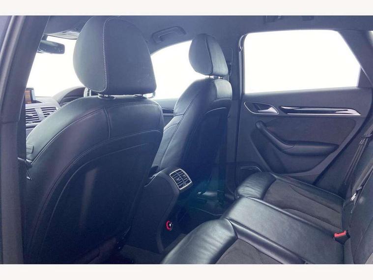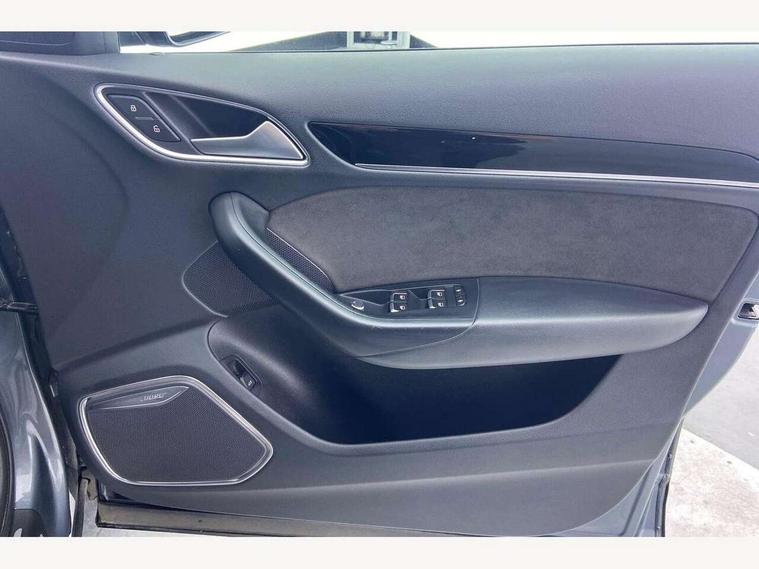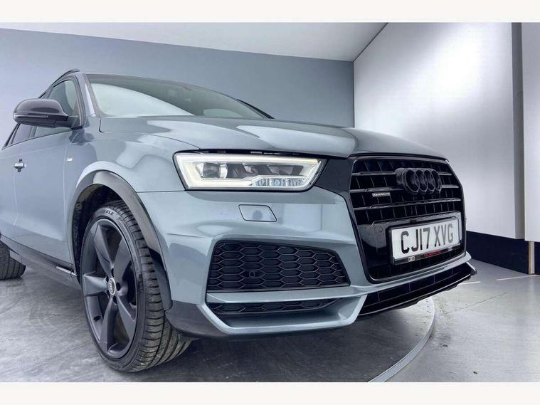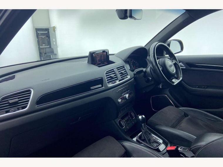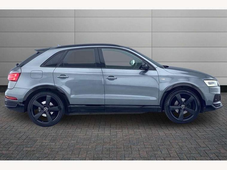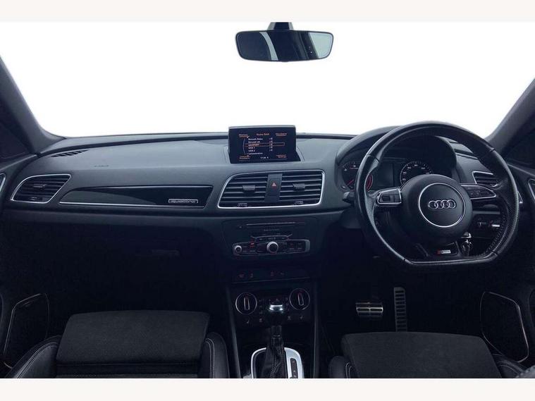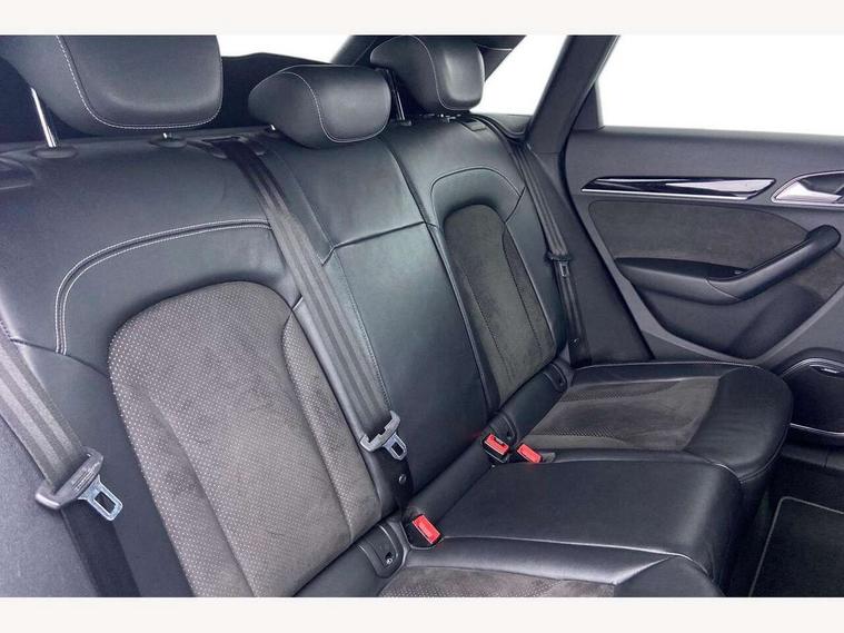 6.5" colour display screen, Audi drive select, Cruise control, Electro-mechanical PAS, Low washer fluid indicator, MMI - Multi Media Interface control system, On board computer, Remote electric boot opening/closing, Service interval indicator, Voice control system, Diesel particulate filter, Sports suspension, Audi music interface, BOSE sound system, DAB digital radio module, Acoustic windscreen, Aluminium window surround, Auto dimming rear view mirror, Black exhaust tailpipes, Black high gloss door mirrors, Black roof rails, Body coloured bumpers, Chrome fog light surround, Chrome grille, Coming home function, Door mirror integrated indicators, Front and rear electric windows, Front lip spoiler, Heated windscreen washer jets, High Gloss Black Contrast Bumpers, High Gloss Black rear spoiler, LED daytime running lights, LED headlights with headlight washers, LED rear lights, Light and rain sensor for auto activation of lights and windscreen wipers, Loading sill protector in stainless steel, Privacy glass, Rear diffuser with platinum insert, Rear wiper, S Line body styling, Sunband for windscreen, 12V socket in rear centre console, 3 spoke flat bottom multi-function perforated leather steering wheel with contrast stitching and aluminium gearshift paddles, Aluminium door sill trims, Aluminium gear knob, Aluminium pedals, Black cloth headlining, Dual zone climate control, Electric front lumbar adjustment, Front and rear headrests, Front and rear velour floor mats, Front centre armrest with storage compartment and angle adjustment, Front sports seats, Height/reach adjust steering wheel, ISOFIX on front passenger and rear outer seats, Jack and tool kit, Retractable luggage cover, Reversible boot floor, Split fold rear seat, Storage compartment and 12V socket, Under floor storage in luggage area, Audi Exclusive black styling pack - Q3, LED interior light pack - Q3, 3x3 point rear seatbelts, ABS+Electronic Brake force Distribution, Curtain airbags, Driver and passenger airbags, Driver and passenger side airbags, EDL + ASR, Electrically operated child locks on rear doors, Electromechanical parking brake, ESP, First aid kit, Front passenger airbag deactivation, Head airbags, Seatbelt warning light, Tyre pressure monitoring system, Warning triangle, Locking wheel bolts, Remote central locking, Thatcham category 1 alarm + immobiliser, Piano black finish inlay, Space saver spare wheel,
