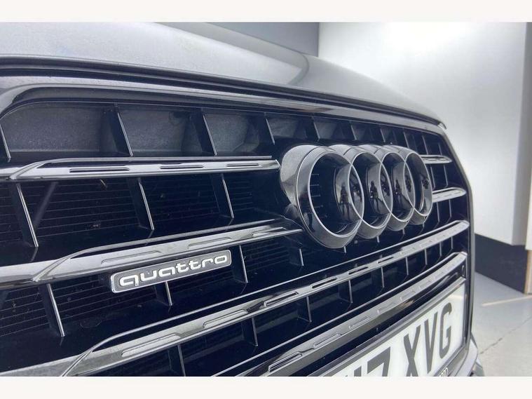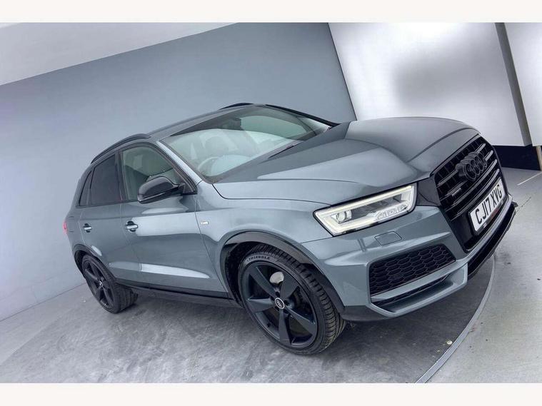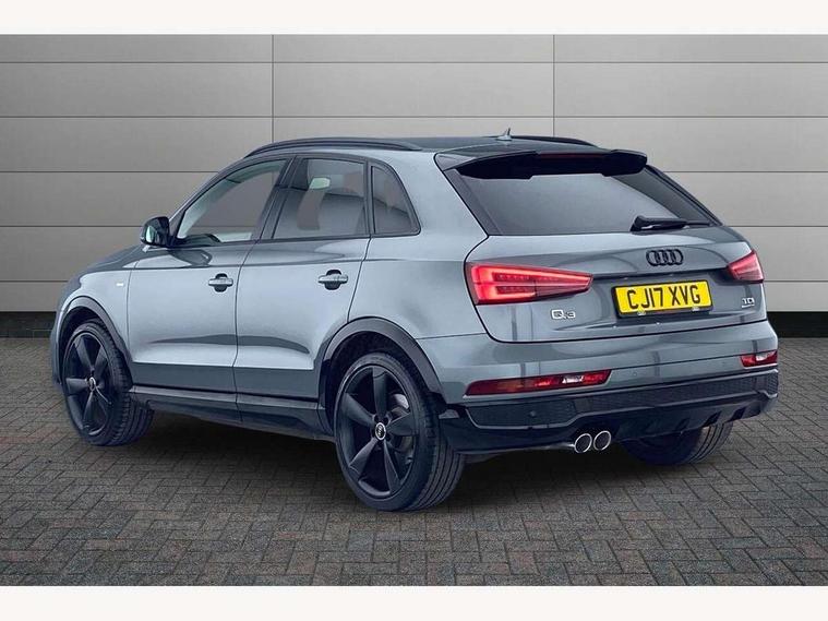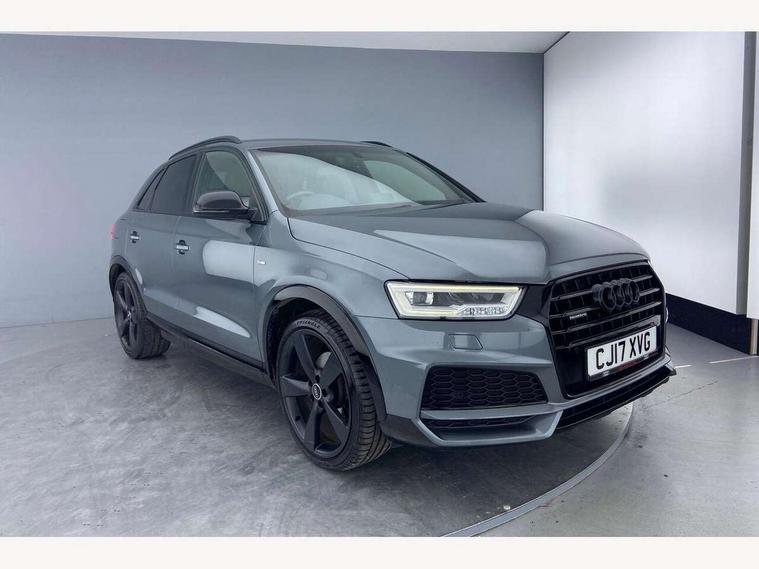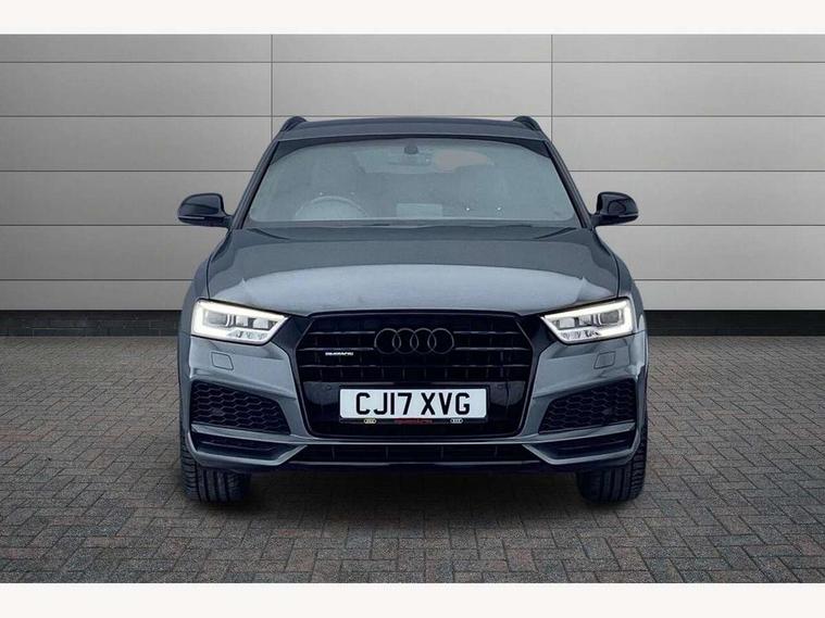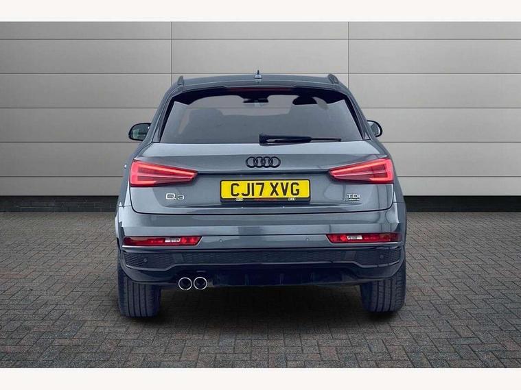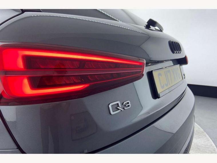 6.5" colour display screen, Audi drive select, Cruise control, Electro-mechanical PAS, Low washer fluid indicator, MMI - Multi Media Interface control system, On board computer, Remote electric boot opening/closing, Service interval indicator, Voice control system, Diesel particulate filter, Sports suspension, Audi music interface, BOSE sound system, DAB digital radio module, Acoustic windscreen, Aluminium window surround, Auto dimming rear view mirror, Black exhaust tailpipes, Black high gloss door mirrors, Black roof rails, Body coloured bumpers, Chrome fog light surround, Chrome grille, Coming home function, Door mirror integrated indicators, Front and rear electric windows, Front lip spoiler, Heated windscreen washer jets, High Gloss Black Contrast Bumpers, High Gloss Black rear spoiler, LED daytime running lights, LED headlights with headlight washers, LED rear lights, Light and rain sensor for auto activation of lights and windscreen wipers, Loading sill protector in stainless steel, Privacy glass, Rear diffuser with platinum insert, Rear wiper, S Line body styling, Sunband for windscreen, 12V socket in rear centre console, 3 spoke flat bottom multi-function perforated leather steering wheel with contrast stitching and aluminium gearshift paddles, Aluminium door sill trims, Aluminium gear knob, Aluminium pedals, Black cloth headlining, Dual zone climate control, Electric front lumbar adjustment, Front and rear headrests, Front and rear velour floor mats, Front centre armrest with storage compartment and angle adjustment, Front sports seats, Height/reach adjust steering wheel, ISOFIX on front passenger and rear outer seats, Jack and tool kit, Retractable luggage cover, Reversible boot floor, Split fold rear seat, Storage compartment and 12V socket, Under floor storage in luggage area, Audi Exclusive black styling pack - Q3, LED interior light pack - Q3, 3x3 point rear seatbelts, ABS+Electronic Brake force Distribution, Curtain airbags, Driver and passenger airbags, Driver and passenger side airbags, EDL + ASR, Electrically operated child locks on rear doors, Electromechanical parking brake, ESP, First aid kit, Front passenger airbag deactivation, Head airbags, Seatbelt warning light, Tyre pressure monitoring system, Warning triangle, Locking wheel bolts, Remote central locking, Thatcham category 1 alarm + immobiliser, Piano black finish inlay, Space saver spare wheel,