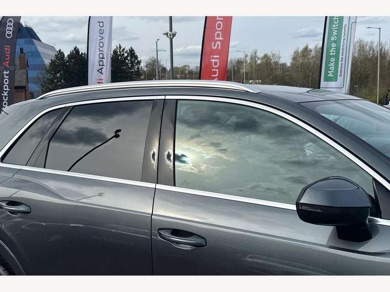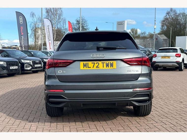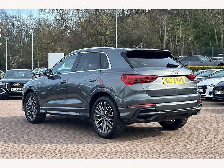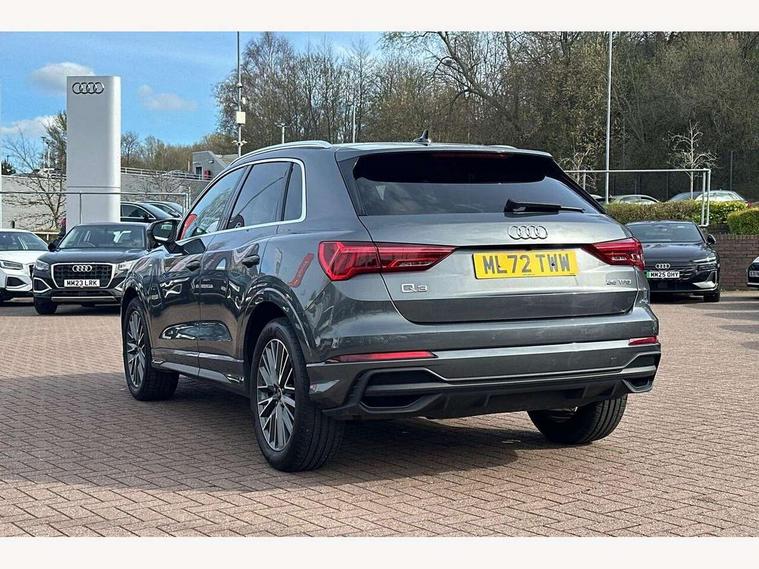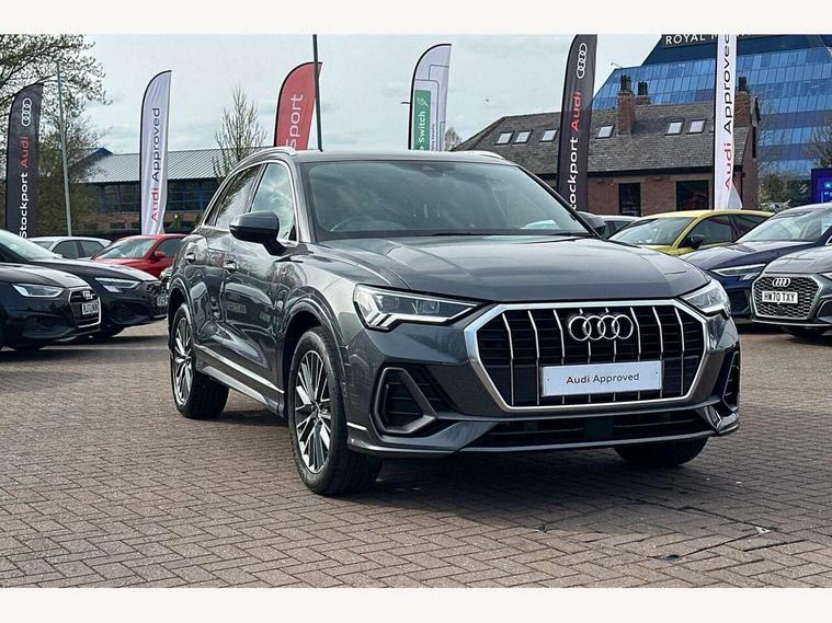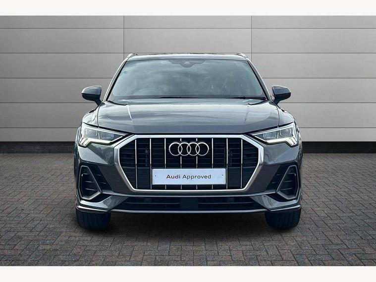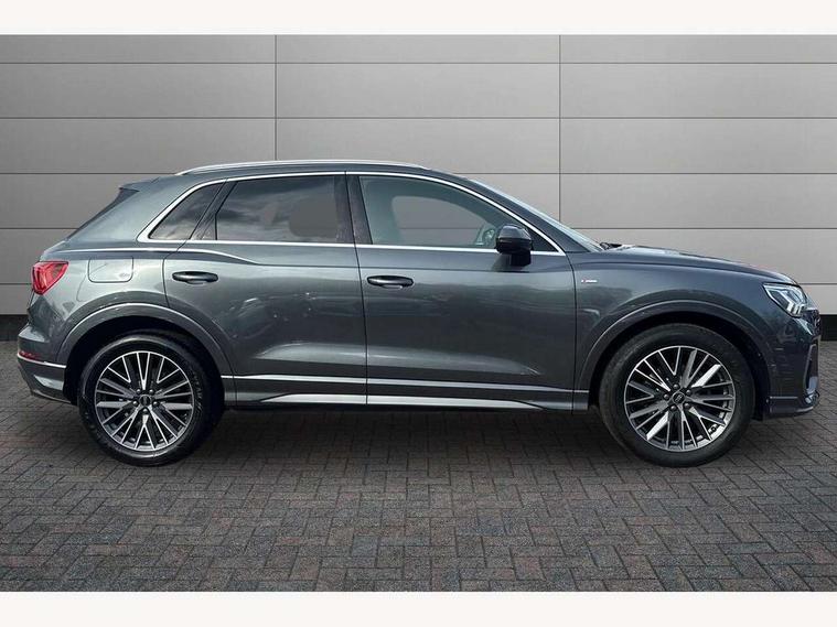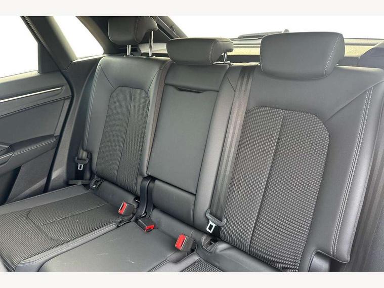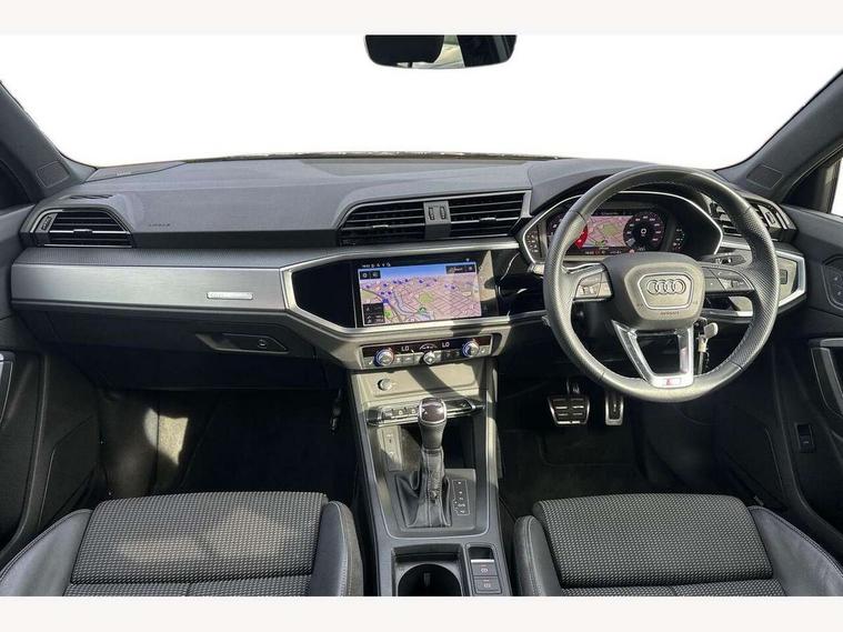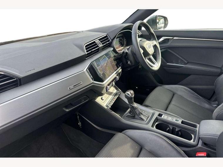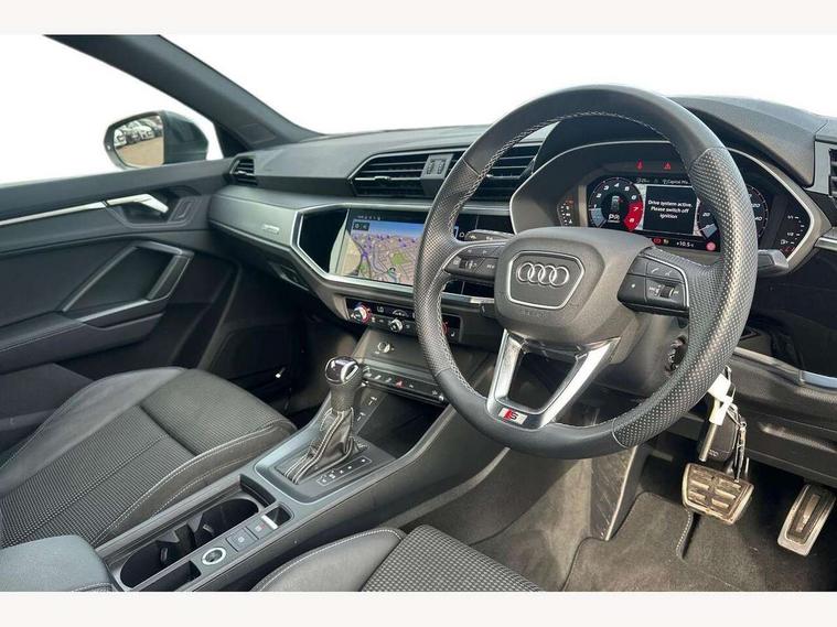 Amazon alexa Integration, Audi drive select, Audi lane departure warning, Audi Virtual Cockpit - 10.25" display, Bluetooth interface, Camera based traffic sign recognition, Legal emergency call, MMI Navigation Plus with high resolution 10.1 inch touchscreen colour display, Power operated tailgate, Progressive steering, Service interval indicator, Smartphone interface includes wireless Apple carplay/Android Auto, Start stop system with recuperation, Voice control system with natural language interaction, Sports suspension, 2 USB-C ports with charge and data functions, 6 passive loudspeakers, DAB digital radio module, Acoustic windscreen, Aluminium roof rails, Aluminium window trim, Auto dimming frameless rear view mirror, Body colour front spoiler blade, Body coloured bumpers, Electrically folding, adjustable and heated door mirrors with integrated LED side indicators and kerb view function for passenger side, Front and rear electric windows, Front fog lights, Front side air inlets in matt platinum grey, Grille vertical bars in aluminium silver/Matt, High gloss black finish B and C pillars, LED Dynamic rear indicators, LED headlights with LED daytime running lights, LED rear lights, LED third brake light, Privacy glass dark tinted rear and rear-side windows (from B-pillar backwards), Rain and light sensors, Rear diffuser grille in grained matt black, Rear diffuser strip in matt titanium black, Rear side wing doors, Rear wiper, S line badges on front wings, S Line front and rear bumpers, Side skirt insert in matt Platinium grey, Titanium black radiator grille, Variable front intermittent wipers, 12V socket in rear centre console, 3 seat bench in 2nd row, 40:20:40 folding with manual adjustment for 60:40 forwards/backwards position and backrest angle, Adjustable rear seat bench/backrest with centre armrest and cupholder, Black cloth headlining, Dual zone electronic climate control, Front and rear black floor mats with contrast stitching in rock grey, Front and rear headrests, Front and rear roof module including reading lights, Front centre armrest, Glove compartment lighting, Height and reach adjustable steering wheel, Illuminated door sill trims with S logo, ISOFIX child seat mounting for front passenger with airbag deactivation and outer rear seat including top tether attachment point for outer rear seats, Luggage compartment light, Manual front seats with height adjustment, Perforated leather gearknob, Single front passenger seat, Stainless steel luggage compartment sill finisher, Stainless steel pedals, Ambient lighting pack - Q3, Non smoking pack - Q3, 3x3 point rear seatbelts, 6 airbags - Driver, front passenger, curtain and side windows, Audi pre-sense front with pedestrain and cyclist recognition, Electrically operated child locks on rear doors, Electromechanical parking brake, Electronic stabilisation control including ABS, ASR and EDL, Front seatbelt reminder, Hill descent control, Hill hold assist, Pre sense basic, Seatbelt monitoring, Tyre pressure warning, Warning triangle and first aid kit, Anti theft alarm, Anti theft wheel bolts, Immobiliser, Remote central locking, Dark matt brushed aluminium inlay, Detail dashboard around MMI touch colour display in glass look, black with surround in aluminium look, Leatherette door armrest,