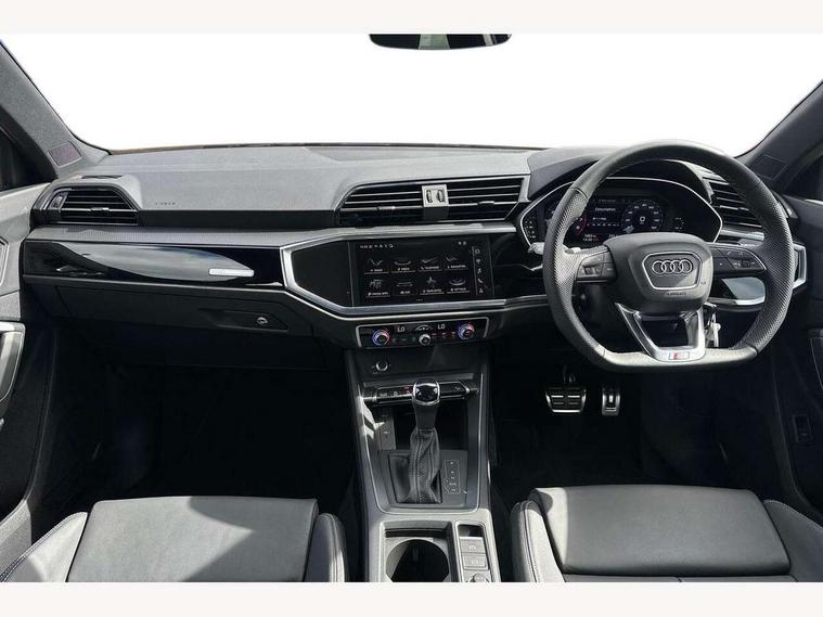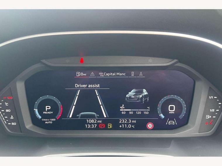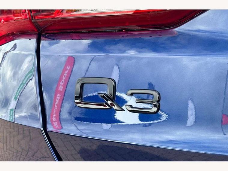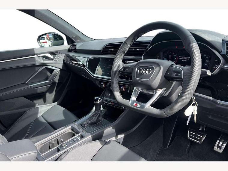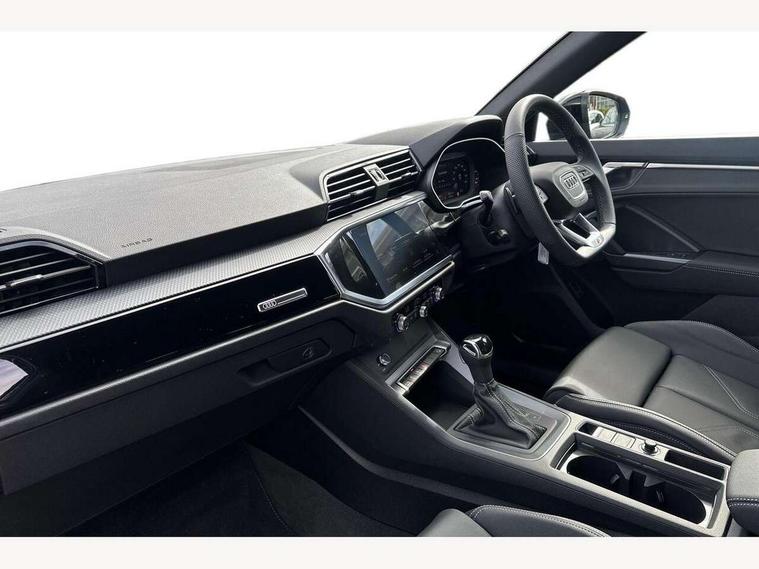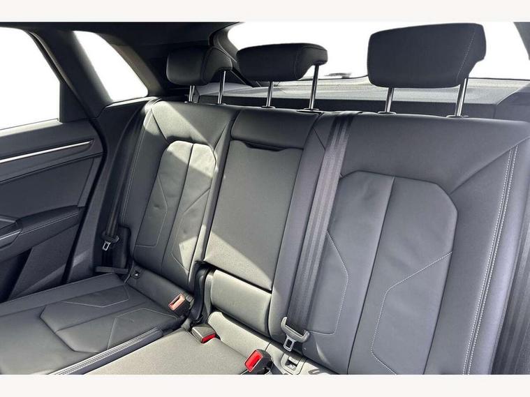 Amazon alexa Integration, Audi connect safety and service, Audi drive select, Audi lane departure warning, Audi Virtual Cockpit - 10.25" display, Bluetooth interface, Camera based traffic sign recognition, Distraction and Fatigue warning, Legal emergency call, MMI Navigation Plus with high resolution 10.1 inch touchscreen colour display, Power operated tailgate, Progressive steering, Service interval indicator, Smartphone interface includes wireless Apple carplay/Android Auto, Start stop system with recuperation, Voice control system with natural language interaction, Sports suspension, 2 USB-C ports with charge and data functions, 6 passive loudspeakers, DAB digital radio module, Acoustic windscreen, Anthracite black radiator grille, Audi Beam uses LEDs to project the Audi logo onto the ground as you exit your Q3, Auto dimming door mirrors, Auto dimming frameless rear view mirror, Black roof rails, Electrically folding, adjustable and heated door mirrors with integrated LED side indicators and kerb view function for passenger side, Front and rear electric windows, Front fog lights, Grille vertical bars in aluminium silver/Matt, High gloss black finish B and C pillars, LED Dynamic rear indicators, LED headlights with LED daytime running lights, LED rear lights, LED third brake light, Privacy glass dark tinted rear and rear-side windows (from B-pillar backwards), Rain and light sensors, Rear diffuser grille in grained matt black, Rear diffuser strip in matt anthracite black, Rear side wing doors, Rear wiper, S line bumpers in contrasting Manhattan grey, Variable front intermittent wipers, 12V socket in rear centre console, 3 seat bench in 2nd row, 40:20:40 folding with manual adjustment for 60:40 forwards/backwards position and backrest angle, Adjustable rear seat bench/backrest with centre armrest and cupholder, Black carpet mats, Black cloth headlining, Dual zone electronic climate control, Electric lumbar support, Front and rear black floor mats with contrast stitching in rock grey, Front and rear headrests, Front centre armrest, Height and reach adjustable steering wheel, Illuminated door sill trims with S logo, ISOFIX child seat mounting for front passenger with airbag deactivation and outer rear seat including top tether attachment point for outer rear seats, Luggage compartment sill protection in stainless steel, Manual front seats with height adjustment, Perforated leather gearknob, Single front passenger seat, Stainless steel pedals, Twin leather upholstery with front sport seats + S embossing, Black styling pack - Q3, Non smoking pack - Q3, 3x3 point rear seatbelts, 6 airbags - Driver, front passenger, curtain and side windows, Audi pre-sense front with pedestrain and cyclist recognition, Electrically operated child locks on rear doors, Electromechanical parking brake, Electronic stabilisation control including ABS, ASR and EDL, Front seatbelt reminder, Hill descent control, Hill hold assist, Pre sense basic, Seatbelt monitoring, Tyre pressure warning, Warning triangle and first aid kit, Anti theft wheel bolts, Immobiliser, Remote central locking, Thatcham approved category 1 anti theft alarm, Aluminium look interior elements, Detail dashboard around MMI touch colour display in glass look, black with surround in aluminium look, Leatherette door armrest, Piano black inlay,