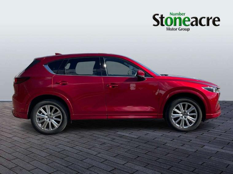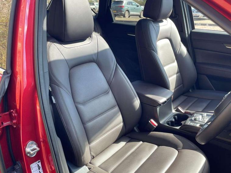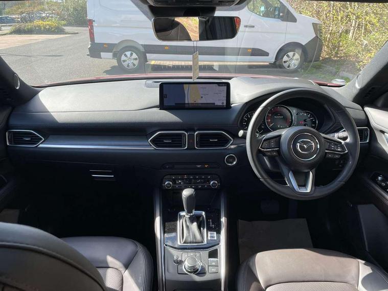 10.25" display with Mazda Connect infotainment, 360 degree surround camera, 7" colour TFT display, Advanced blind spot monitoring, Bluetooth connectivity with voice control, Collision prevention assist, Connected services, Cruising Traffic Support, Drive mode selector, Driver attention alert system, Electric power steering, Emergency stop signalling system, Engine start/stop button, Forward collision warning, Front and rear parking sensors, Integrated navigation system, Intelligent speed assist, Lane departure warning system, Lane keep assist, Power liftgate, Qi wireless phone charging, Radar cruise control with Stop and Go, Rear cross traffic alert, Service indicator, Traffic sign recognition (TSR), Trip computer, Windscreen projected colour active driving display (HUD) with memory, Wireless apple car play/android Auto, Cylinder Deactivation, i-stop, AM/FM radio, Bluetooth audio streaming, Bose premium sound system with 10 speakers, DAB Digital radio, Multimedia Commander including separate volume dial, Steering wheel mounted audio controls, Adaptive LED Headlights, Automatic headlights, Body colour door mirrors, Body colour roof spoiler, Body coloured front and rear lower bumper mouldings, Body coloured tire arch and side mouldings, Coming/leaving home lighting function, Door mirror integrated indicators, Dual large chrome tailpipes, Dusk sensitive headlamps, Electric front/rear windows with one touch auto up/down, Frameless auto dimming interior rear view mirror, Front grille in gloss black finish, Front grille in gloss black with black accent + chrome signature wing, Gloss black B and C pillars garnish, Gloss black front grille accent, Intermittent rear wash/wipe, LED auto levelling, LED daytime running lights, LED front fog lights, LED third brake light, Power folding and heated door mirrors, Power tilt/slide sunroof, Privacy glass (rear side windows only), Rain sensing front wipers, Real wood inlay dashboard panel, Rear side wing doors, Scuff plates, Shark fin antenna, Signature LED rear combination lights, Variable intermittent front wash/wipe, Vinyl with real wood inlay door trim panel, Windscreen wiper de-icer, 12v electrical power outlet, 3 seat bench in 2nd row, 3 stage heated front seats, 40:20:40 Karakuri fold-flat seat system, 6 way electric adjustable passenger seat, 8 way electric driver seat with lumbar support + memory, Black roof lining, Cargo room flat floor board with waterproof undertray, Driver seat power slide, recline and height adjustment, Driver, Front passenger and two rear grab handles with coat hooks, Driver/passenger front seatback pockets, Driver/passenger sunvisors + illuminated vanity mirrors (drivers with ticket holder), Dual zone climate control, Folding centre armrest with 2 cup holders, Front and rear door pockets, Front centre storage with two cupholders, Front passenger seat power slide, recline and height adjustment, Front seat ventilation, Heated outer rear seats, Heated steering wheel, Humidity sensor, Illuminated glovebox, Interior dome light with integral spotlight, ISOFIX child seat anchorage points attached on outer rear seats, Karakuri tonneau cover, Leather gear knob, Leather steering wheel with unique stitching and chrome centre bezel, Luggage compartment LED lighting, Luggage compartment power outlet, Nappa leather upholstery, Paddle shifts, Rear air vents, Rear headrests, Rear seat recline, Roof mounted sunglasses holder, Single front passenger seat, Three height adjustable head restraints, Tilt/height adjustable steering wheel, USB Connectivity (2x front Type-C, 2x rear Type-B), White interior LED illumination lighting, 3 point front seatbelts with pre-tensioners, 3 rear 3 point seatbelts, ABS, Advanced Smart City Brake Support - SCBS, Child locks on rear doors, Driver and front passenger side airbags, DSTC-Dynamic Stability and Traction Control, Dual front airbags, Electronic brake force distribution, Electronic parking brake with auto hold, ESP, Front and rear curtain airbags, Front passenger airbag deactivation, G-Vectoring control, Hill hold assist, Rear smart city brake support, Seatbelt reminder front and rear, Single stage passenger airbags, Smart brake support with forward obstruction warning, Tyre pressure monitoring system, Automatic door locking when moving off, Deadlock, Immobiliser, Power door locks, Remote central locking, Smart keyless entry, Thatcham Cat.1 alarm, Upper dashboard and door cards wood trim, 19" exclusive design bright alloy wheels, Tyre repair kit,