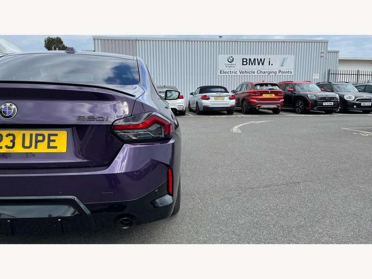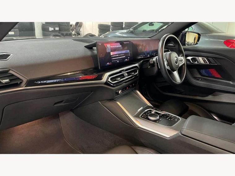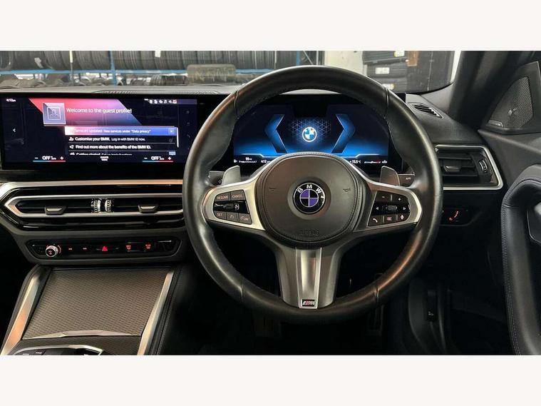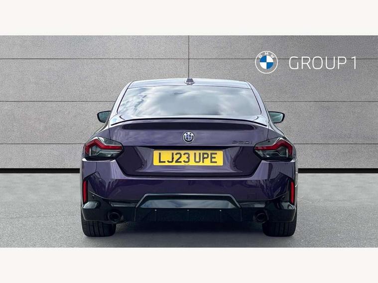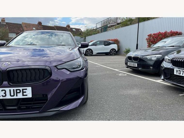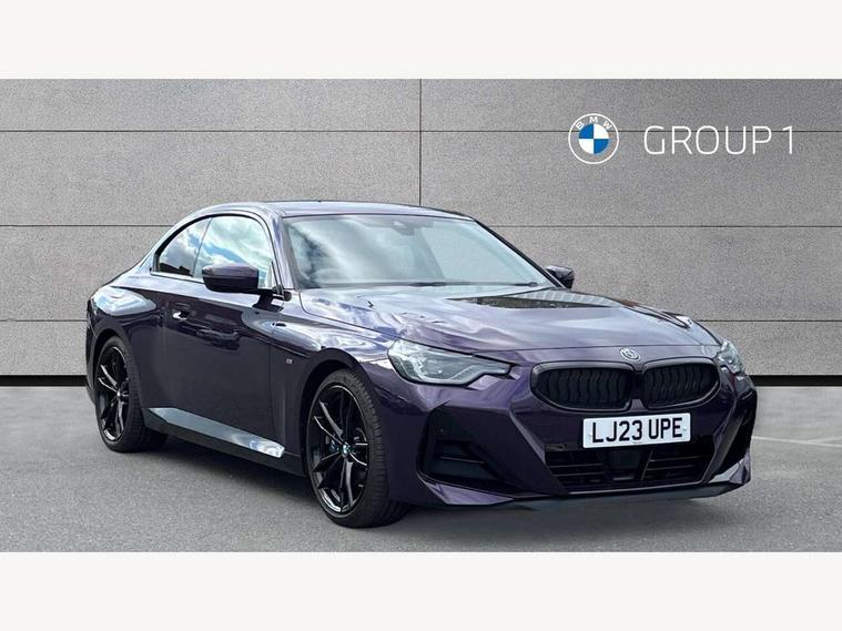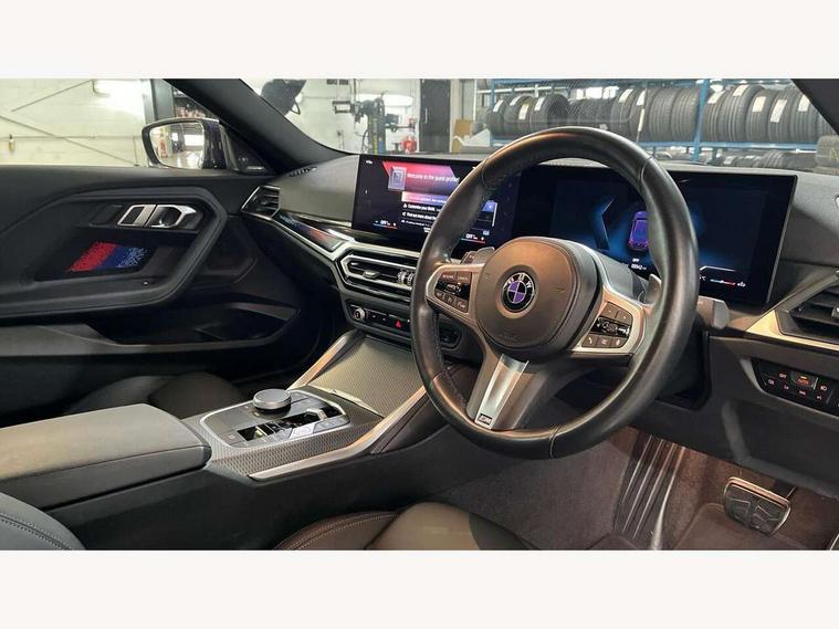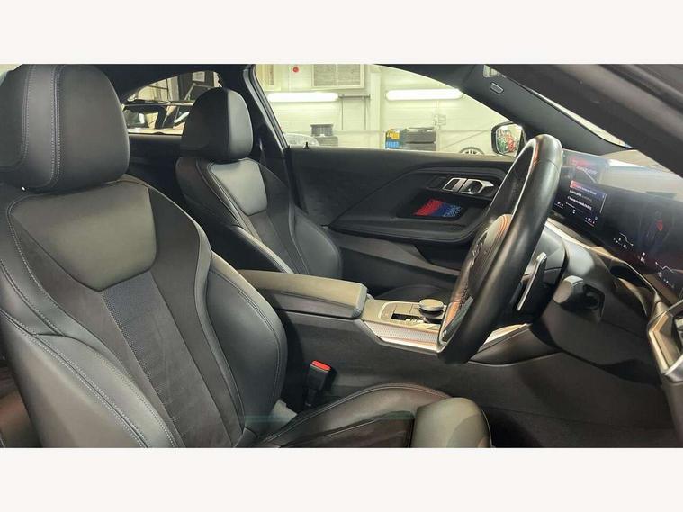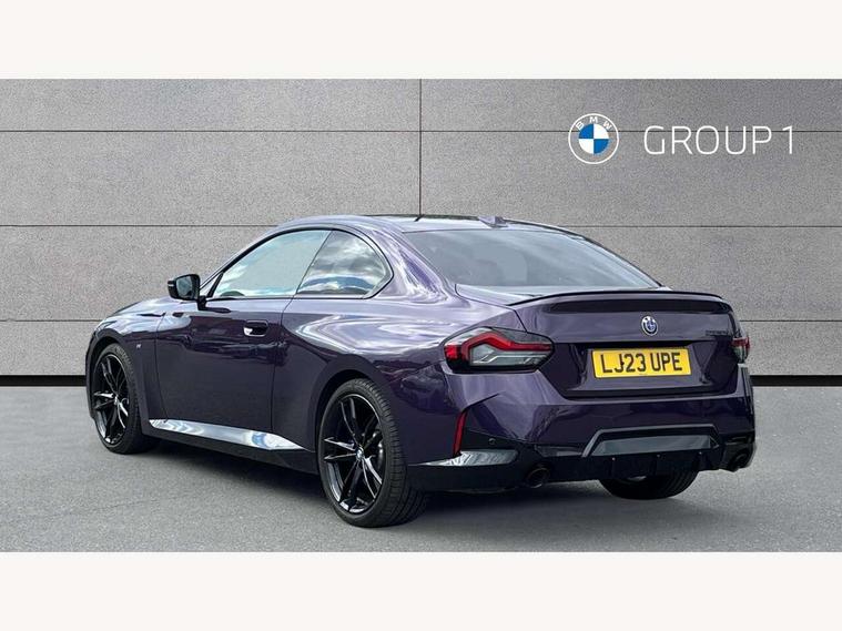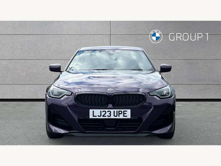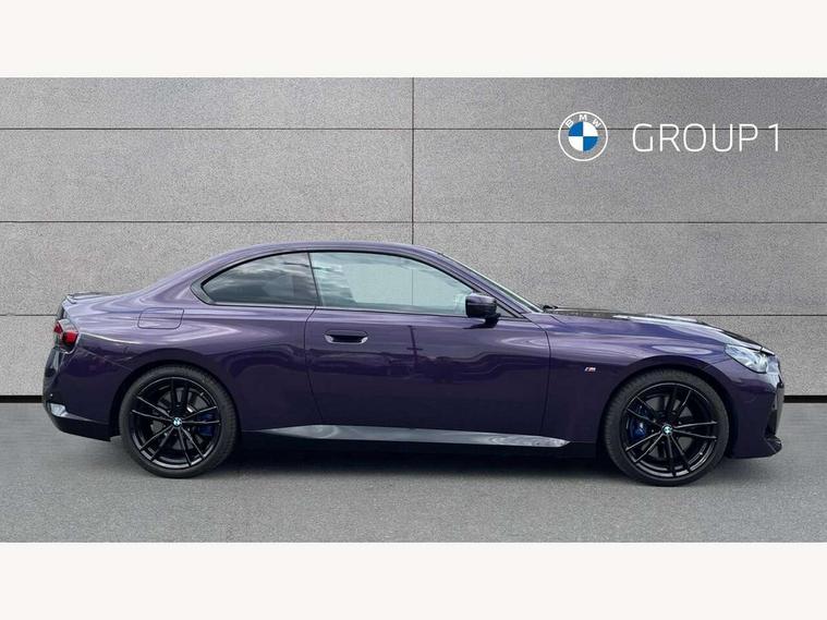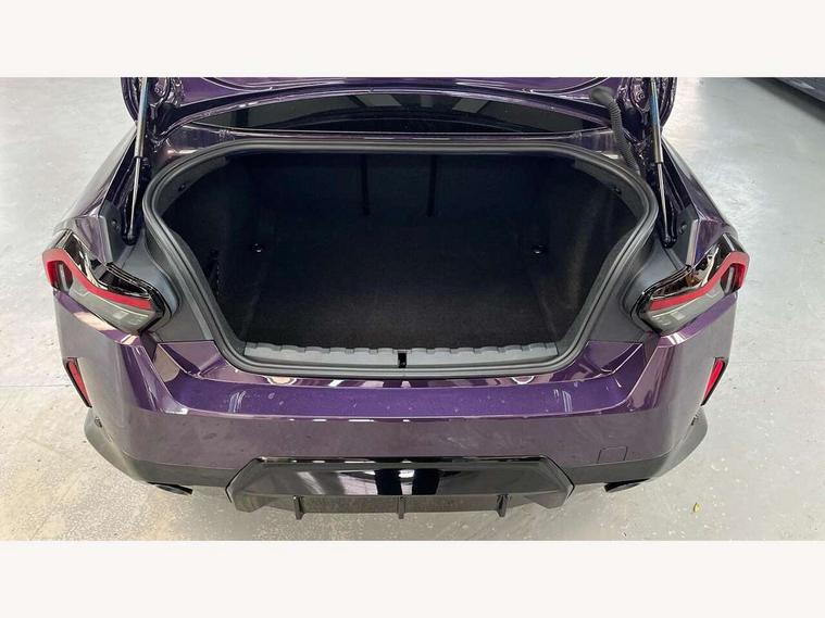 Attentiveness assist, Auto start-stop, Bluetooth, BMW ConnectedDrive online services, BMW Teleservices, Check Control warning system for monitoring of lights and door/luggage compartment open warning, Direct selection buttons, Drive off assistant, Eco pro mode, Electric power steering, Front and rear parking sensors, Front/rear Parking distance control, iDrive controller with turn and press function, Integrated owners handbook, Intelligent functions, Live cockpit plus with nav function 12.3" instrument cluster and 14.9" centre display, Oil sensor for level and grade, Optimum shift indicator, Personal Profile, Touch operation on control display, Variable sport steering, Widescreen multi-media display, Aluminium lightweight construction, Balancer shaft, BMW TwinPower Turbo four-cylinder petrol engine, Double VANOS, Drive performance control with ECO PRO comfort + sport mode, Electronic differential lock, High precision injection, M sport suspension, Petrol Particulate Filter, Sport automatic steptronic transmission with gearshift paddles, manual gearshift time display, launch control, coasting idle ECO PRO/COMFORT modes, Twin scroll turbocharger with Valvetronic, DAB tuner, Acoustic windscreen wipers for reduced driving noise, Adaptive LED Headlights, Automatic windscreen wipers and automatic headlight, Automatically dimming rear view mirror, Body colour door handles flush with door surface, Body colour door mirrors, Body colour front and rear bumpers, Daytime running lights, Electric windows - front and rear, with open/close fingertip control and trap release, Exhaust tailpipes x2 - 90mm in left and right, Fading support, Front and rear bumper system with replaceable deformation elements, Front door sill finishers in black plastic with BMW designation, Front windscreen wipers with integrated washer jets, Green tinted heat protection glazing, High beam assistant, High gloss shadowline exterior trim in mirror triangle cover, mirror cover panel, mirror bezel and window border, High level third brake light, Indicators integrated int mirror housing, LED registration plate light, LED technology rear tail lights, brake lights and turn indicators, Lightweight engineering, Model designation on right side of tailgate, One piece kidney grille with hight gloss chrome surround, Rear boot, Rear fog lights, Reversing light in rear light cluster, Shark fin antenna, Single part LED rear lights with smoked glass components, Trailer stabilisation logic, Visible VIN plate, 12V power socket in front centre console with blanking plug, 2 cupholders in front centre console, 3 zone automatic air conditioning, Ambient lighting, Compartment in front of cupholder, Conditioned based service, Driver seat backrest width adjustment, Front and rear side armrests integrated into door trim, Front armrest, Front door pockets, Front head restraints, Front sport seats, Heated front seats, Illuminated glove compartment with separate small compartment, M headliner Anthracite, M sport leather steering wheel, Manually adjustment steering wheel column, Rear seat backrest with manual 40:20:40 split folding, Rear seat centre foldable armrest with integrated cup holder, Single front passenger seat, Storage compartment between rear seats, Storage tray and compartment with cover in centre console, Sun visors with vanity mirrors and insert tab, Through loading system with 40/20/40 split folding 2 rear seat in 2nd row, Two folding rear seat headrests, Velour floor mats, Additional storage compartment pack without USB - 2 Series Coupe, Connected pack professional - 2 Series Coupe, Interior and exterior mirror pack - 2 Series Coupe, M Sport exterior styling aerodynamics pack - 2 Series Coupe, 2 tone horn, Anti lock braking system (ABS) with cornering brake control, Automatic Stability Control (ASC), BMW emergency call, Brake drying, Child seat ISOFIX attachment for the two outer rear seats, Crash sensor activating of airbags, Unlocking doors, hazard warning lights, interior light, safety battery terminal, Deactivation of fuel pump in the event of a crash, Driver and front passenger airbags, Driver and front passenger side airbags, integrated in the door side seat backrest bolsters for all seat variants, Dynamic brake control, Dynamic stability control + (DSC+), Dynamic Traction Control - DTC, Electrically operated hand brake including automatic hold function and automatic release when driving off, Front and rear disc brakes, Front passenger airbag deactivation, Head airbags for all 4 outer seats, Manual deactivation of front passenger airbag, Seat belt security check for driver and front passenger, Seatbelt warning, Side impact protection, Three point seat belts on 4 seats including front belt stopper, pyrotechnic belt tensioners and belt force limiters, Tyre pressure sensor, Warning triangle and first aid kit, Alarm system (Thatcham 1) with remote control and electronic engine immobiliser, Central locking switch for all doors, fuel filler cap and luggage compartment, Deadlocking function system to all doors, Drive away locking system on all doors and luggage compartment, Locking wheel bolts, Start/Stop button (illuminated) in centre console with keyless engine start and Auto Start-Stop deactivation button, Two remote control key with integrated key - one button for open and close doors/fuel flap/tailgate and separate button for unlock luggage compartment, BMW mobility tyre sealing system, Electrically powered 12V compressor, Reduced rolling resistance tyres,
