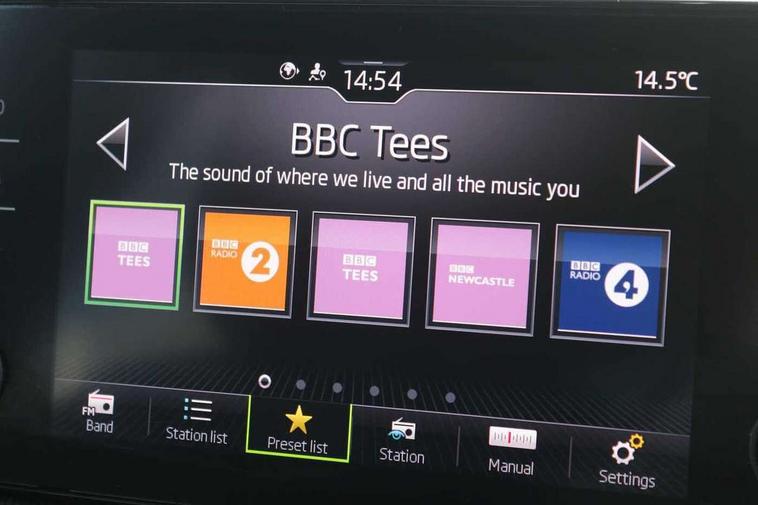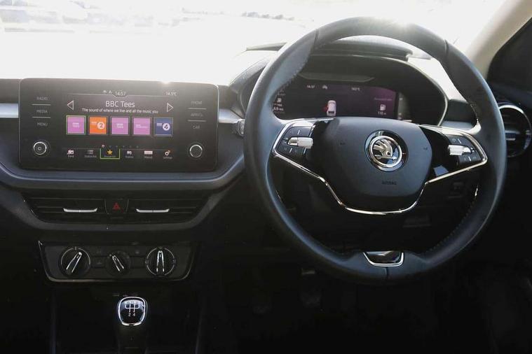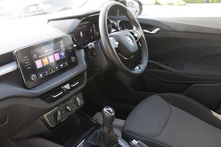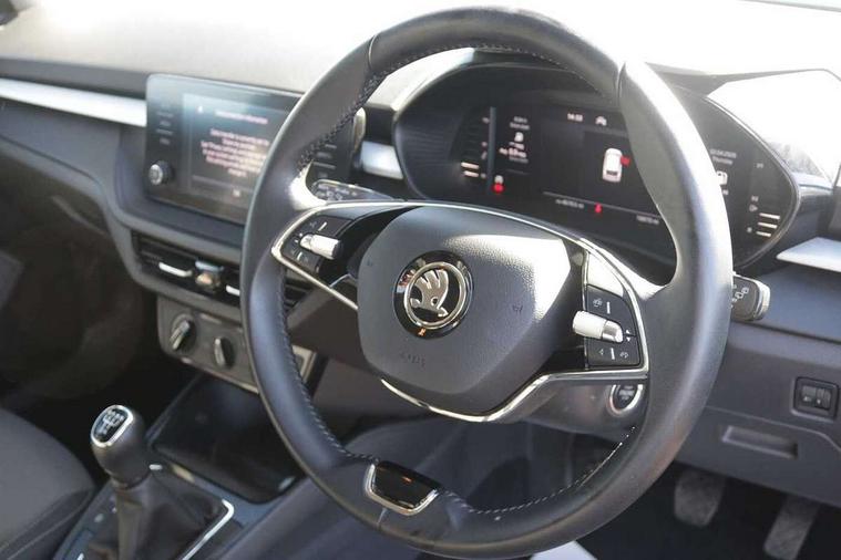 Bluetooth connection, Driver alert system - DAS, Electromechanical power steering, Exterior temperature gauge, Lane assist including road edge detection, Service interval indicator, Virtual cockpit with 10.25" colour display, 2x USB-C in the front (for data transmission and charging), 6 Speakers (4 in front and 2 in rear), Auxiliary socket for external MP3 player, Bolero radio with 8" colour display, DAB digital radio reception, Basic rear lights, Body coloured bumpers, Dimming rear view mirror with black frame, Door mirror integrated indicators, Electrically adjustable and heated door mirrors, Electrically adjustable front windows with function auto up/down, Front window wiper intermittent control, Headlight range control - Automatic, Ice scraper in fuel cap, LED daytime running lights with coming and leaving home feature, Mechanical adjustable rear windows, Privacy glass, Rear LED fog light, Rear side wing doors, Rear window wiper with washing nozzles, Roof colour door mirrors, Roof mounted spoiler, SKODA tailgate lettering in chrome, Third brake light, 3 rear headrests, Backrest split and folding, Central console with fixed cup holder and storage box, Chrome handbrake release button, Fabric upholstery, Gearshift knob/handle in leather, Grain satin black interior door handles, Hand brake lever handle in leather, Height adjustable front headrests, Height adjustable steering wheel, ISOFIX and TopTether anchorage points to the outer rear seats, ISOFIX and TopTether on the front passenger seat, Luggage compartment lighting, Pollen filter, Rear seat bench unsplit, Single front passenger seat, Storm grey headlining, Sun visors with mirror and airbag label on passenger side, Ticket holder, Umbrella in drivers door, 3-point height adjustable front seats belts with pretensioner and force limiter, Automatic warning lights in case of crash, Driver and passengers airbag with switch off function, e-Call+, ESC including ABS, MSR, ASR, EDS, HBA and XDS, Front and rear seat belt warning, FRONT ASSIST (AEB City and AEB Inter Urban), Front side airbags, Head airbags, One tone horn, Pedestrian protection, Three rear 3-points safety seat belts with pretensioner and force limiter including stop function for outer rear seat belts, Tyre pressure monitoring system, Anti-theft alarm system including immobiliser, interior monitoring, backup horn, and towing protection, Anodized cross line upper decorative trim, Colour Edition air vents, Grain satin black central console cover, Grain satin black lower decorative trim, Satin black door and side trim panel in front, Anti-theft wheel bolts protection, Super-low rolling resistance tyres,